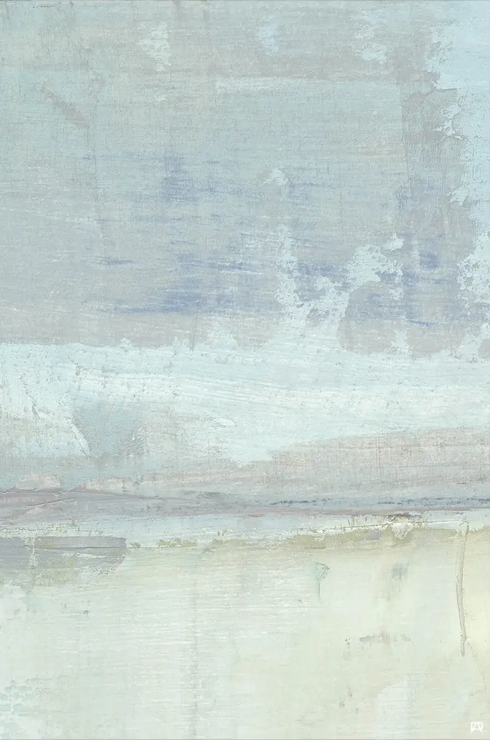 The paint application varies across the canvas, showing areas of thicker texture. Horizontal bands in the colors suggest a calm sea meeting a misty sky.