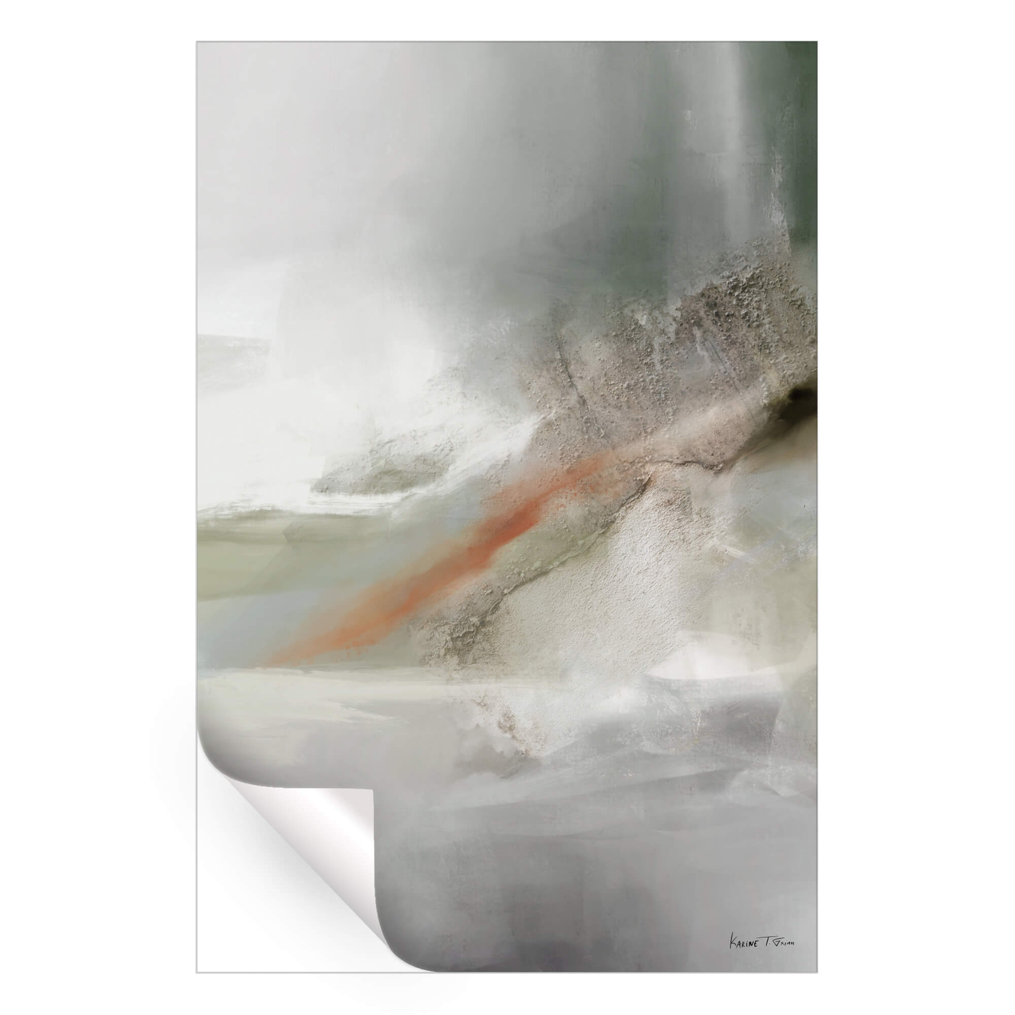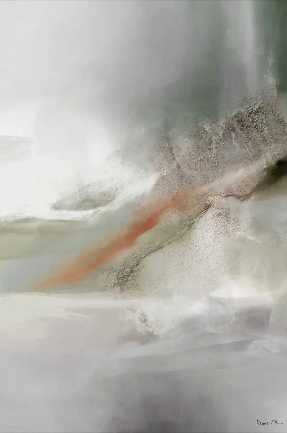 A smoky haze envelops the composition, with a solitary stroke of orange cutting through the cool grays and whites like a sudden flame. The textures and subdued palette evoke the feeling of a memory fading into obscurity, while the orange offers a fleeting anchor—a moment of clarity in the quiet murk.