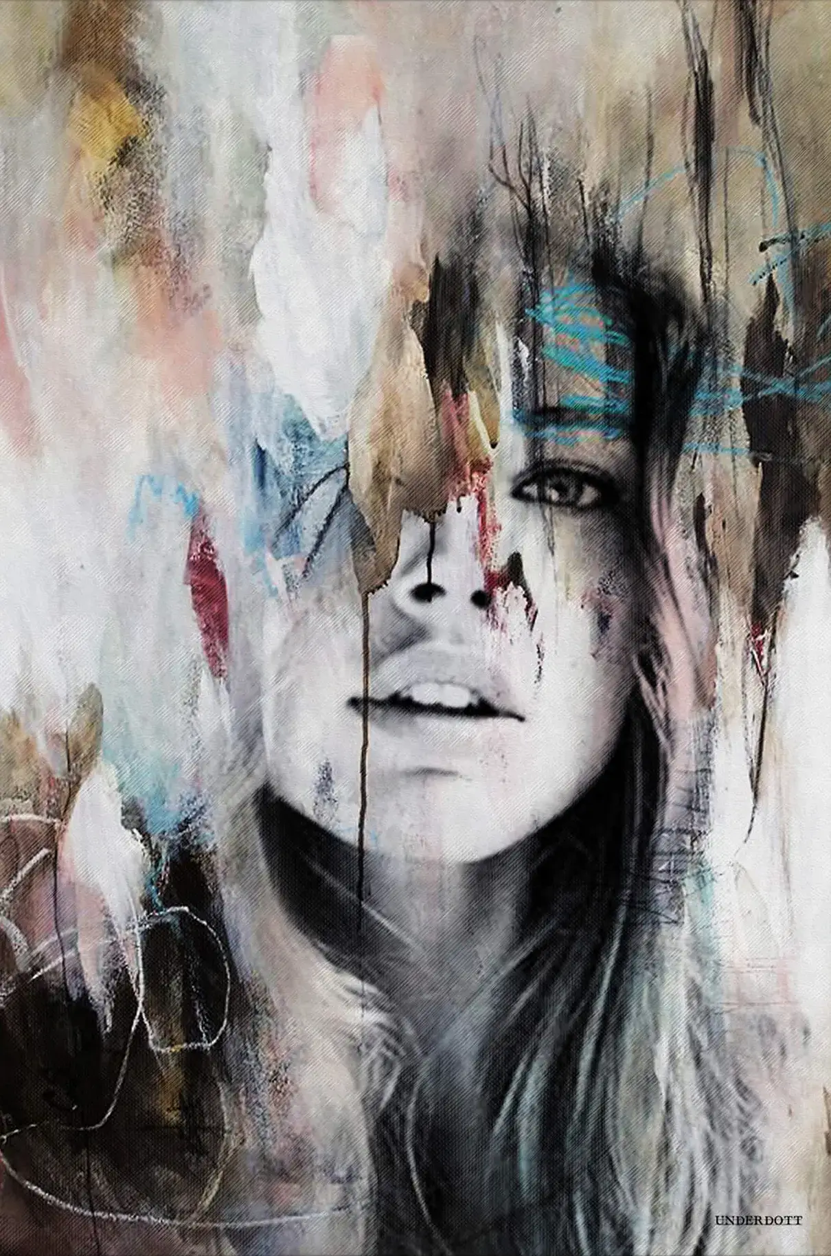 Abstract and emotionally charged, a fragmented visage of a person draws the eye of the viewer. One eye of the subject is clear and detailed, creating a focal point amid the surrounding abstraction.