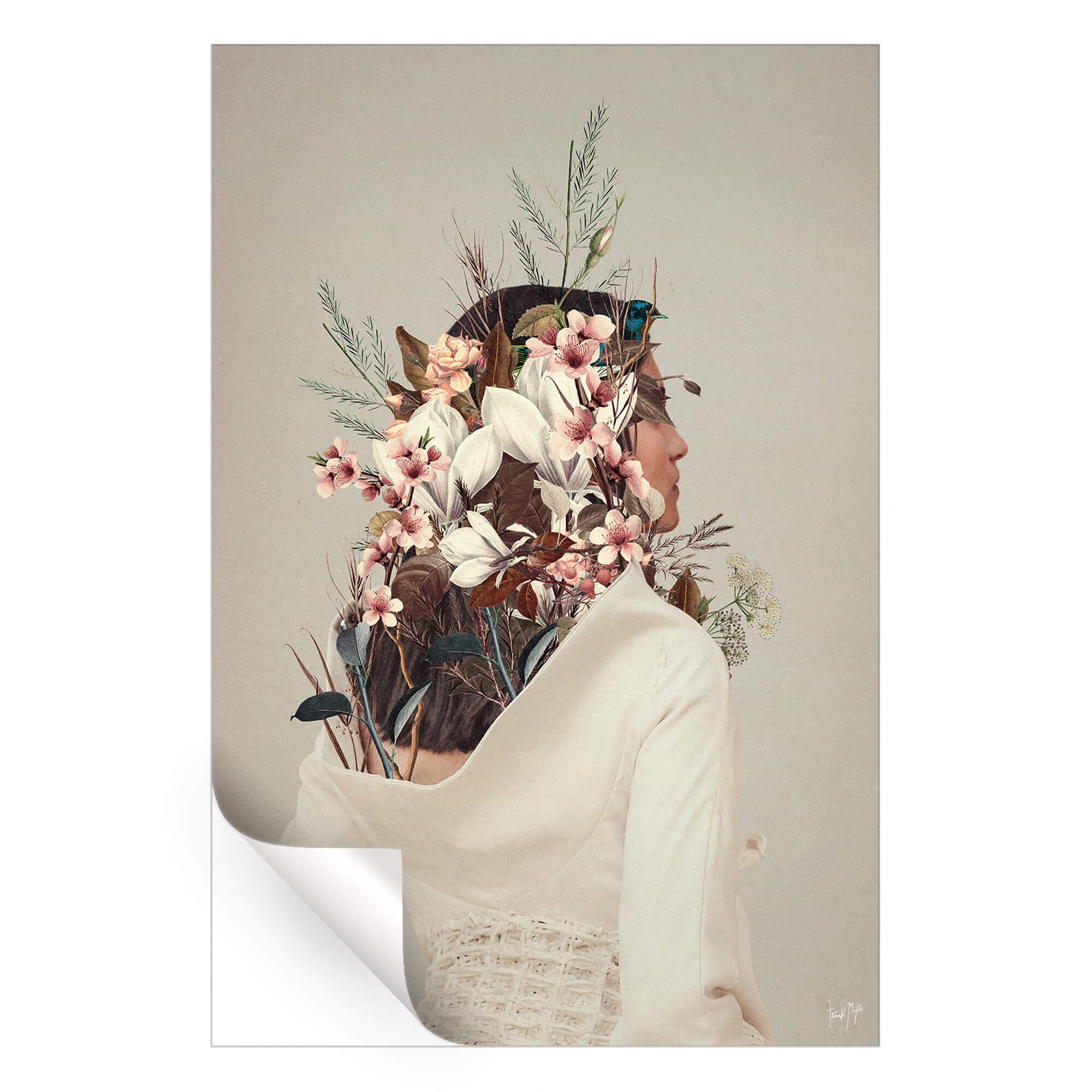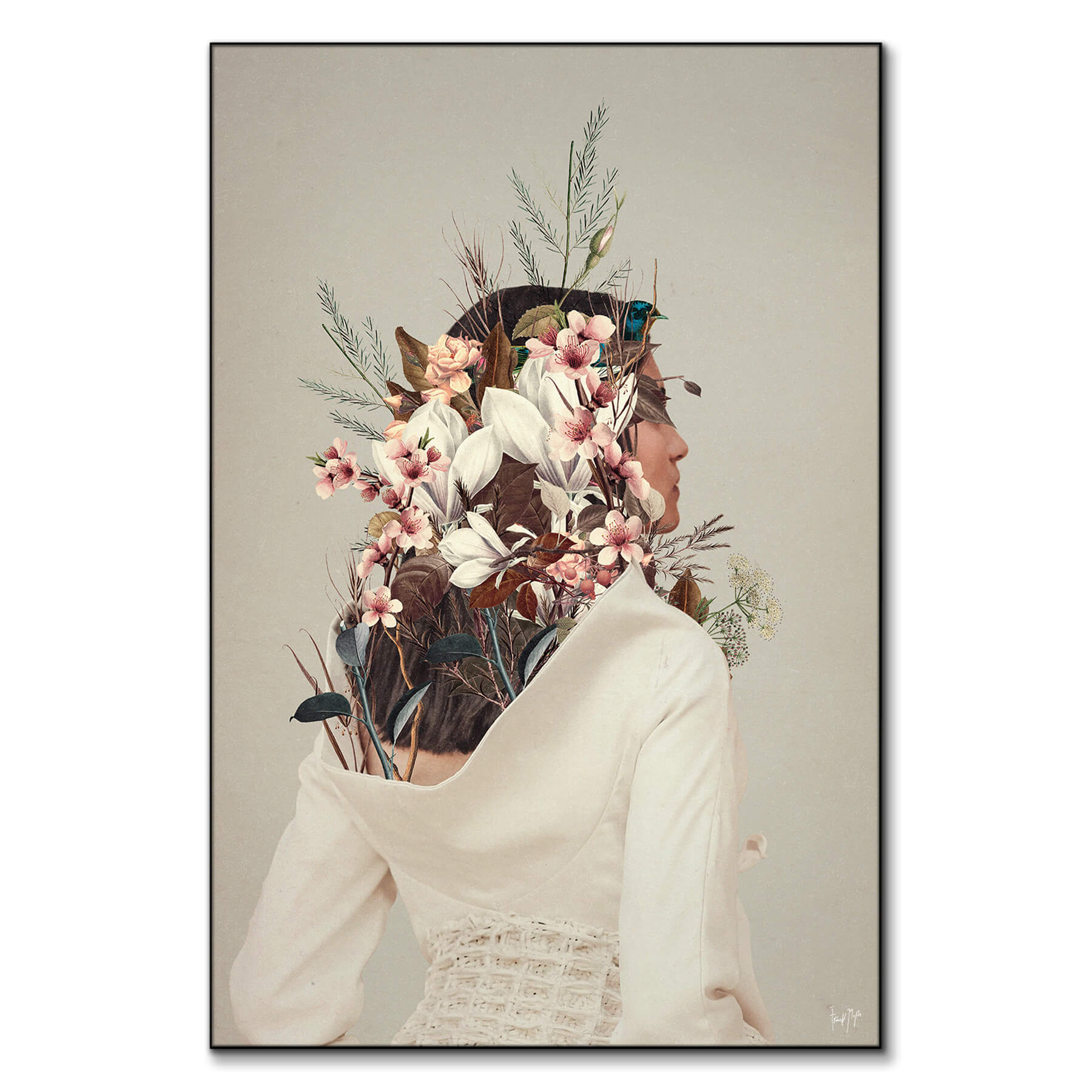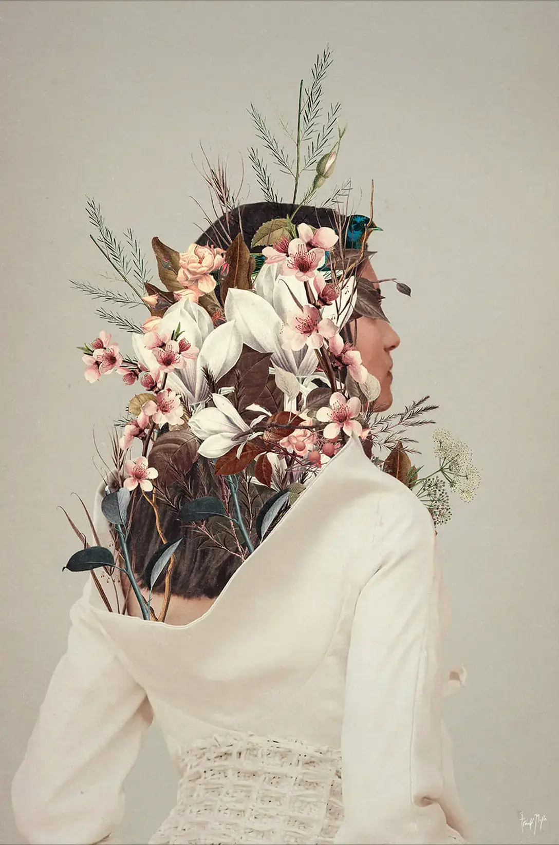 This elegant composition fuses fashion photography with botanical surrealism. A woman in soft ivory turns away, her hair blossoming into a cascade of flowers and leaves that spill down her back. The neutral background enhances the delicacy of the floral arrangement, creating a sense of calm and introspection.