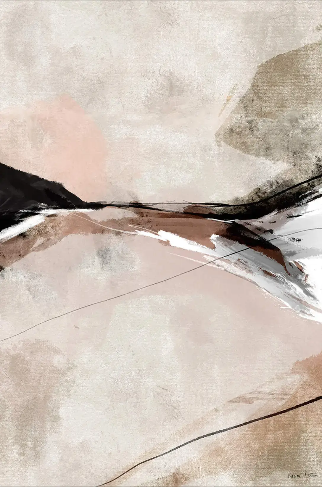 Earthy tones meld together in an abstract landscape, where delicate lines carve pathways through fields of blush, taupe, and charcoal. These strokes create a sense of structure within the softness, a map of color and form. The interplay of light and dark, of the fleeting and the defined, evokes the contours of a terrain viewed from high above.