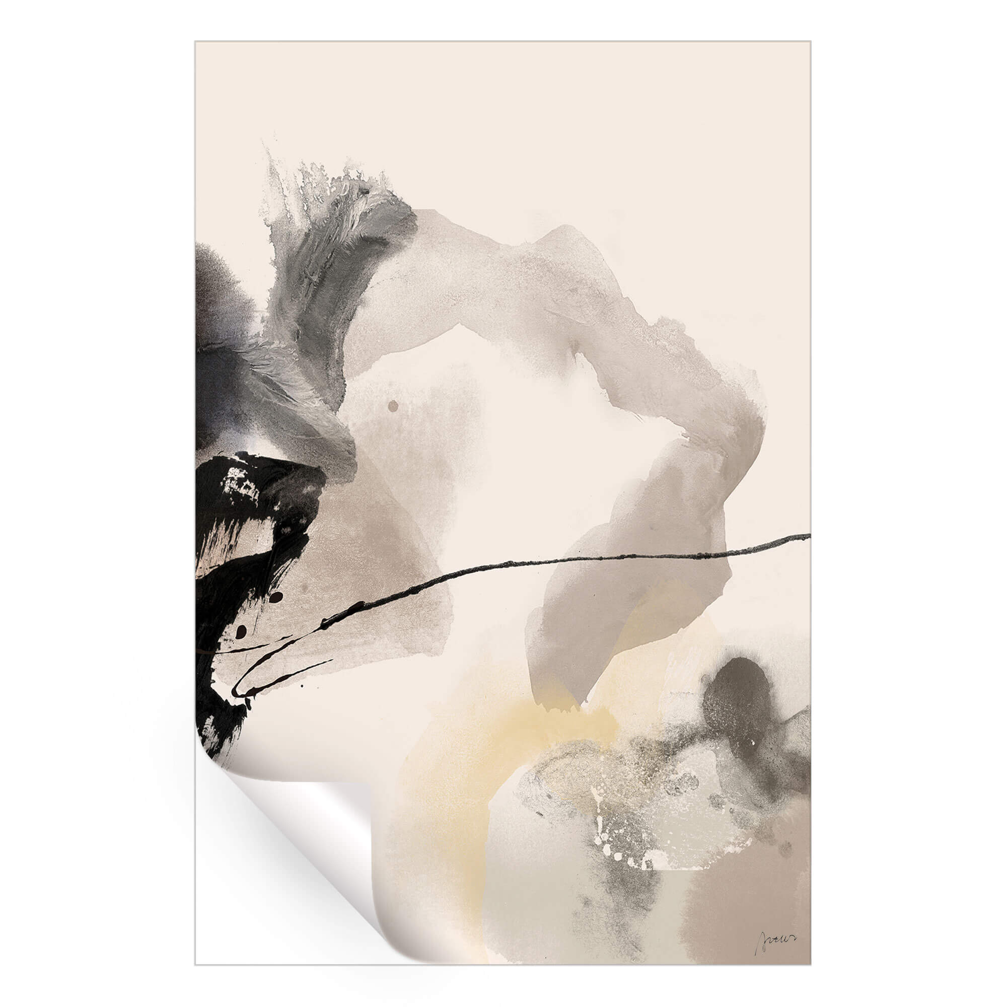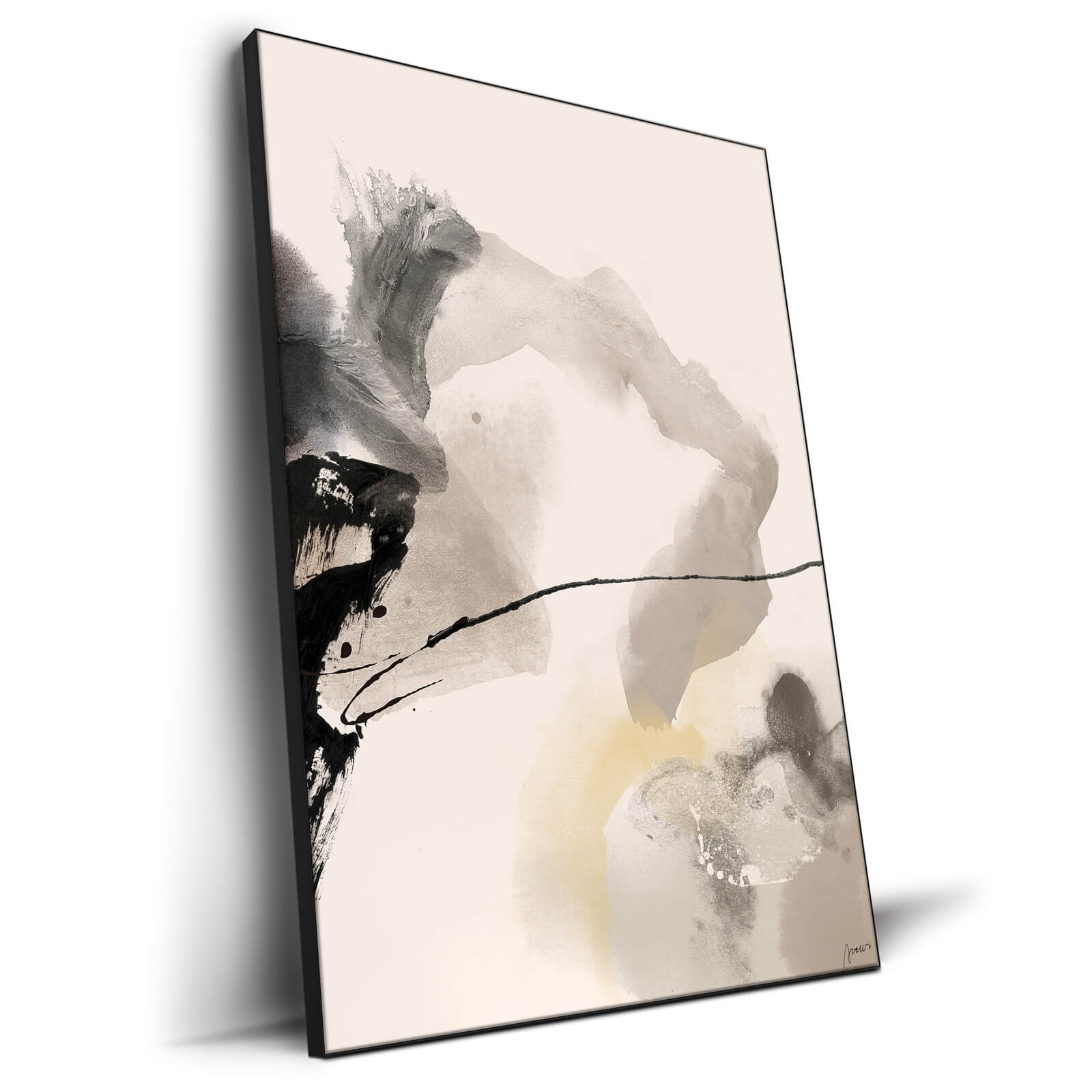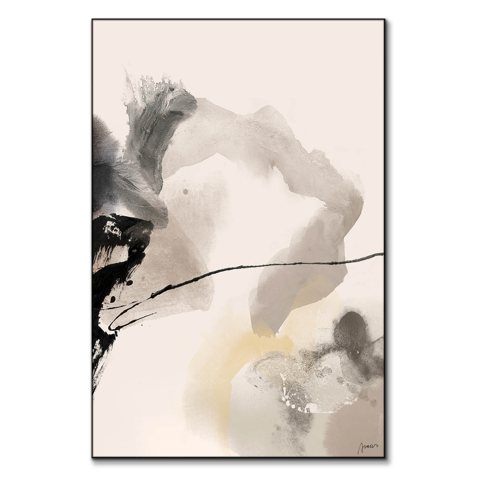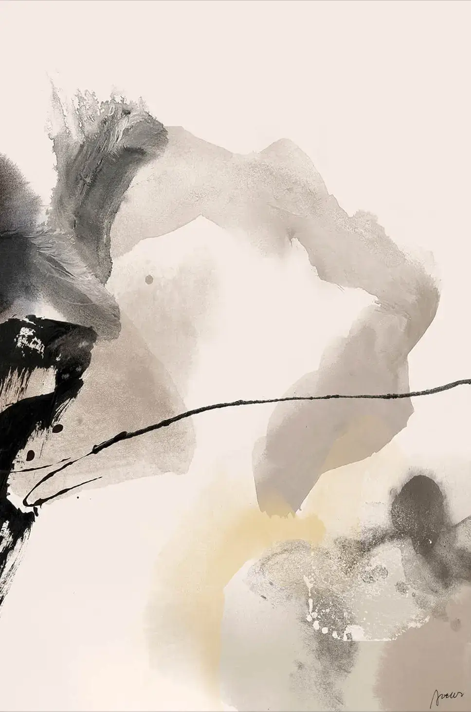 Billowing forms in shades of soft grey and faint beige appear to be caught in a dynamic flow across the piece, as if shaped by a gentle but persistent wind. A bold stroke of black anchors the composition. This stroke offers a stark counterpoint to the otherwise ethereal quality of the lighter elements. The textures vary from fluid, watercolor-like washes to denser, more concentrated hues, adding a tactile dimension to the visual experience.