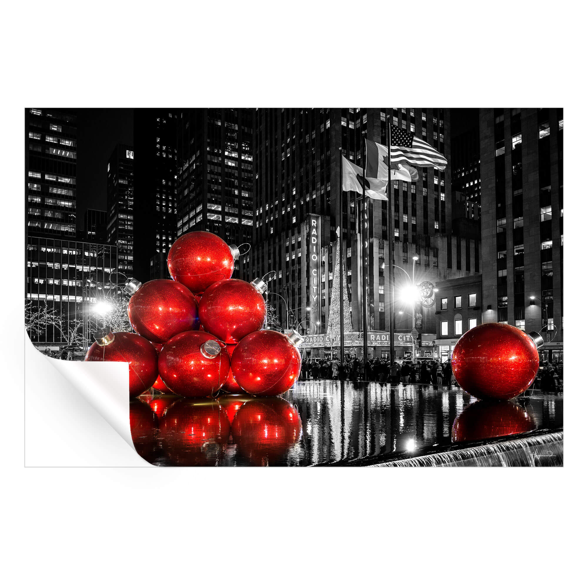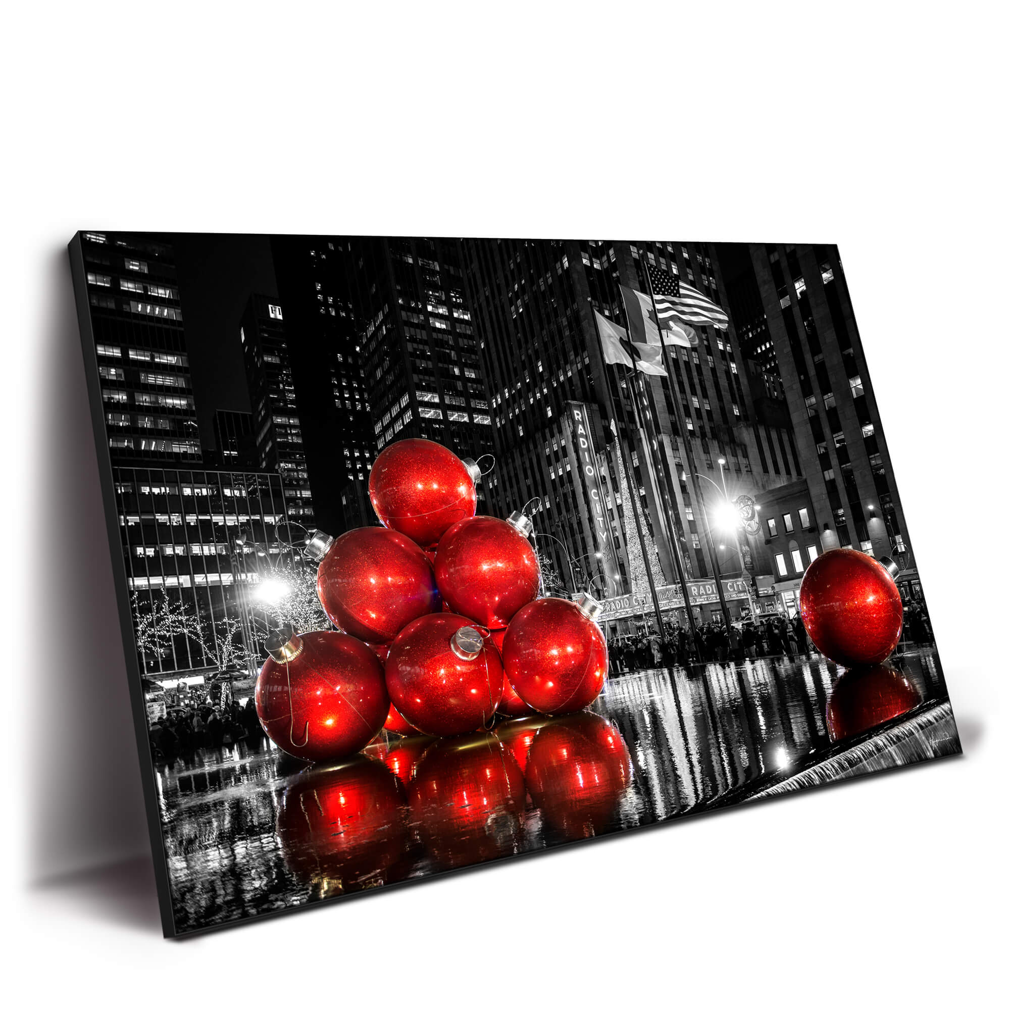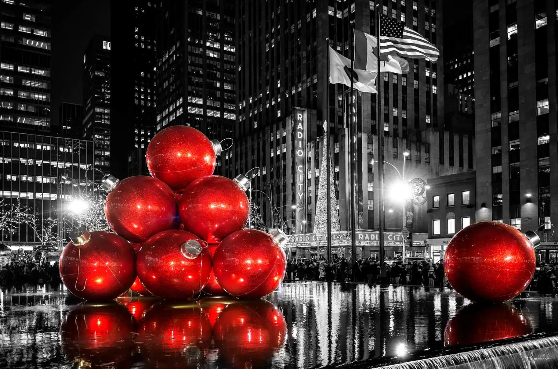 This vivid photograph presents a captivating contrast of color against the grayscale backdrop of New York City’s urban landscape. A cluster of oversized, shiny red Christmas bulbs provides a pop of color, reflecting the city lights and creating a stunning visual focal point.