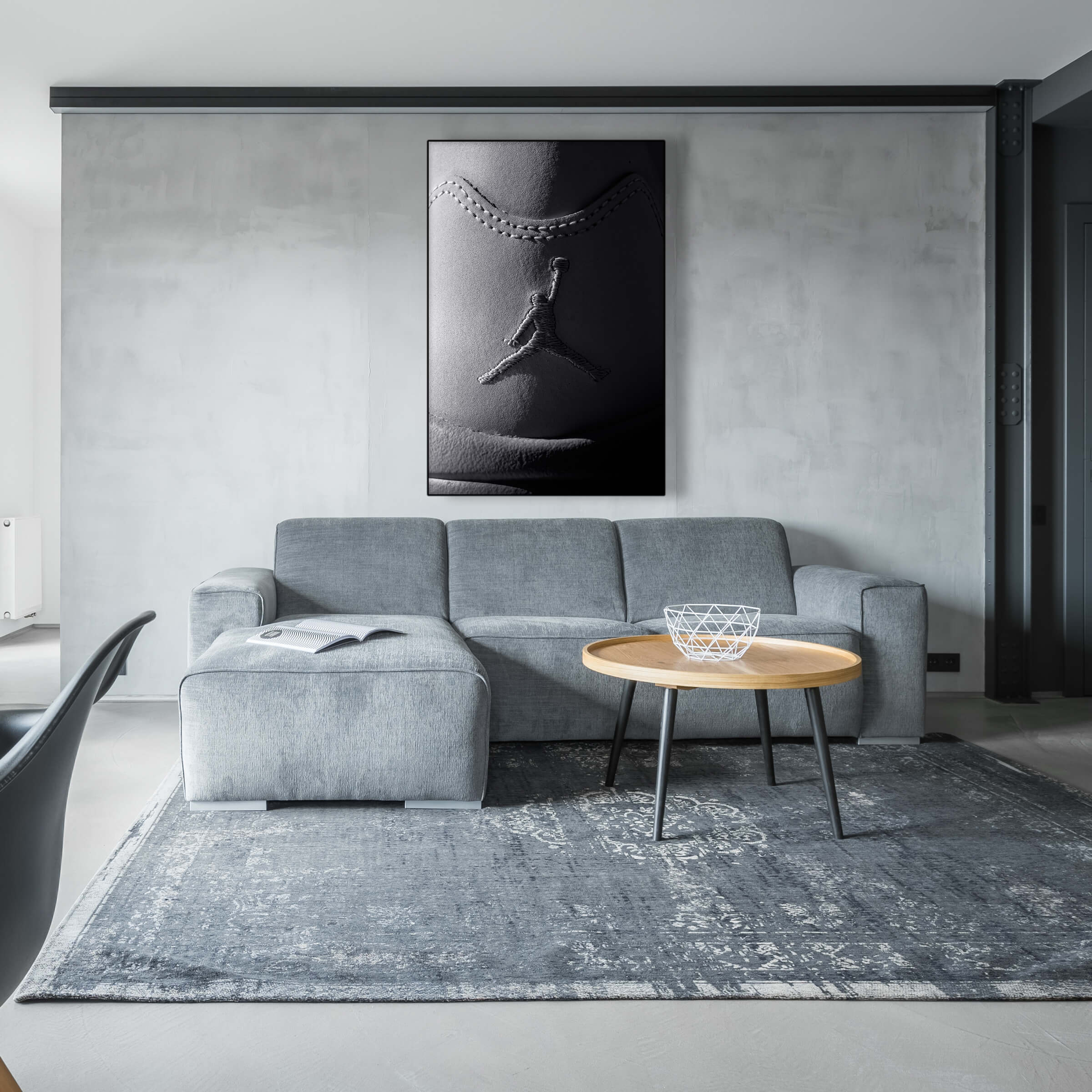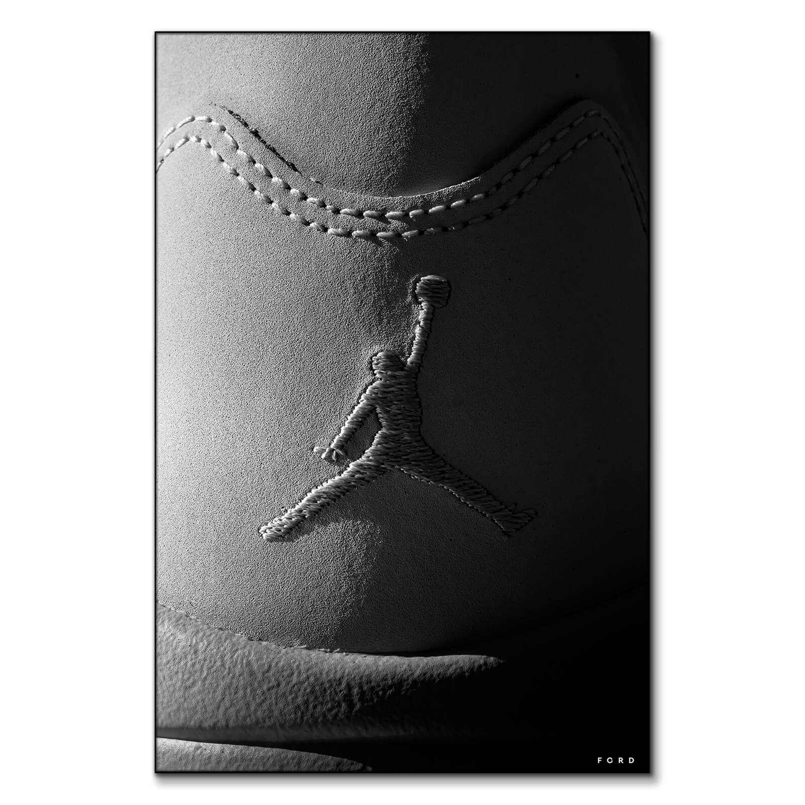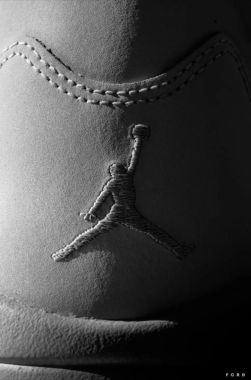 Embossed on a textured surface is the iconic silhouette of a basketball player mid-jump, ball in hand, known as the Jumpman logo. The stitching around the logo forms two swooping curves that frame it, catching the light and casting shadows that emphasize the figure’s dynamic motion. This classic emblem is synonymous with a famous line of sports shoes, representing both the athleticism and cultural impact of its namesake.