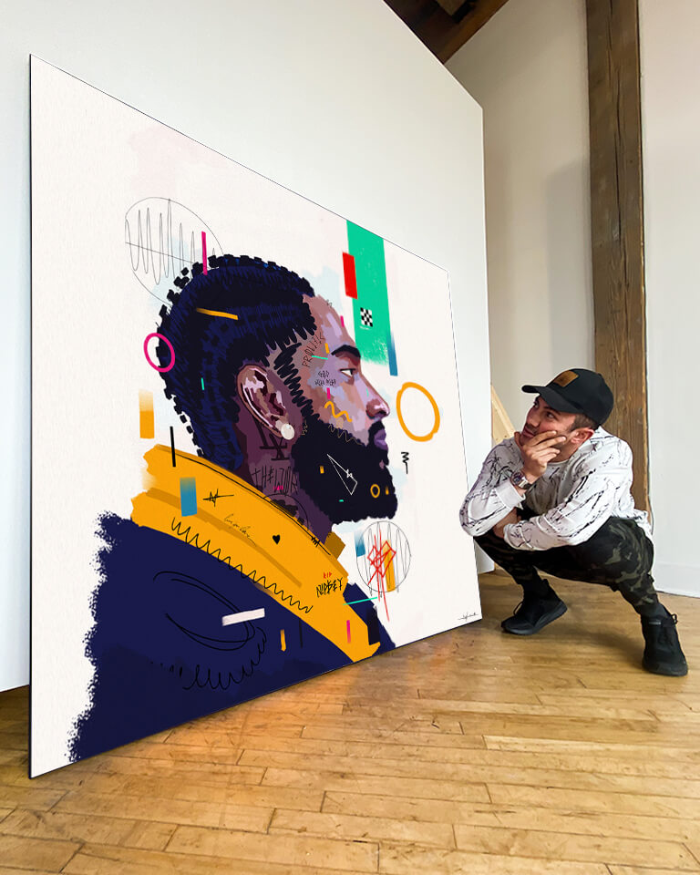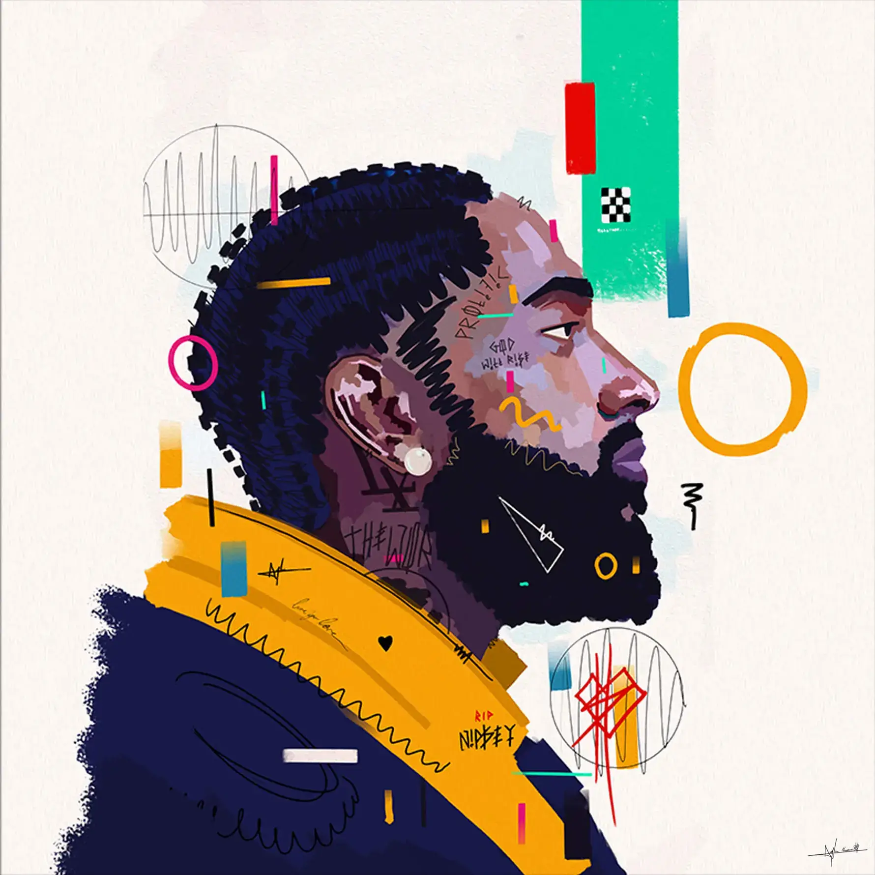 The digital painting captures a profile view of Nipsey Hussle, portrayed with a contemplative expression. He is composed of a mosaic of colors, set against a backdrop of abstract geometric shapes and symbols that add an artistic depth to the portrait. There’s a sense of homage in the details, such as the “RIP Nipsey” inscription on his jacket, which, along with the modern and graphic style, pays tribute to his legacy as an artist and community figure.