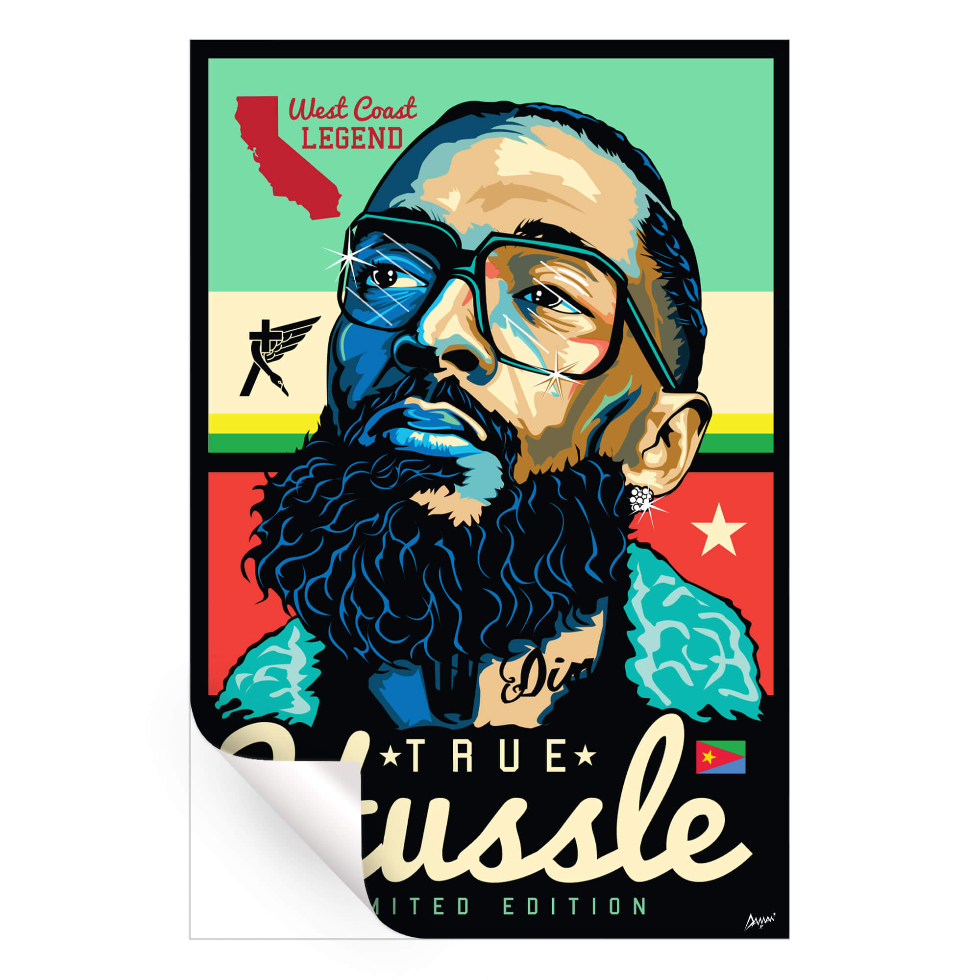 Bold colors and intricate designs, along with the words “True Hussle,” underscore his impact on music and community empowerment. This limited edition piece is a powerful homage to a man who lived his truth with relentless hustle.