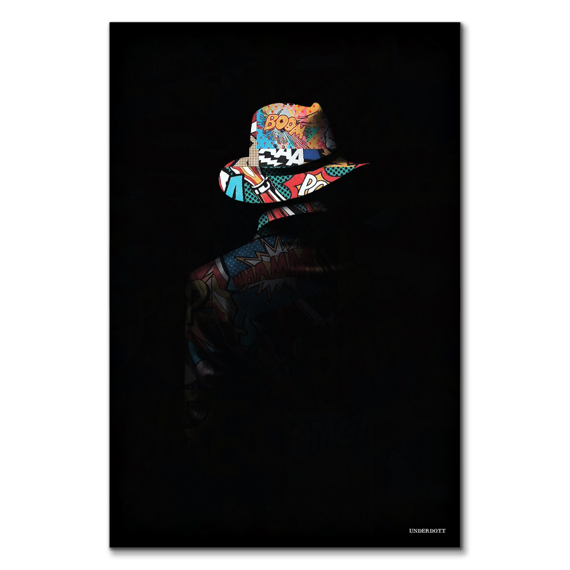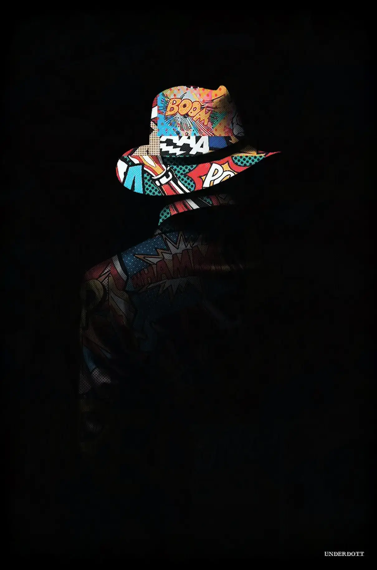 Intricate mosaics of vibrant, comic book style pop art patterns wrap around a figure shrouded in darkness. These patterns are bold and colorful, featuring onomatopoeic words, alongside shapes and dots that emulate the Ben-Day dot printing process.