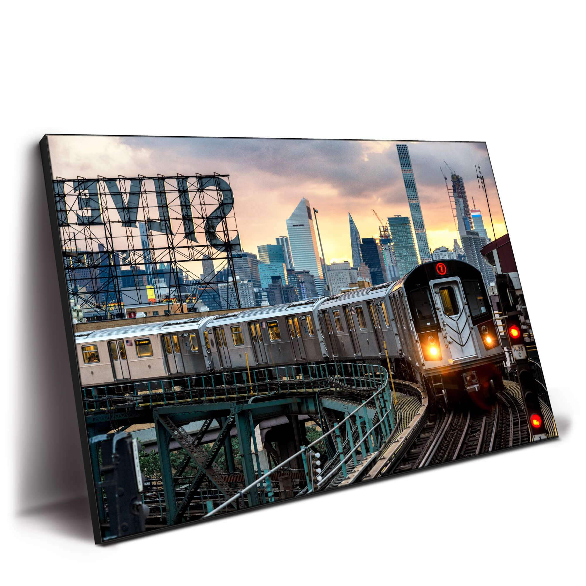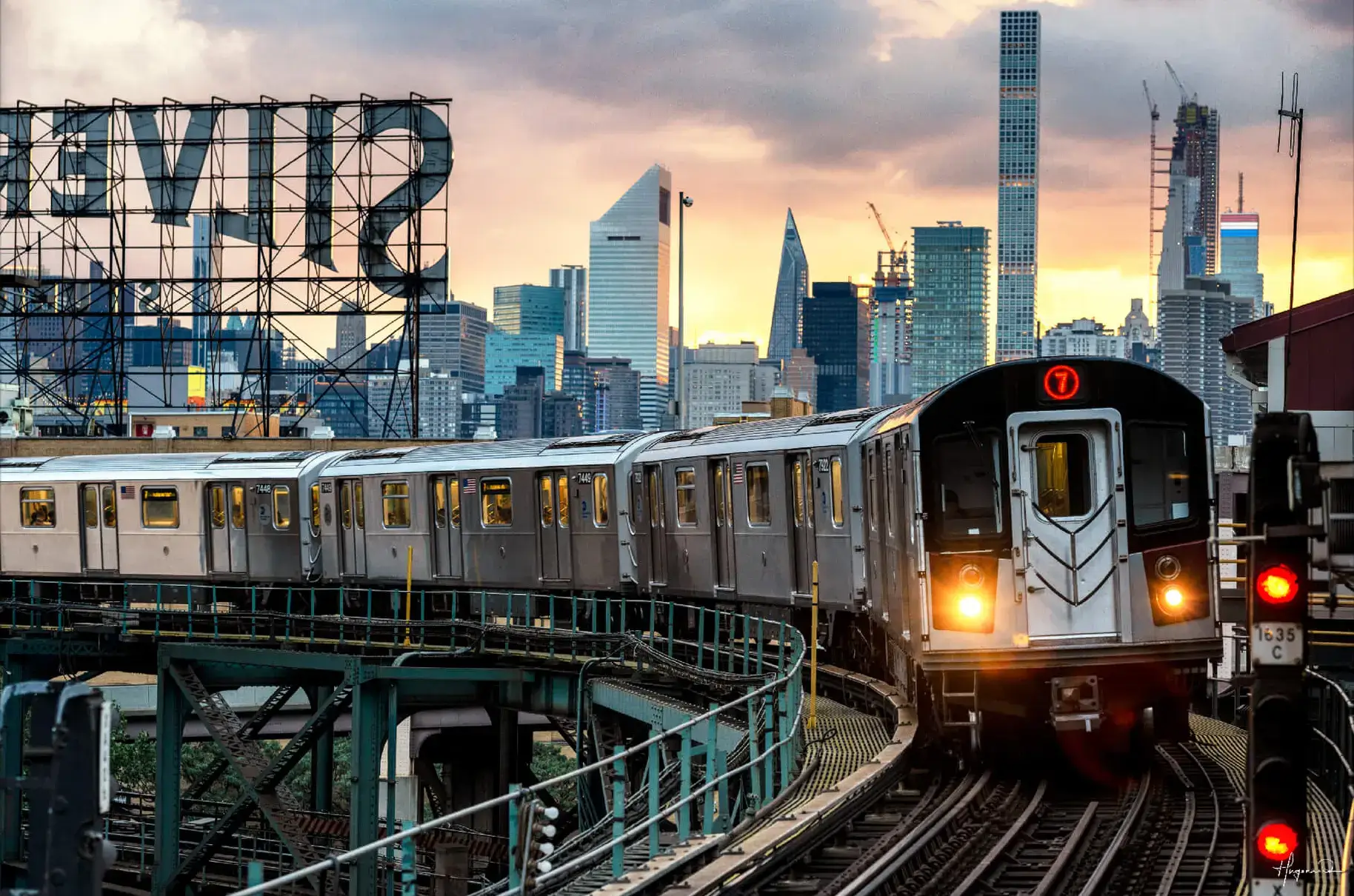A New York City subway train curving along the elevated tracks during sunset. The warm glow of the sun casts vibrant colors across the sky, highlighting the iconic urban landscape.