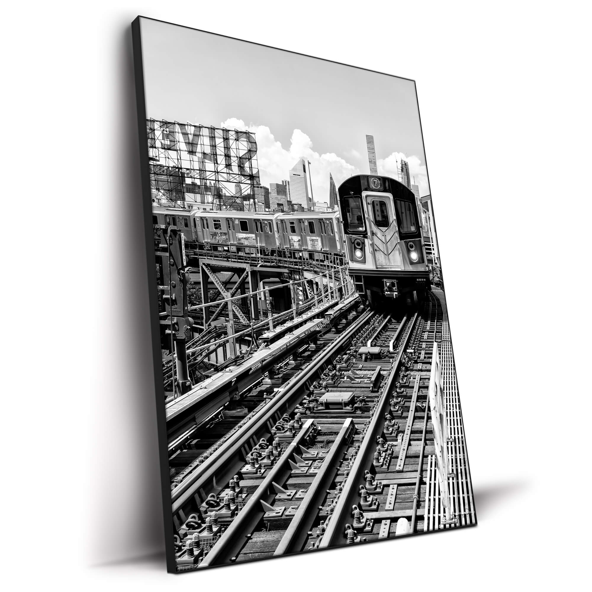 The photograph is a monochromatic depiction of the New York City metro, with a focus on an approaching train on the elevated tracks.