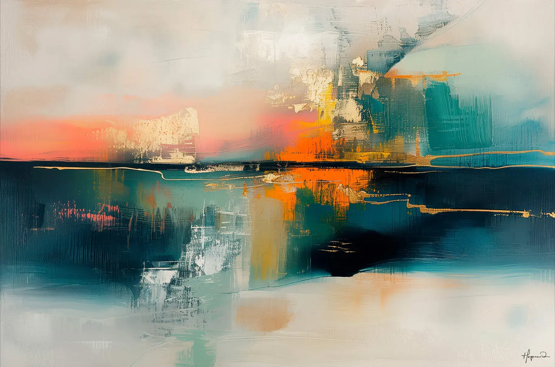 Soft coral and peach tones blend into deep teal and rich blue, moving across the piece in smooth layers. A streak of orange runs through the center, creating a bold contrast that feels almost like glowing light cutting through color. The tones shift gradually, from airy warmth into deeper, moodier blues, giving the artwork depth without defining a specific scene. Texture changes as you look closer, from soft blended areas to sharper strokes, adding interest without crowding the composition.
