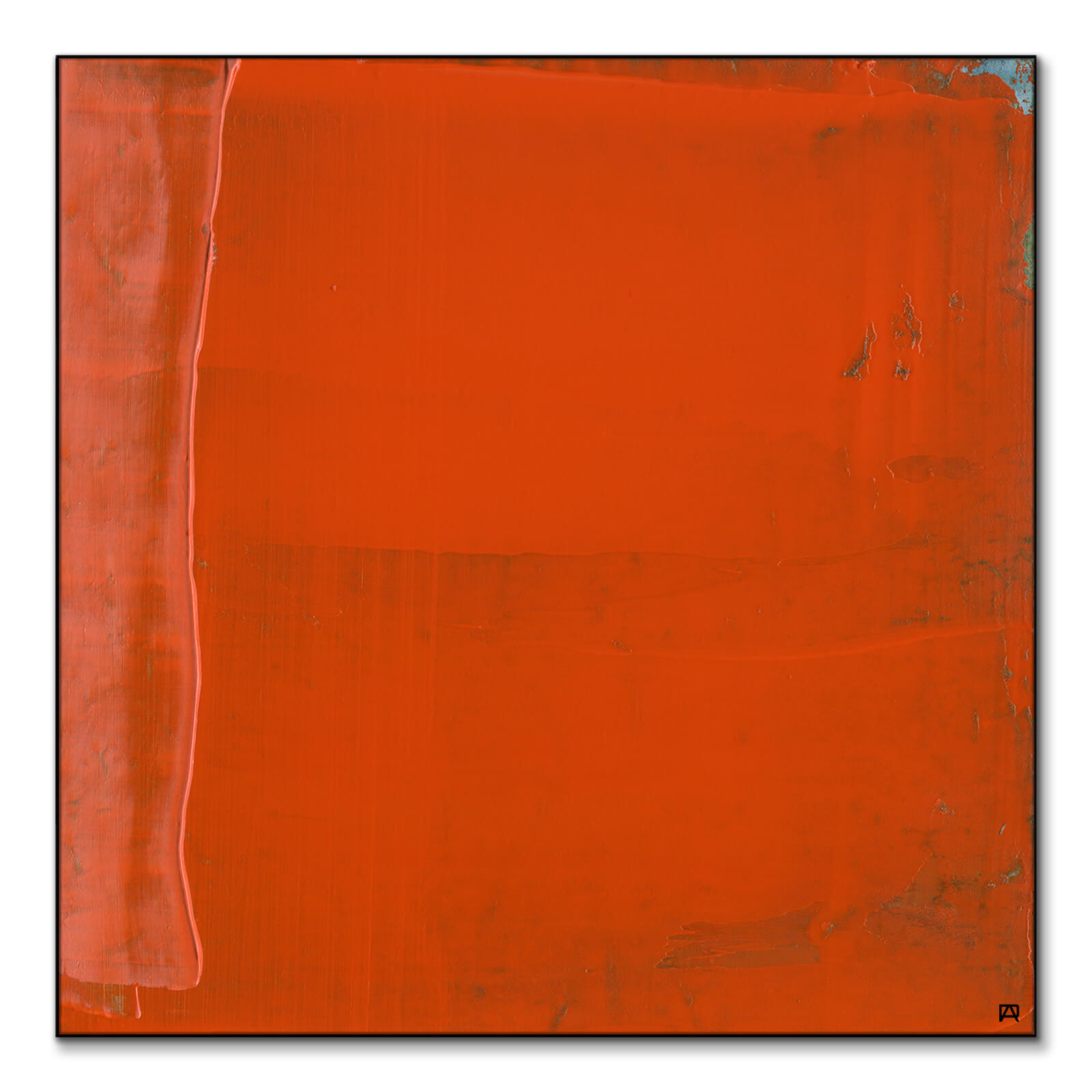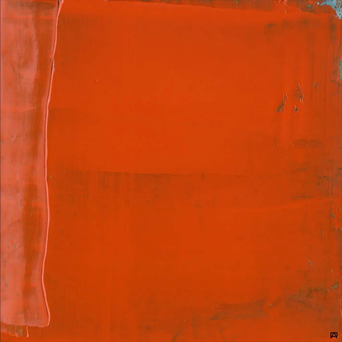 Dominated by a bold, orange-red color, this abstract painting is minimalistic with a strong emphasis on color and texture.