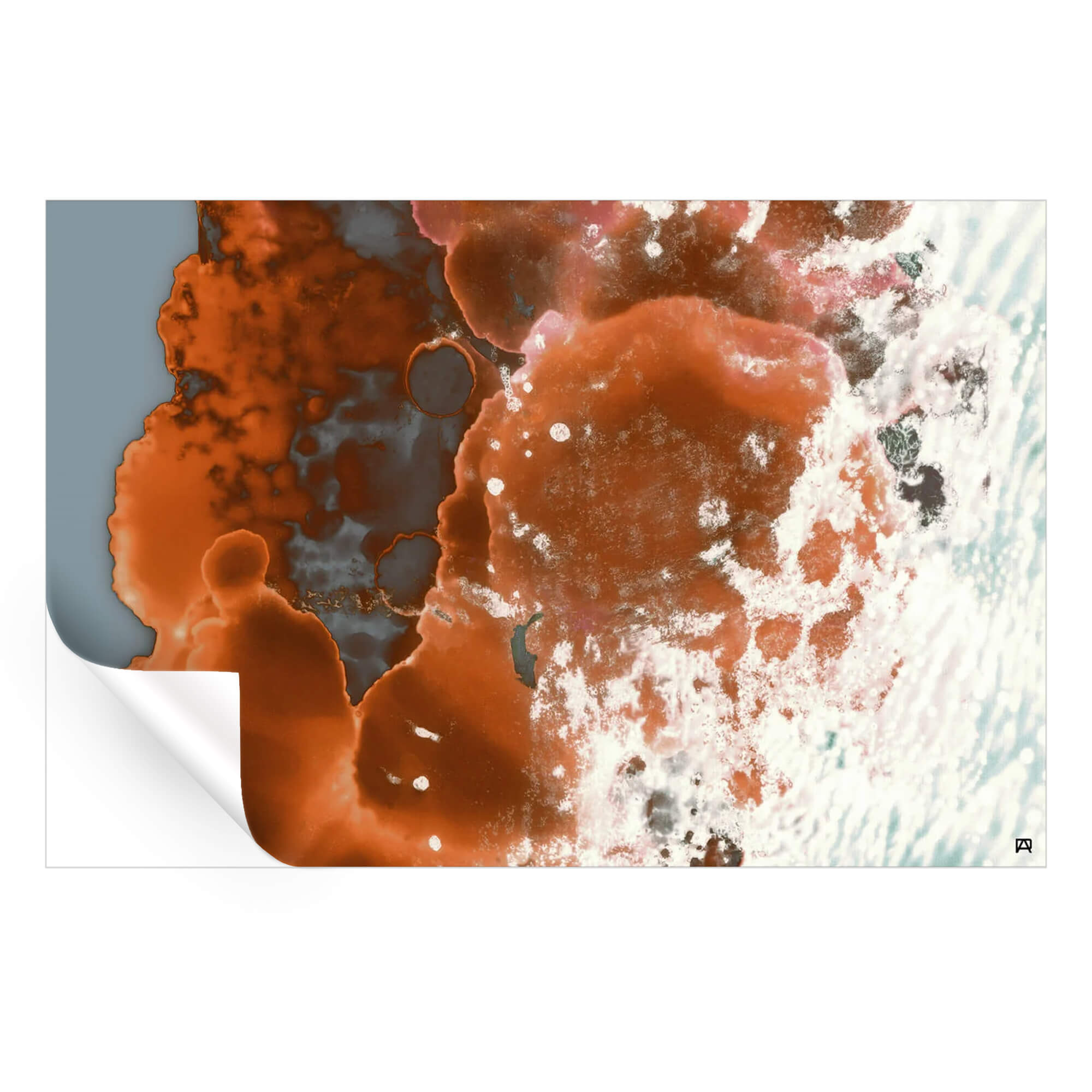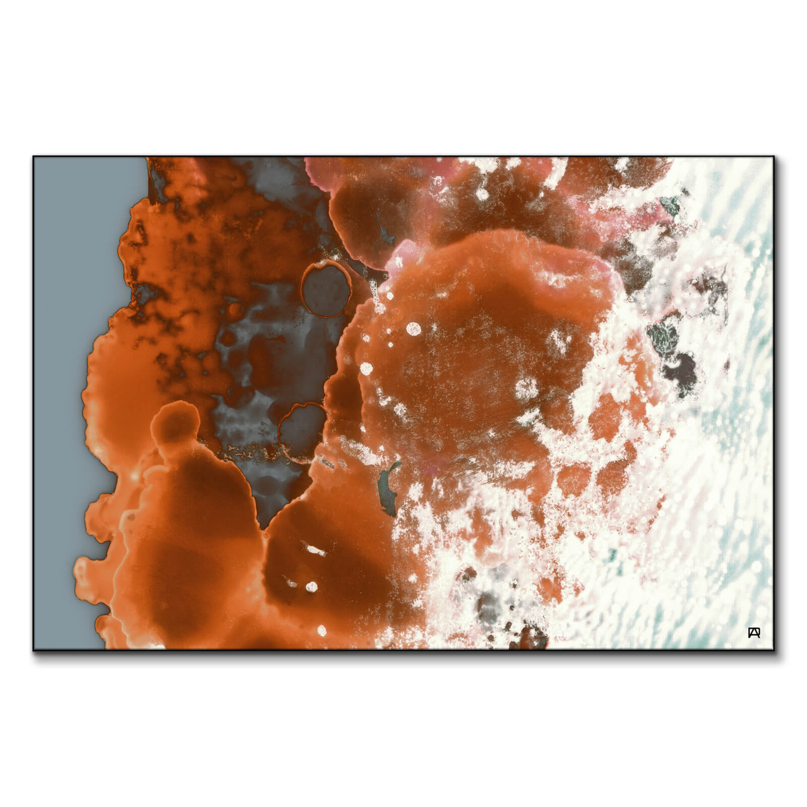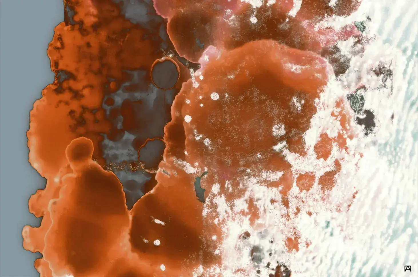 Resembling microscopic imagery, this orange and white abstract ink art features a warm rust with copper tones that transition into cooler hues of slate and white.
