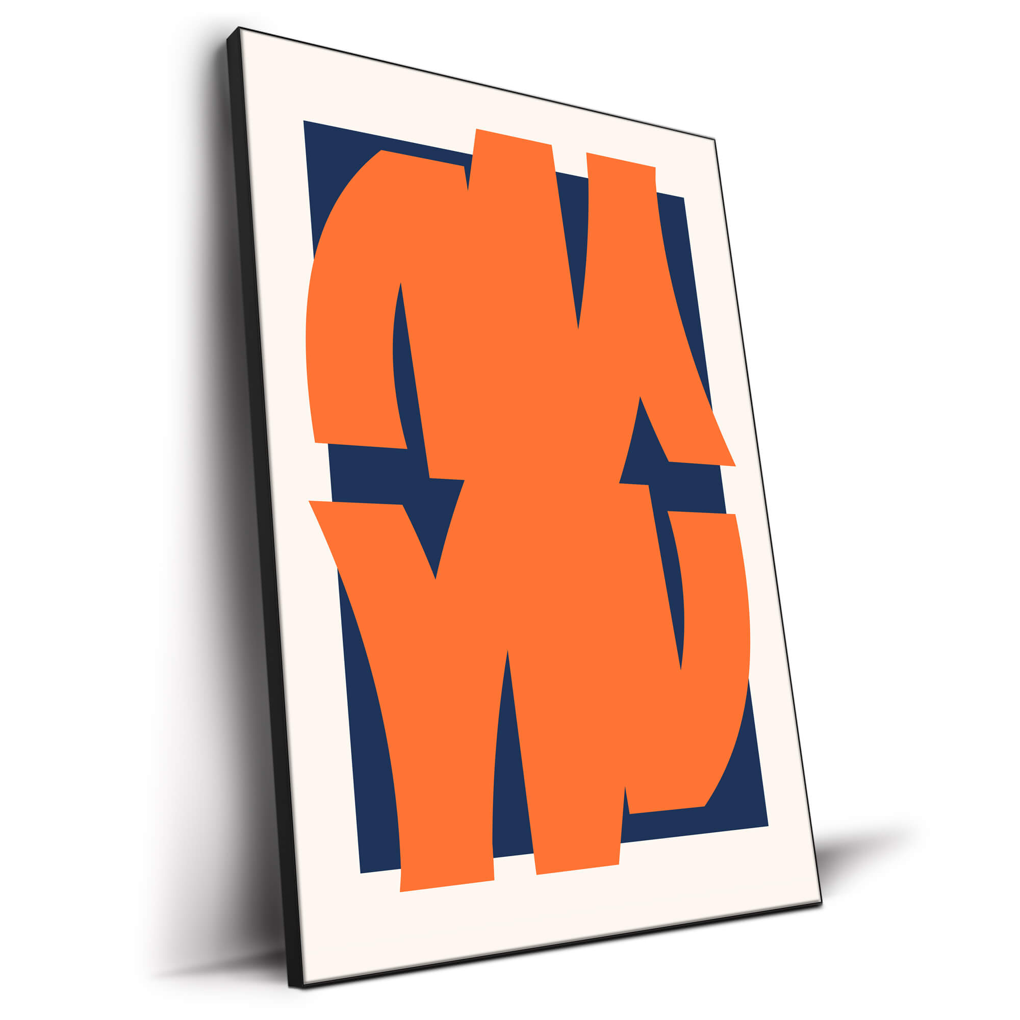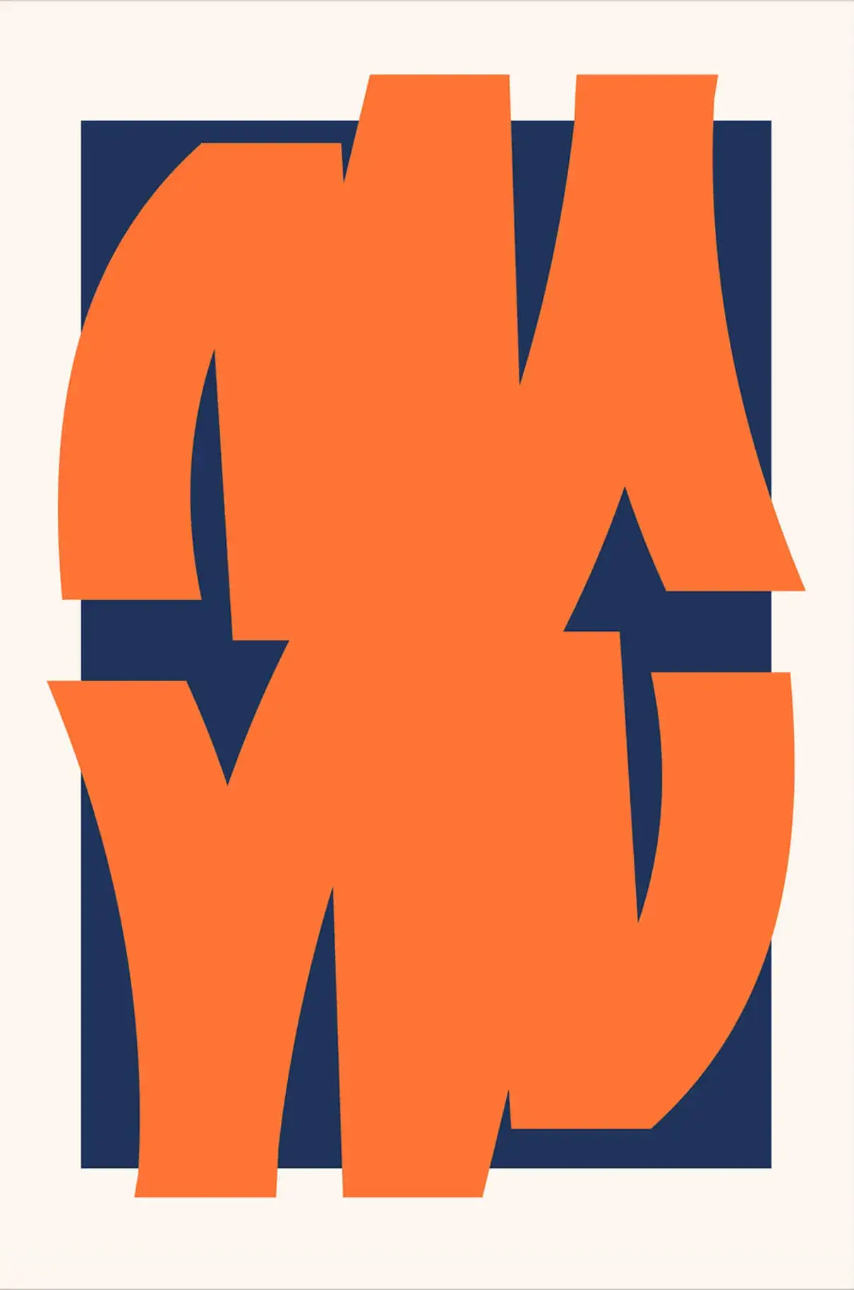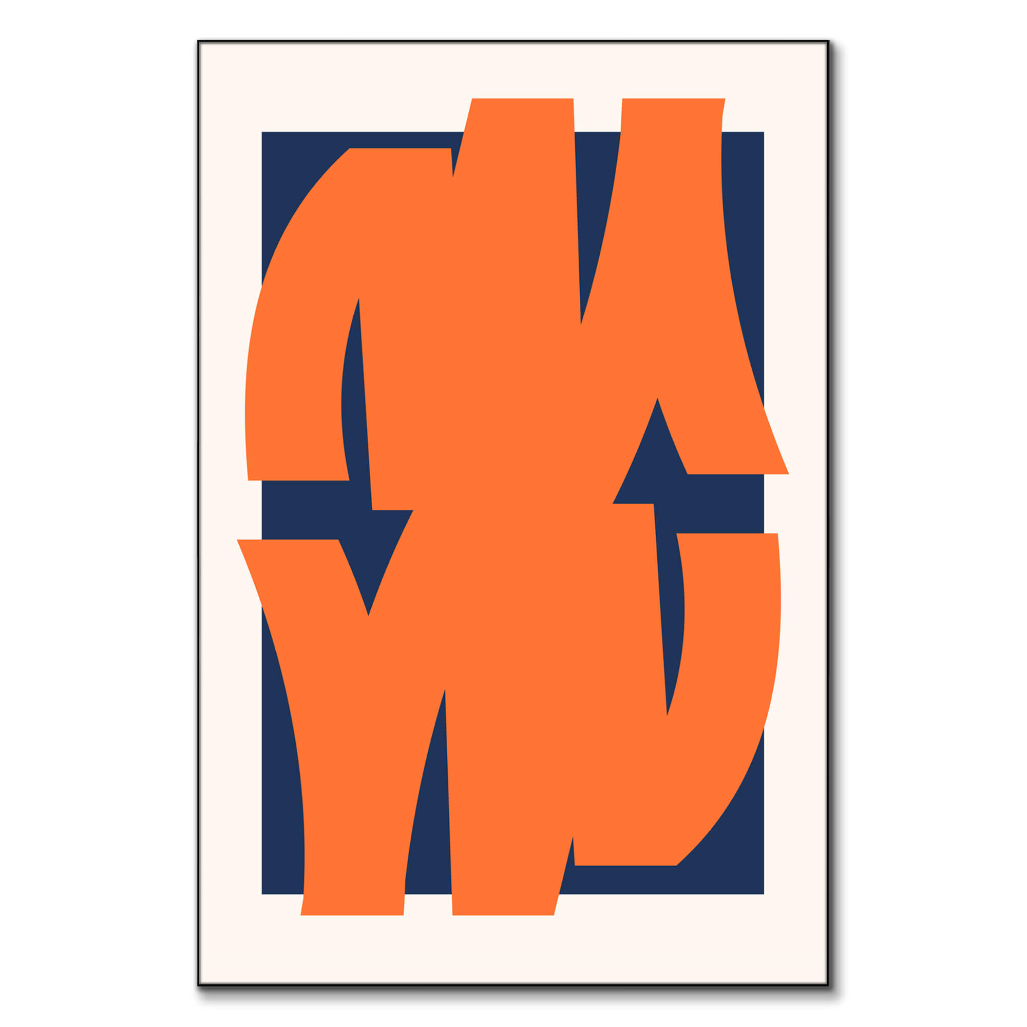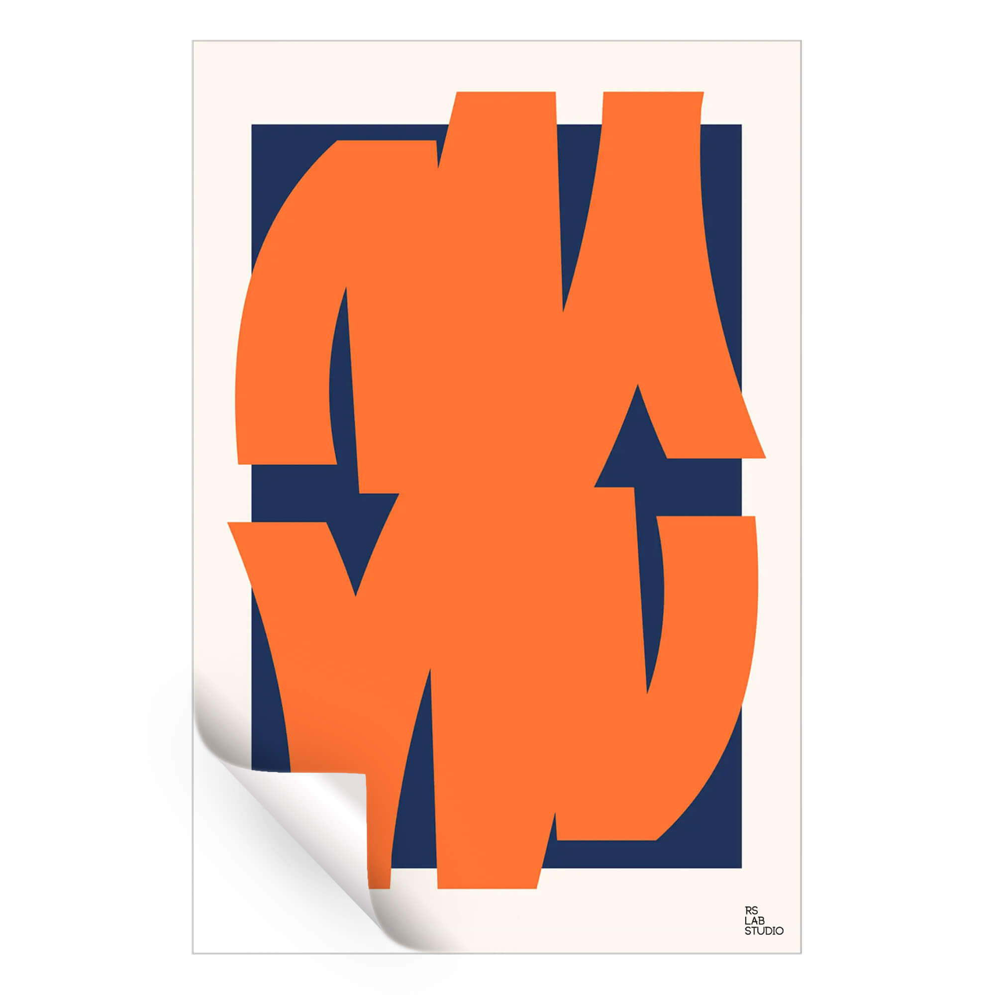 Bold interlocking shapes are featured in vivid orange set against a deep blue background. The abstract design evokes energy and movement while maintaining a sophisticated edge.