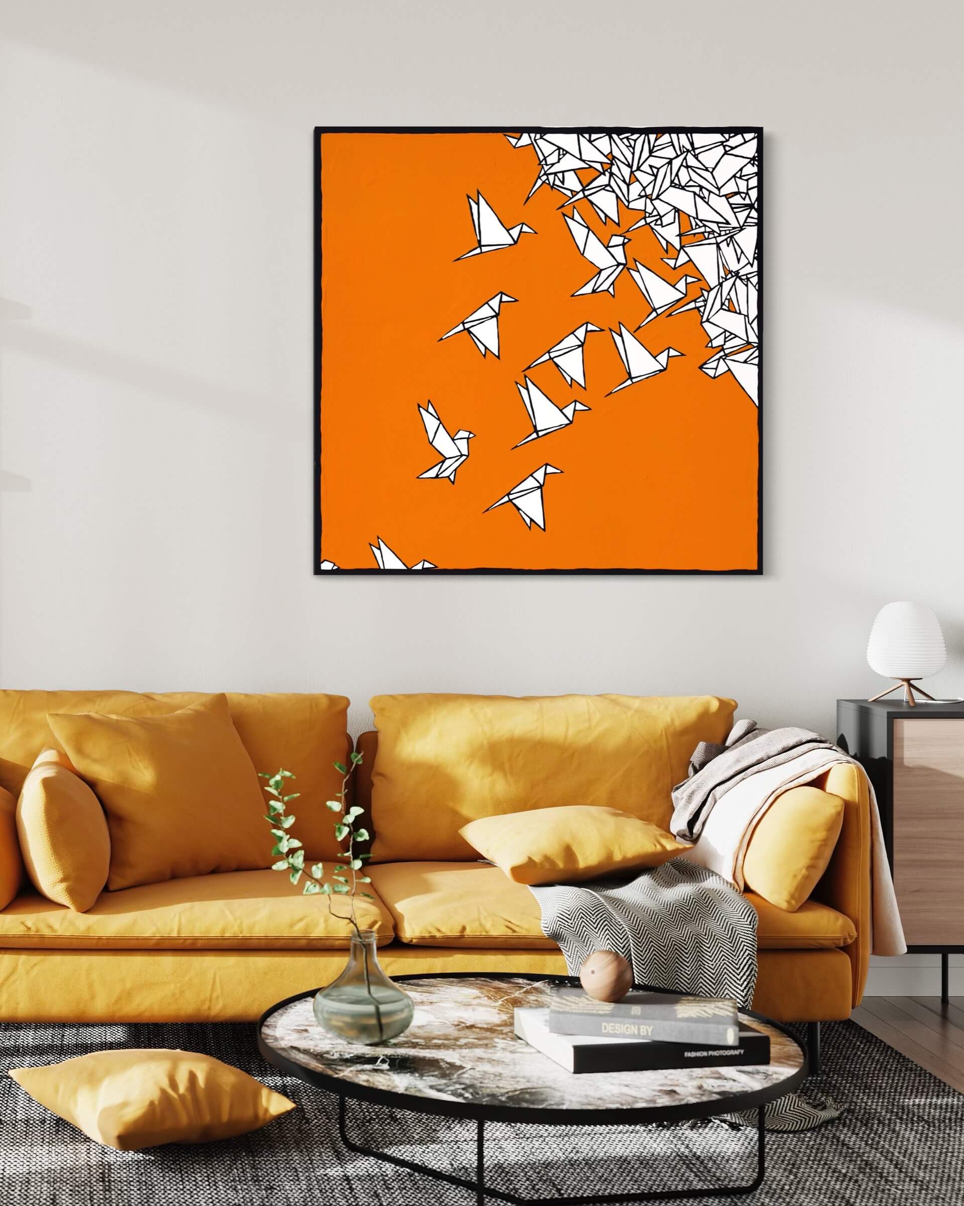 The painting employs a stark contrast between the white birds and the orange backdrop, emphasizing the origami figures. A jagged black border encases the scene.