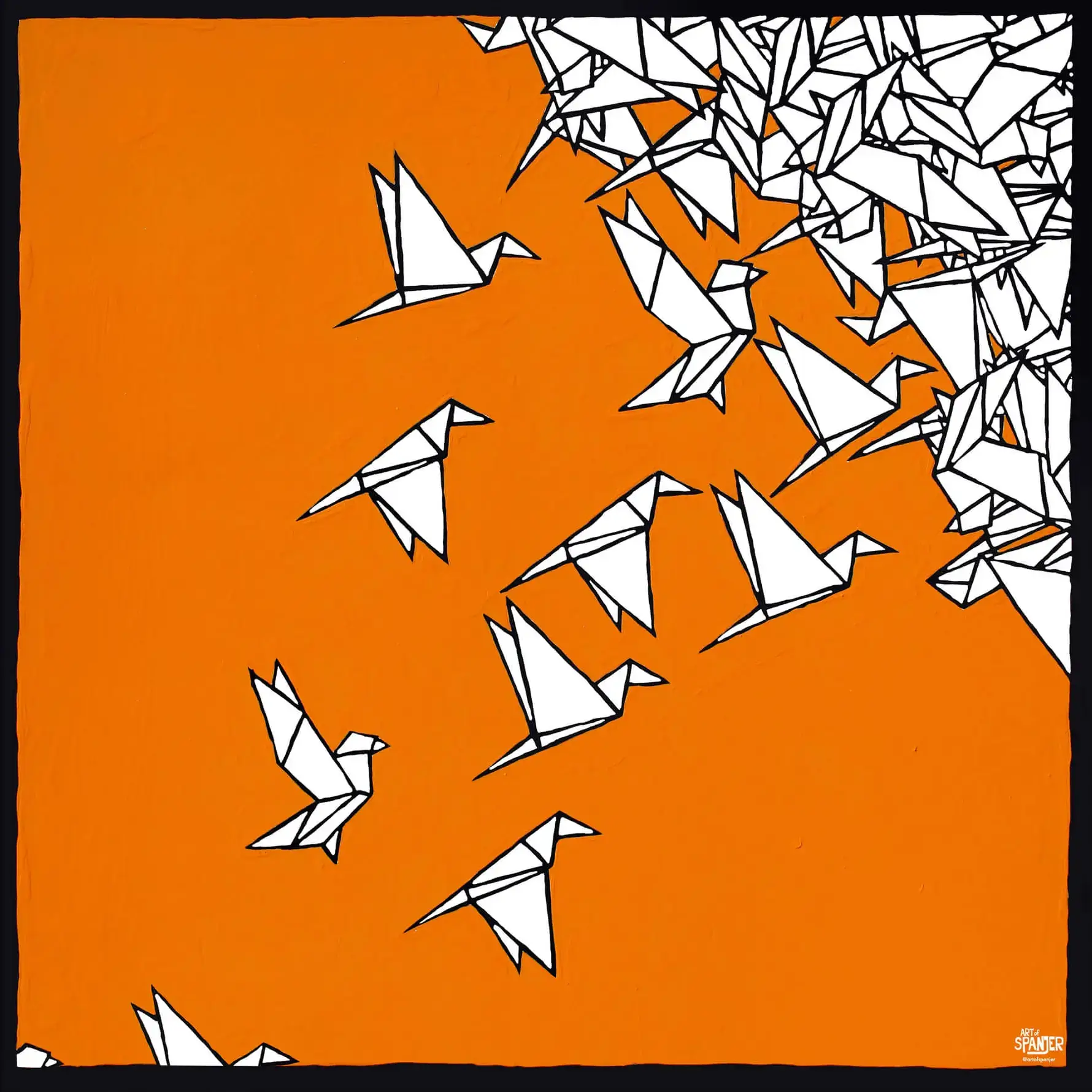 Numerous white origami birds in stages of flight migrate to the top right, set against a vibrant orange background.