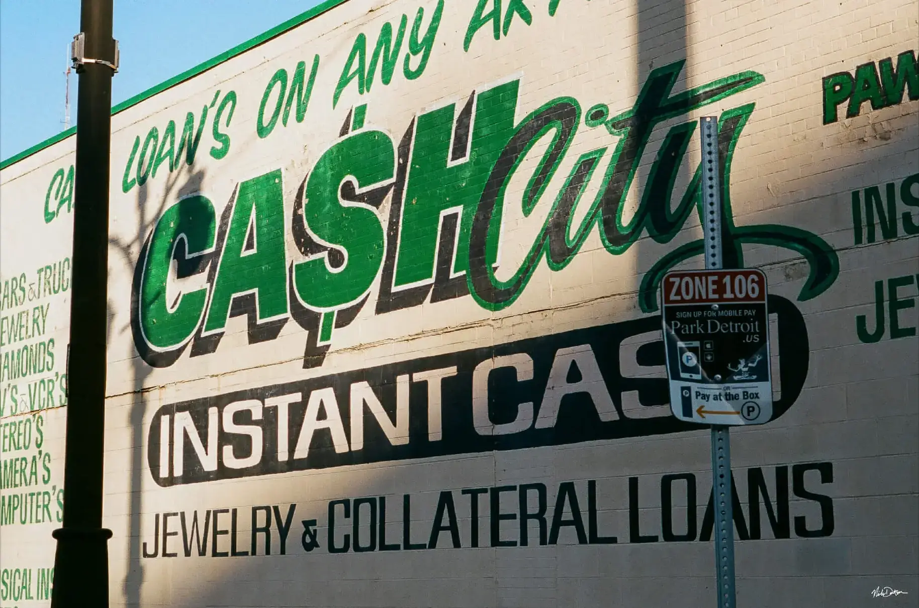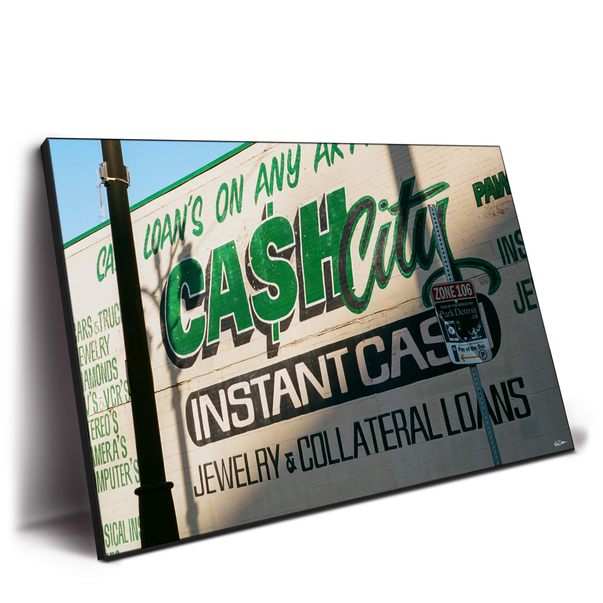 This photograph captures a vintage painted billboard on a brick wall, advertising a cash and loan service. The rich textures and warm tones of the brick juxtapose the faded green and white of the sign, evoking a sense of nostalgia.