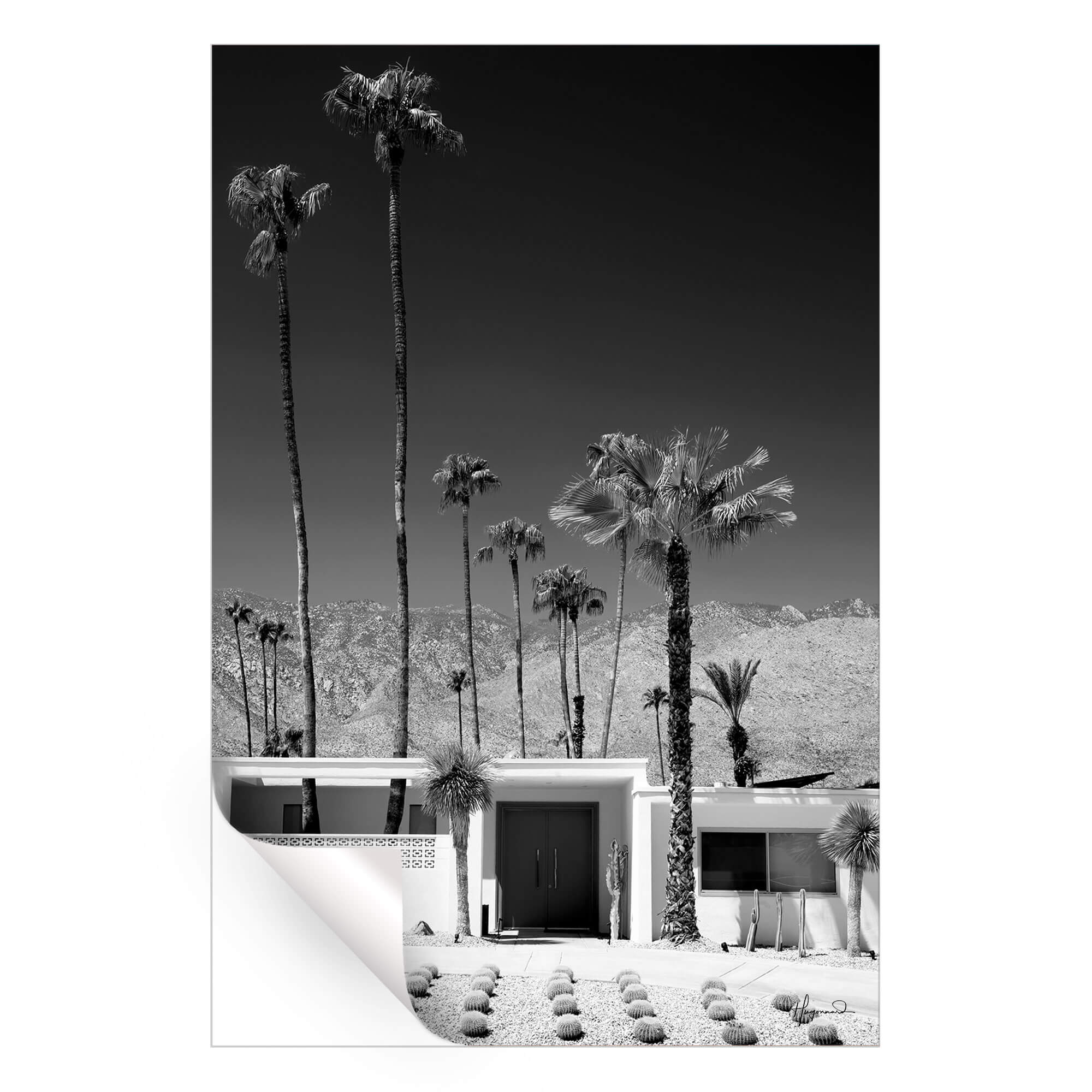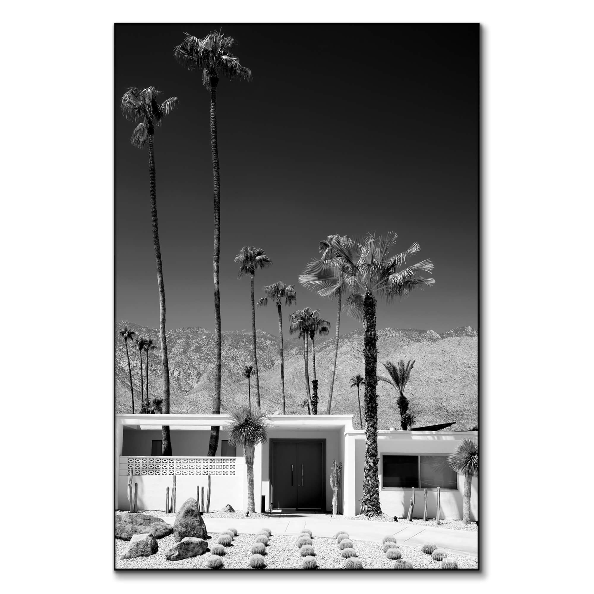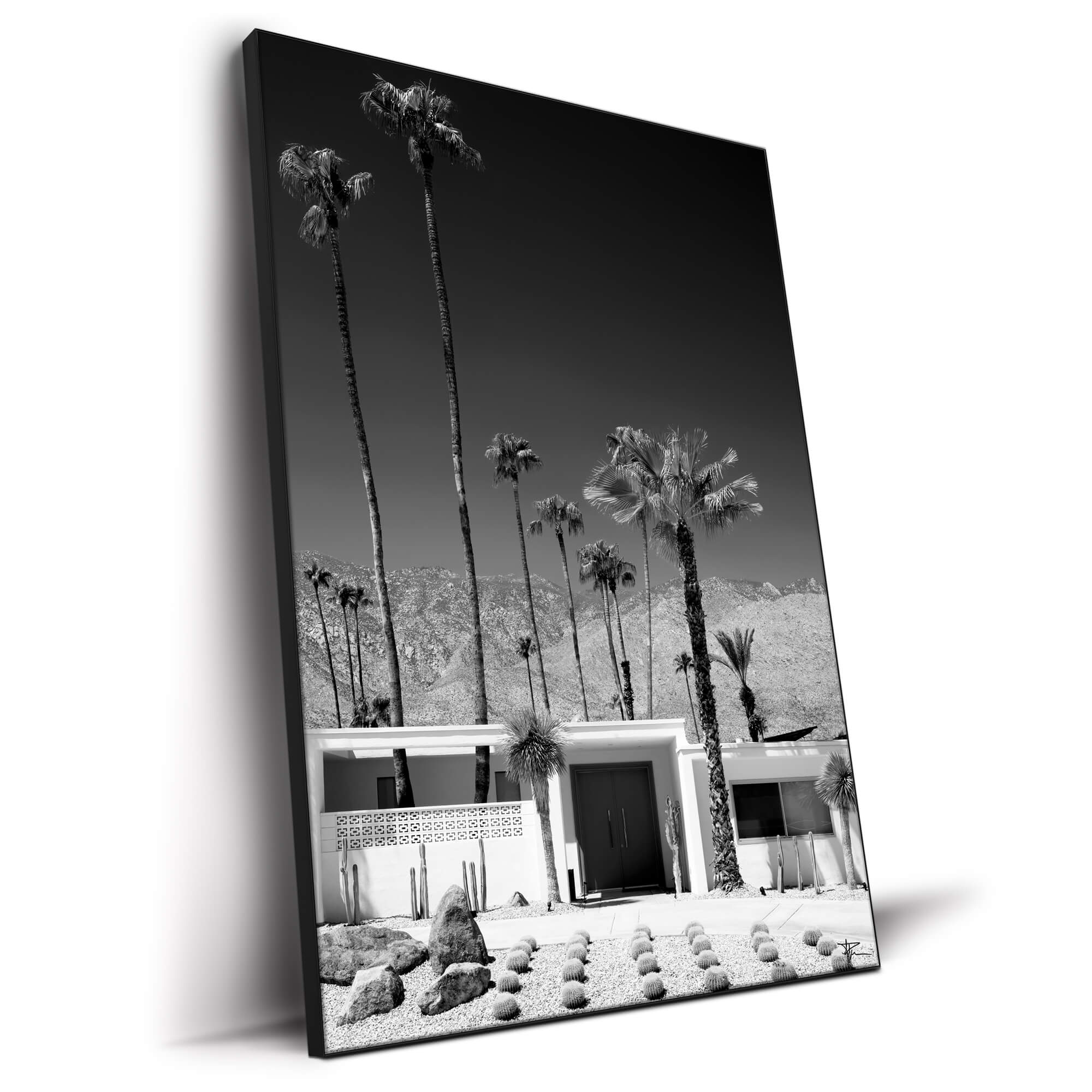 A midcentury modern house in a desert setting is shown, distinguished by its clean lines and flat roof. Tall palm trees tower above, set against a backdrop of mountain ranges, all depicted in a high-contrast black and white that accentuates the textures and forms of the architecture and landscape.