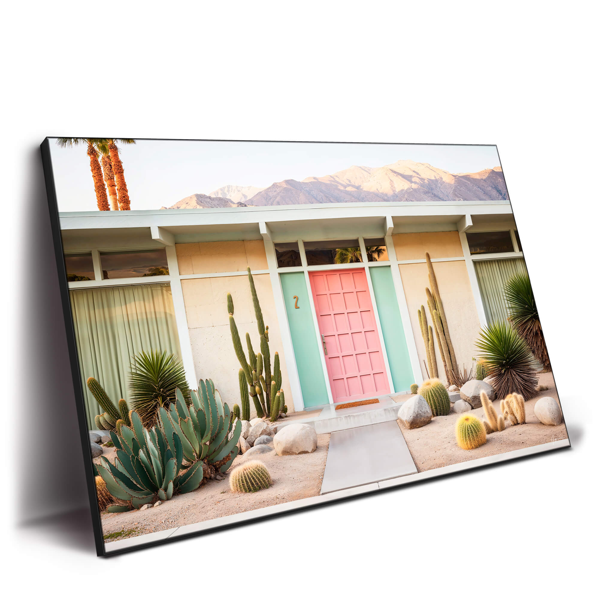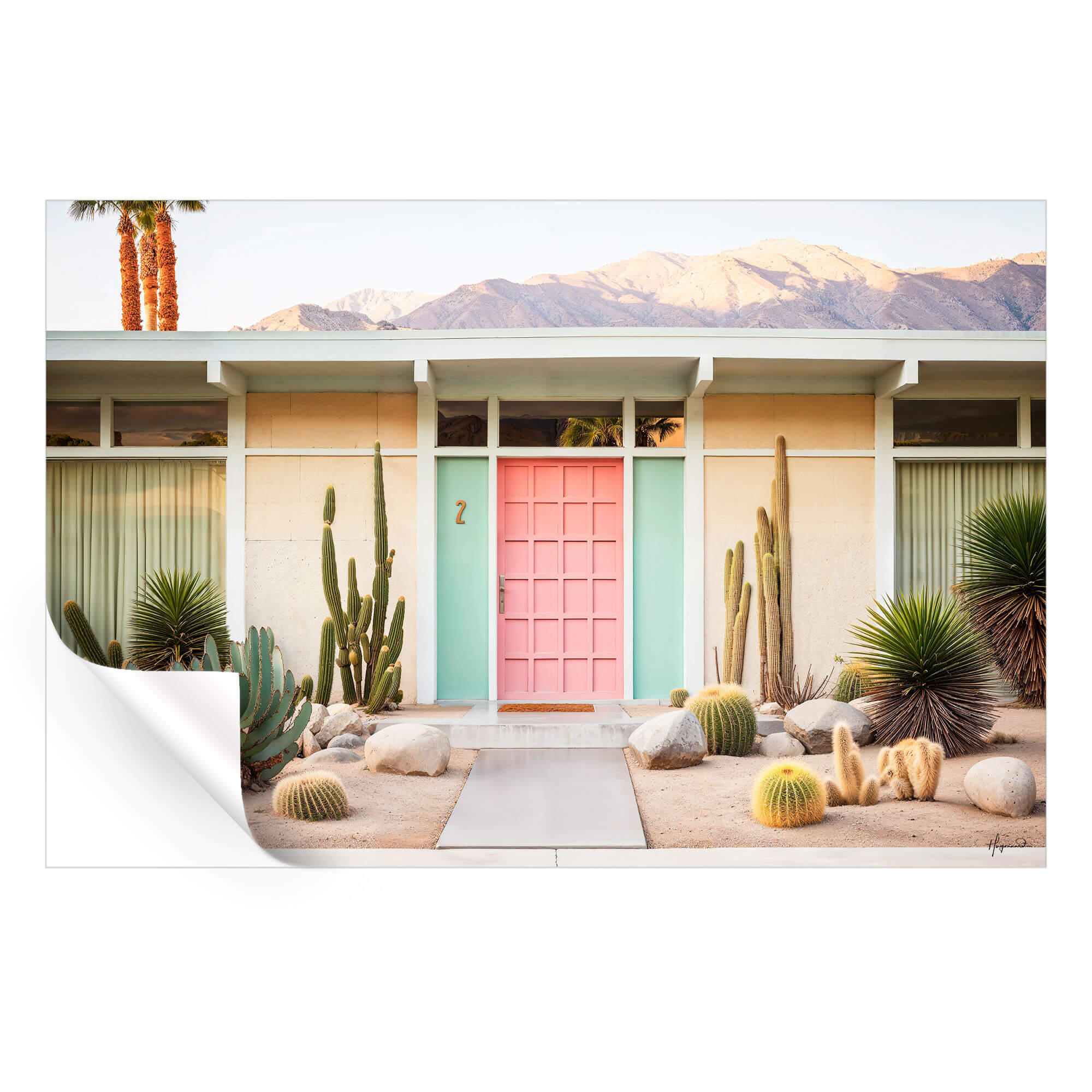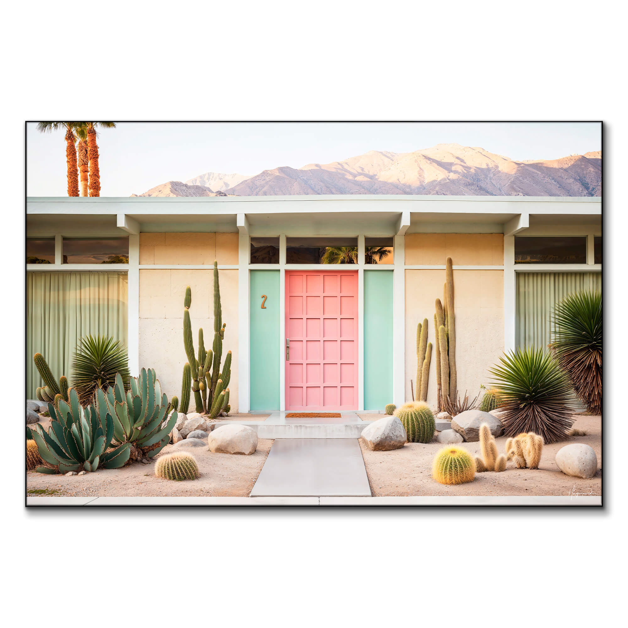 This artwork elegantly captures the essence of Palm Springs’ mid-century modern architecture, known for its clean lines and avant-garde design. The image focuses on a stylish house façade, featuring a striking pink door that offers a pop of color against the neutral tones of the building.