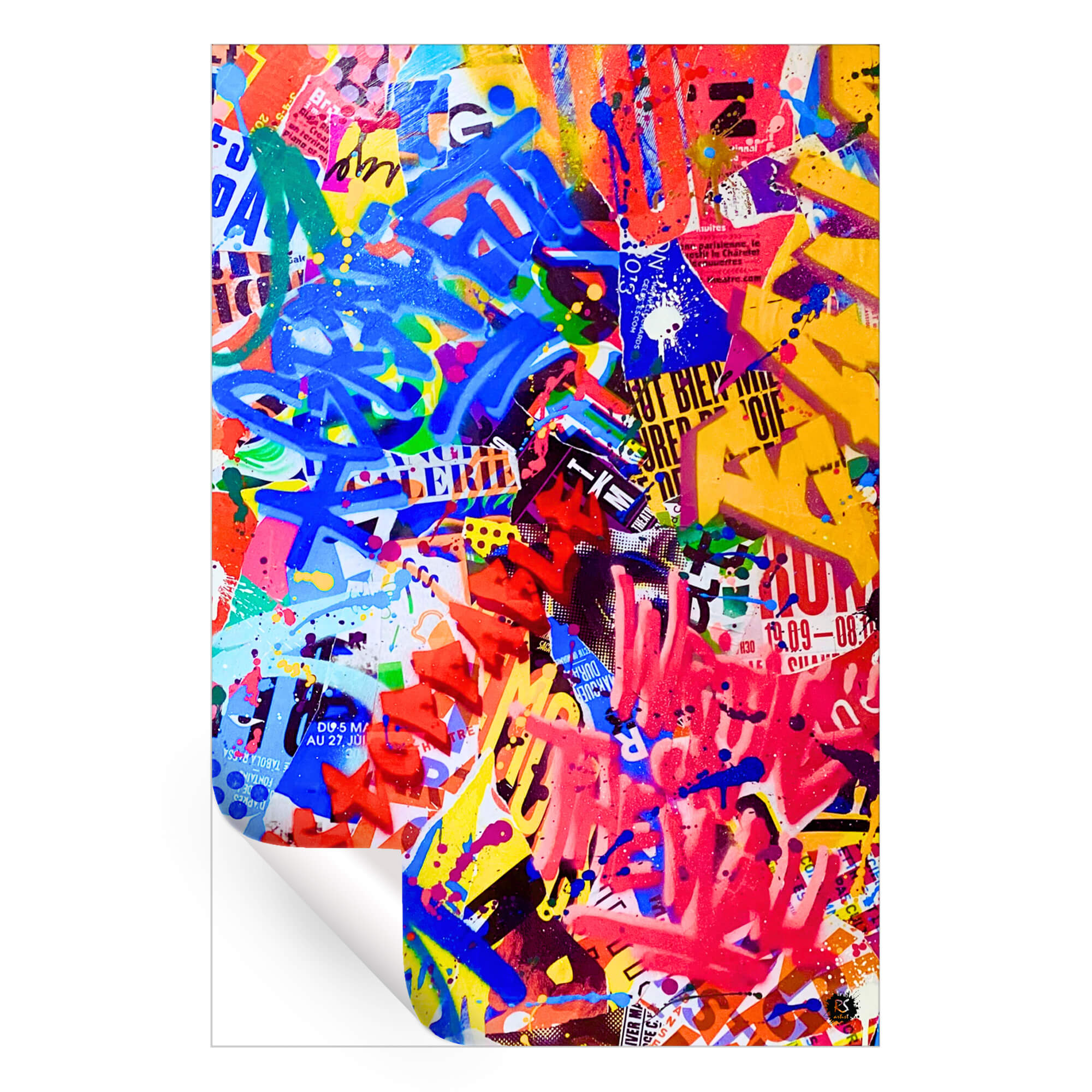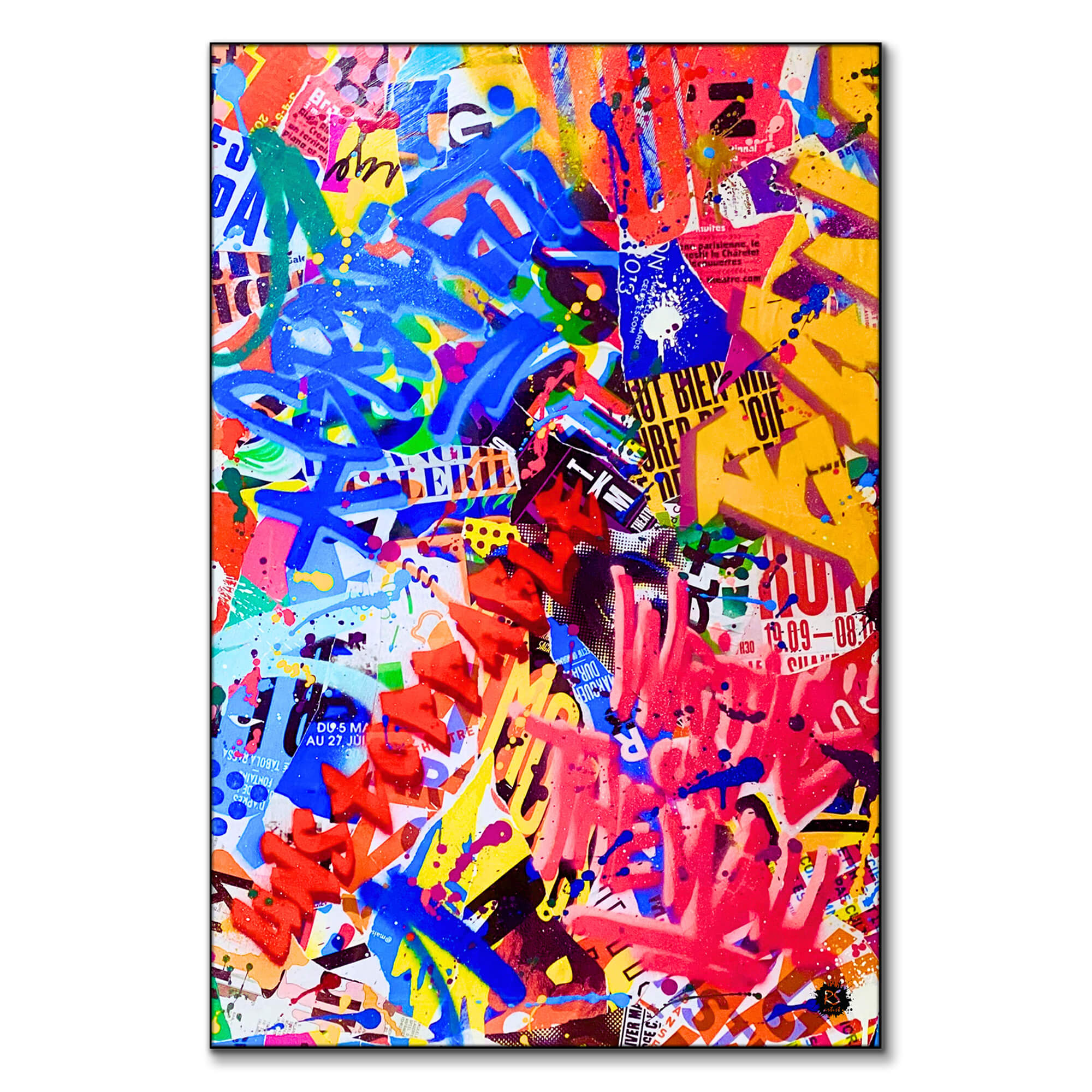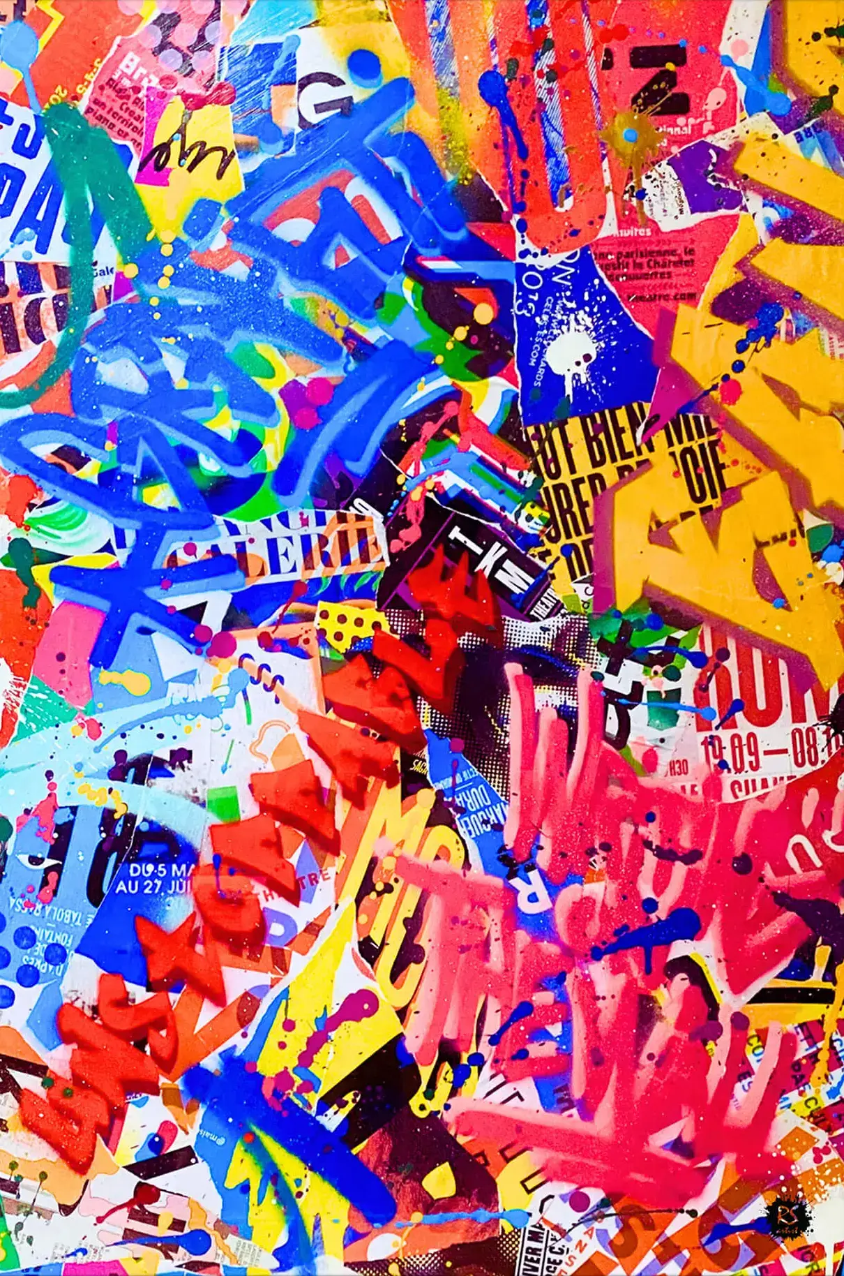 Featuring a riot of colors, including bold blues and reds, layers of posters, graffiti tags, and paint splatter create a densely packed visual experience. Words and numbers are stenciled and spray-painted in different styles and colors, giving the piece a dynamic and eclectic feel. The use of overlapping texts and images creates depth, drawing the viewer into the chaos.