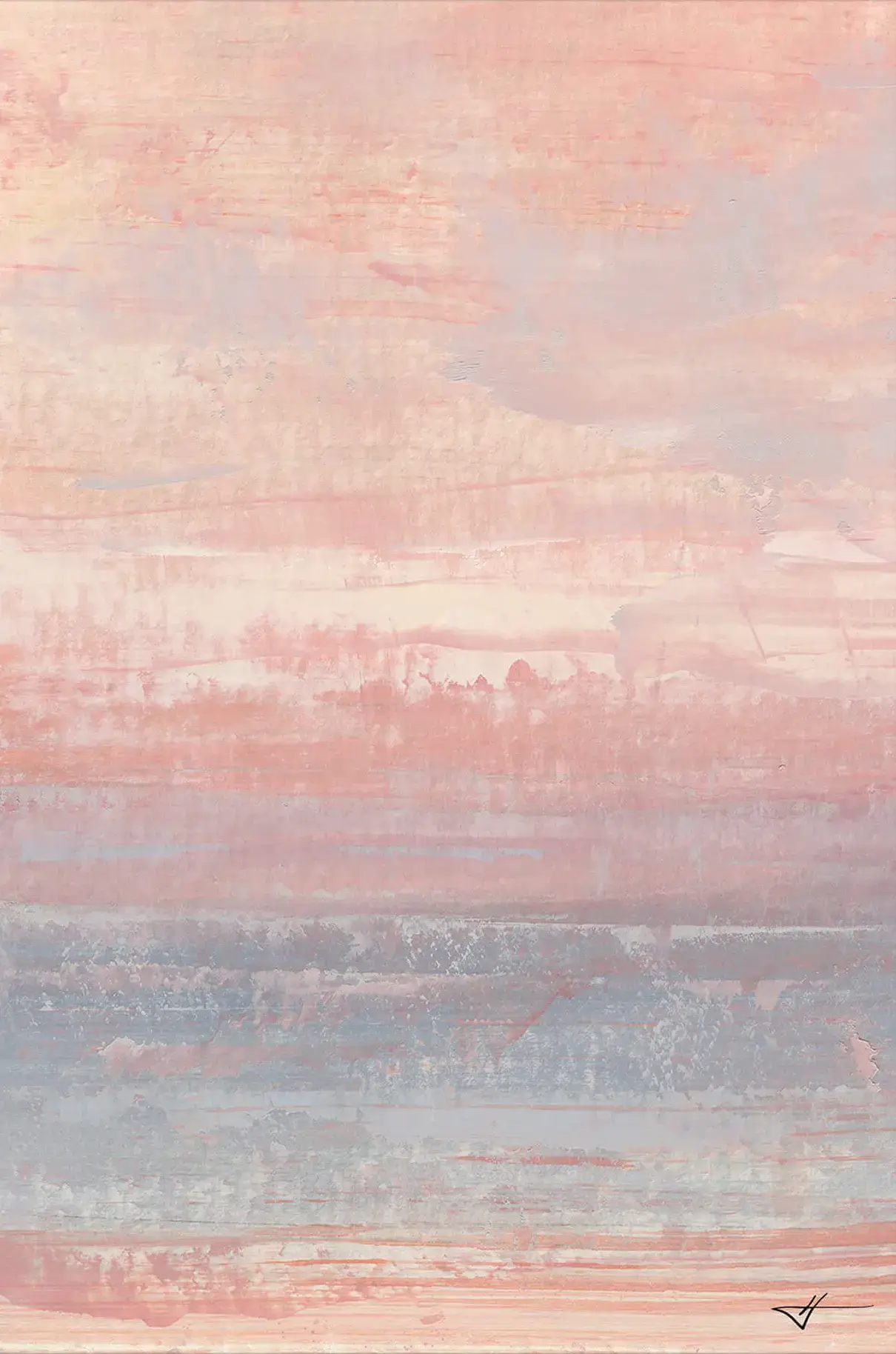 Soft, blended layers of pink, peach, and blue create a tranquil, abstract landscape. The horizontal brushstrokes are reminiscent of a calming horizon, capturing a gentle transition of colors. The delicate texture and subtle variations in tone give the piece a meditative quality.