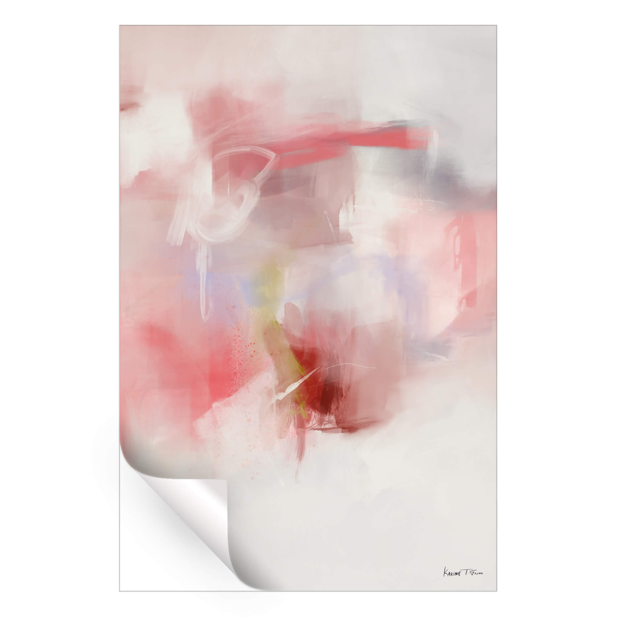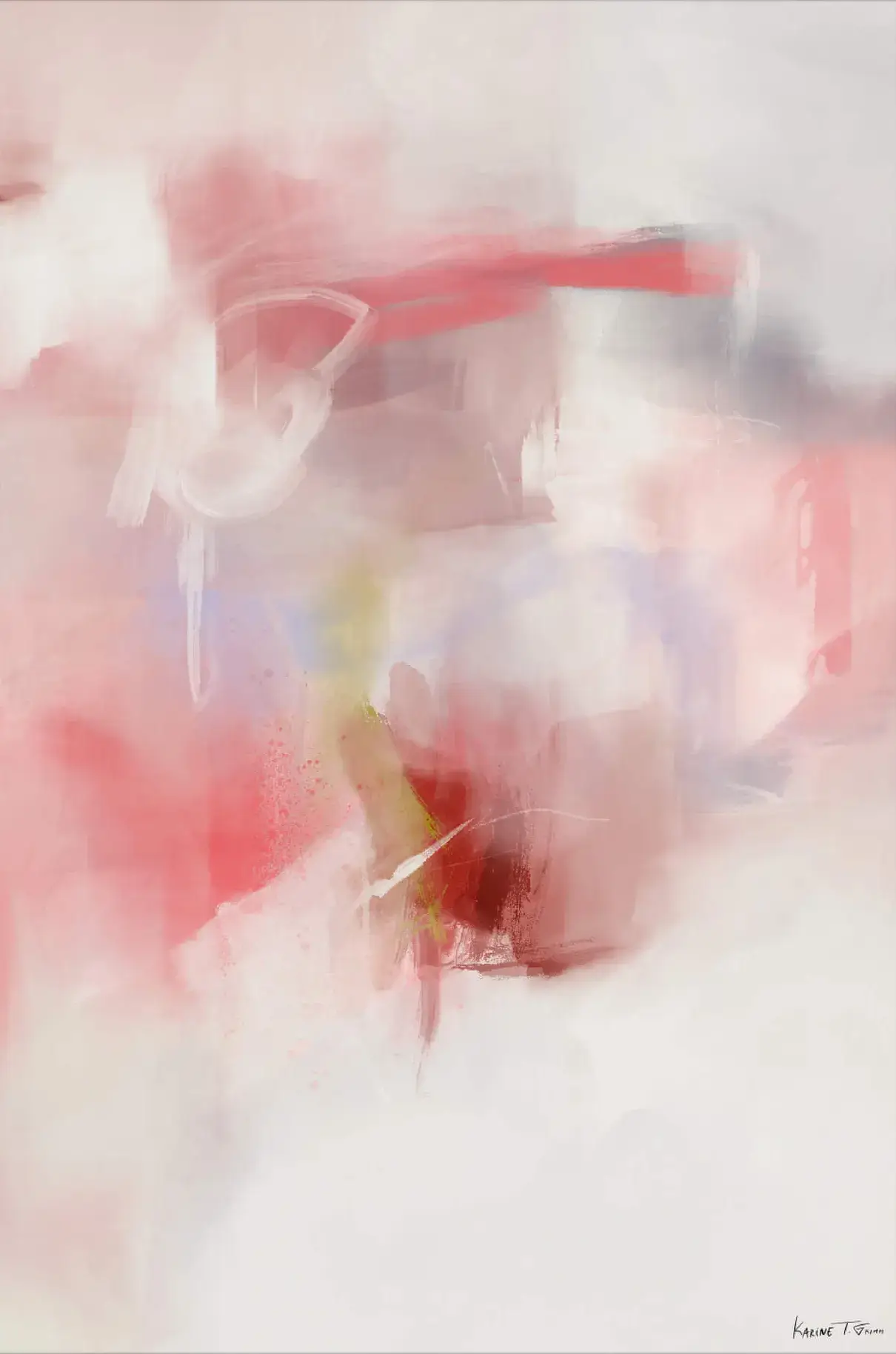 Swirls of crimson and gentle blushes cut through a fog of white, with pops of color emerging like flowers. Bold strokes of red suggest movement and passion. Smudges of faded green and hints of yellow peek through, like the first signs of life renewed. The work is a dance of color and light, where each hue seems to be caught in a delicate waltz.