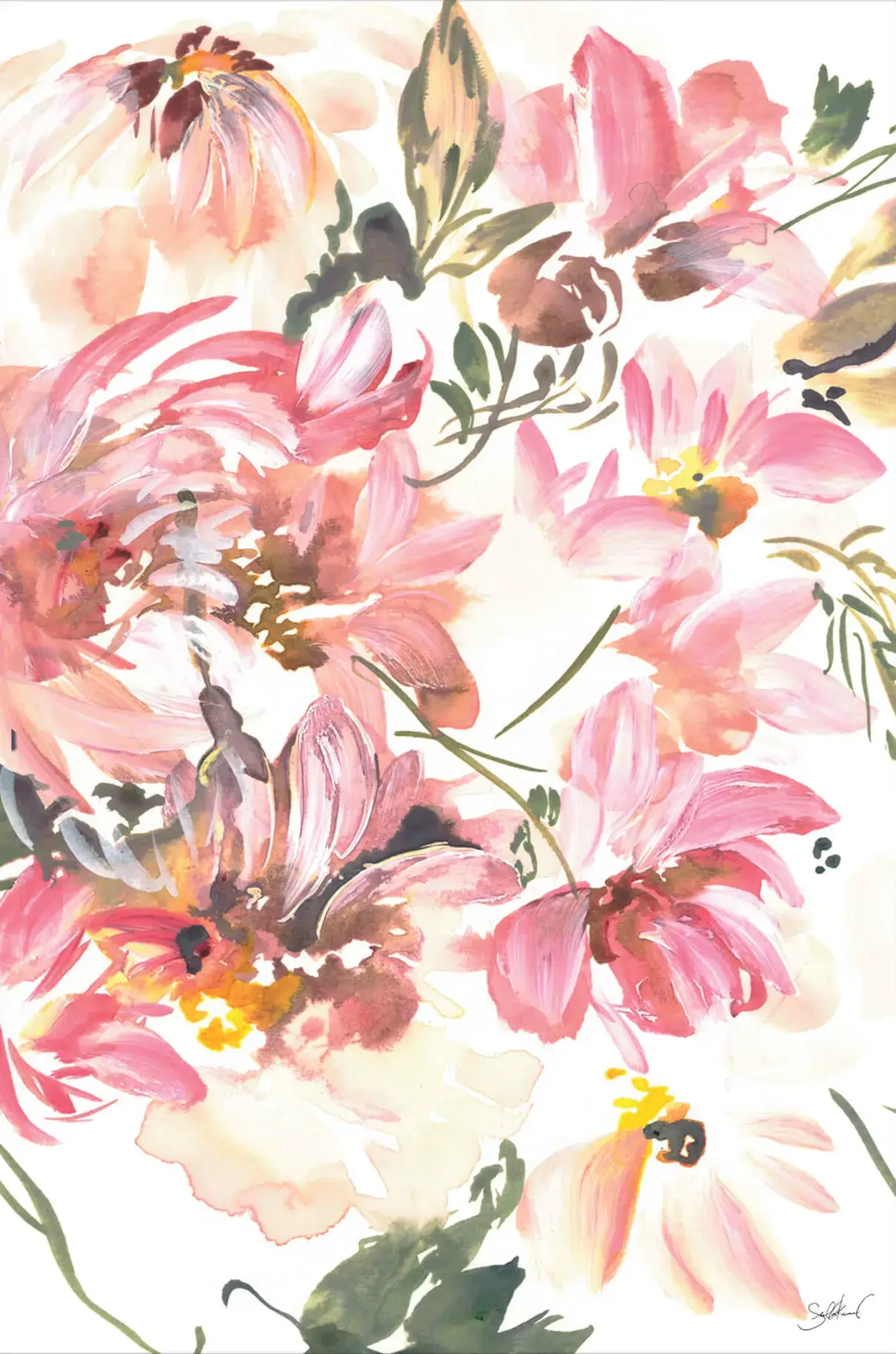 Vibrant watercolor strokes bring to life a bouquet of flowers in full bloom. The warm palette of pinks and corals dances with dabs of deep green, suggesting vitality and growth. There’s a joyful spontaneity to the composition, as if each petal is caught in a gentle, sunlit breeze.