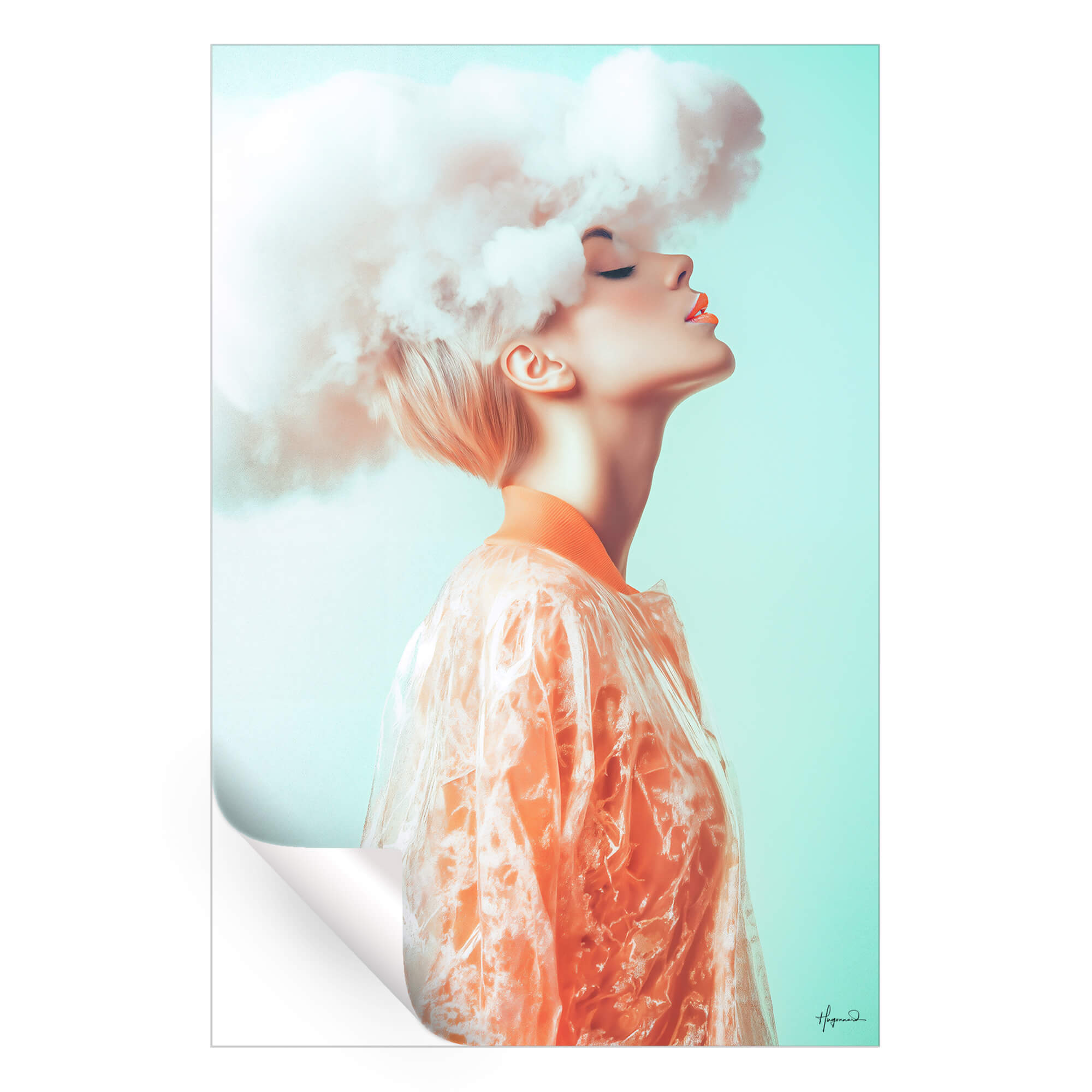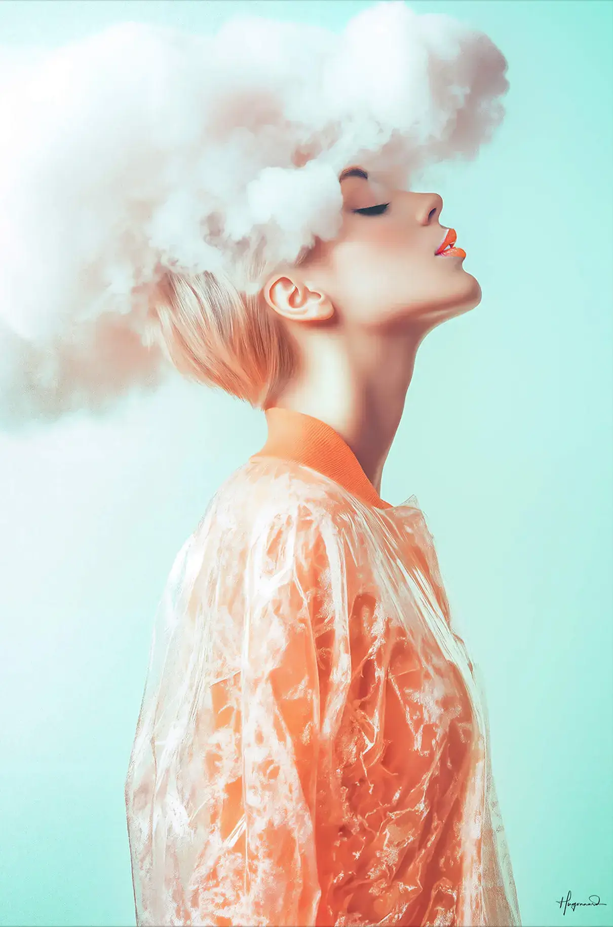 The woman tilts her face skyward, lips painted coral, eyes closed in quiet thought. A cottony cloud crowns her cropped platinum hair, dissolving into a mint-teal sky. Soft light wraps her silhouette and smooth skin. The translucent orange jacket glows like sunrise through frosted glass. Delicate folds of the fabric catch highlights that shimmer against the pastel background. Hushed pink tints brush the cloud edges, echoing the lipstick. Airy space surrounds her, creating gentle breathing room. Each element settles into balance, leaving only calm.