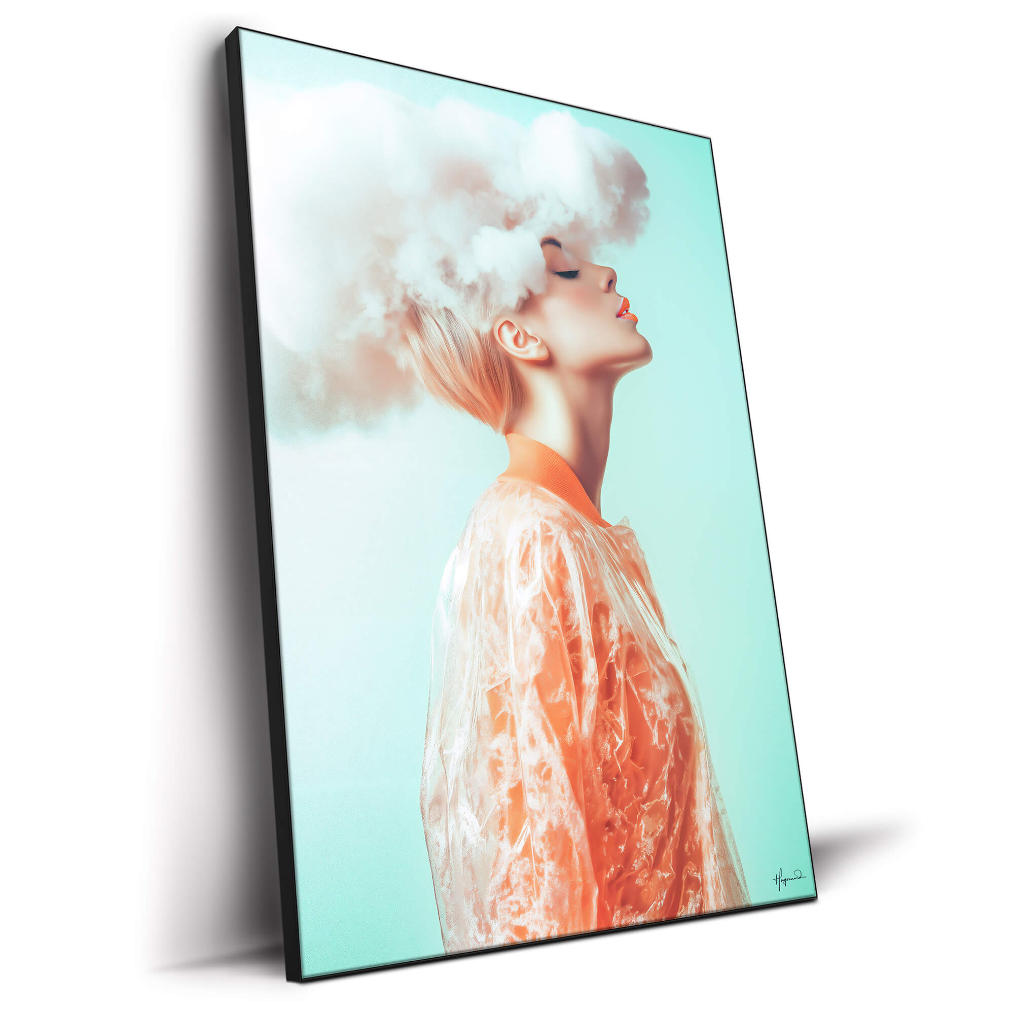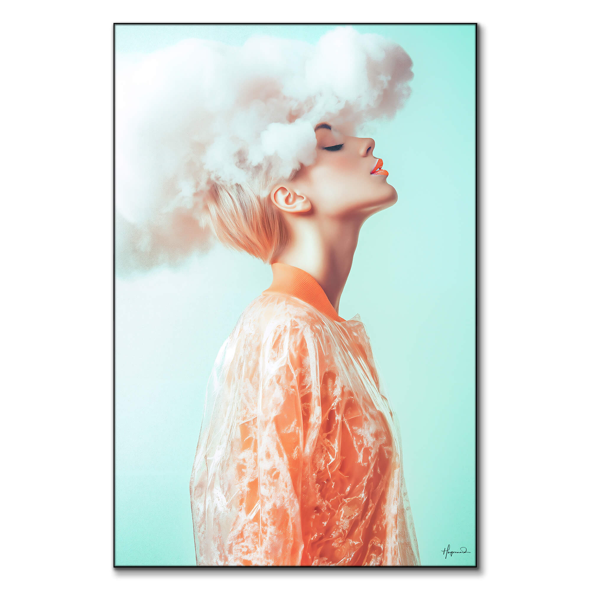 Color play continues low in the frame where orange meets turquoise, lending subtle contrast that feels fresh. The vertical layout stretches the figure, guiding the eye from the jacket texture to the dreamlike vapor above. Negative space amplifies serenity while the high-definition ArtFab print preserves every wisp of vapor and thread of fabric. Finishing options in slim black or silver aluminum frames keep focus on hue and mood.