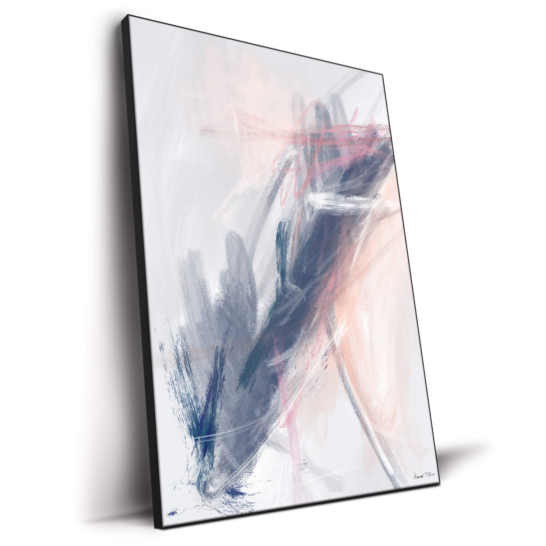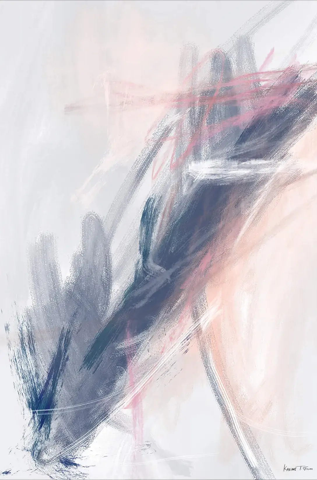 Through a mist of dreamlike tranquility, Karine Tonial Grimm orchestrates a symphony of pink and sage brushstrokes. The artwork is a delicate balance of energy and calm, with swathes of soft color that suggest a serene, otherworldly landscape.