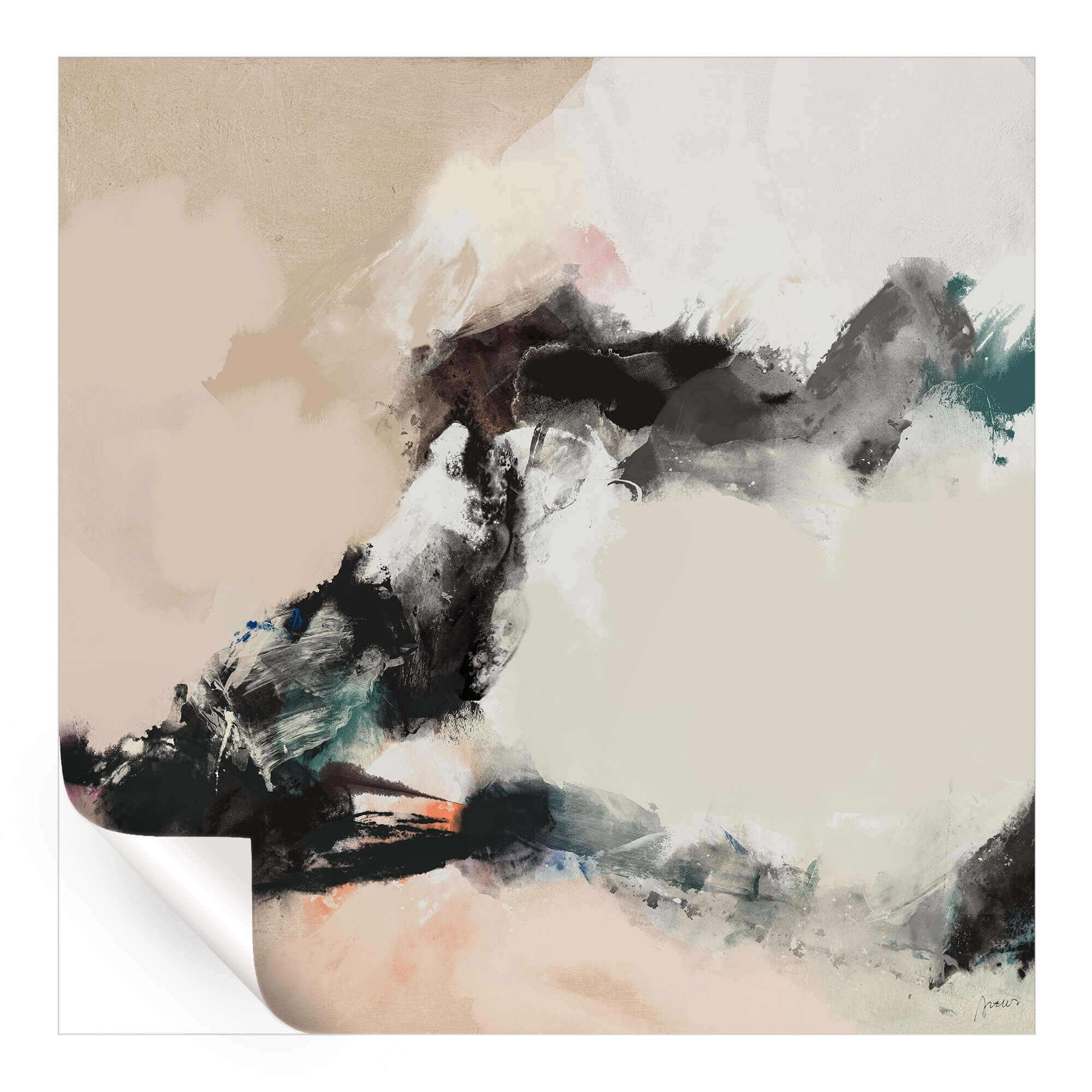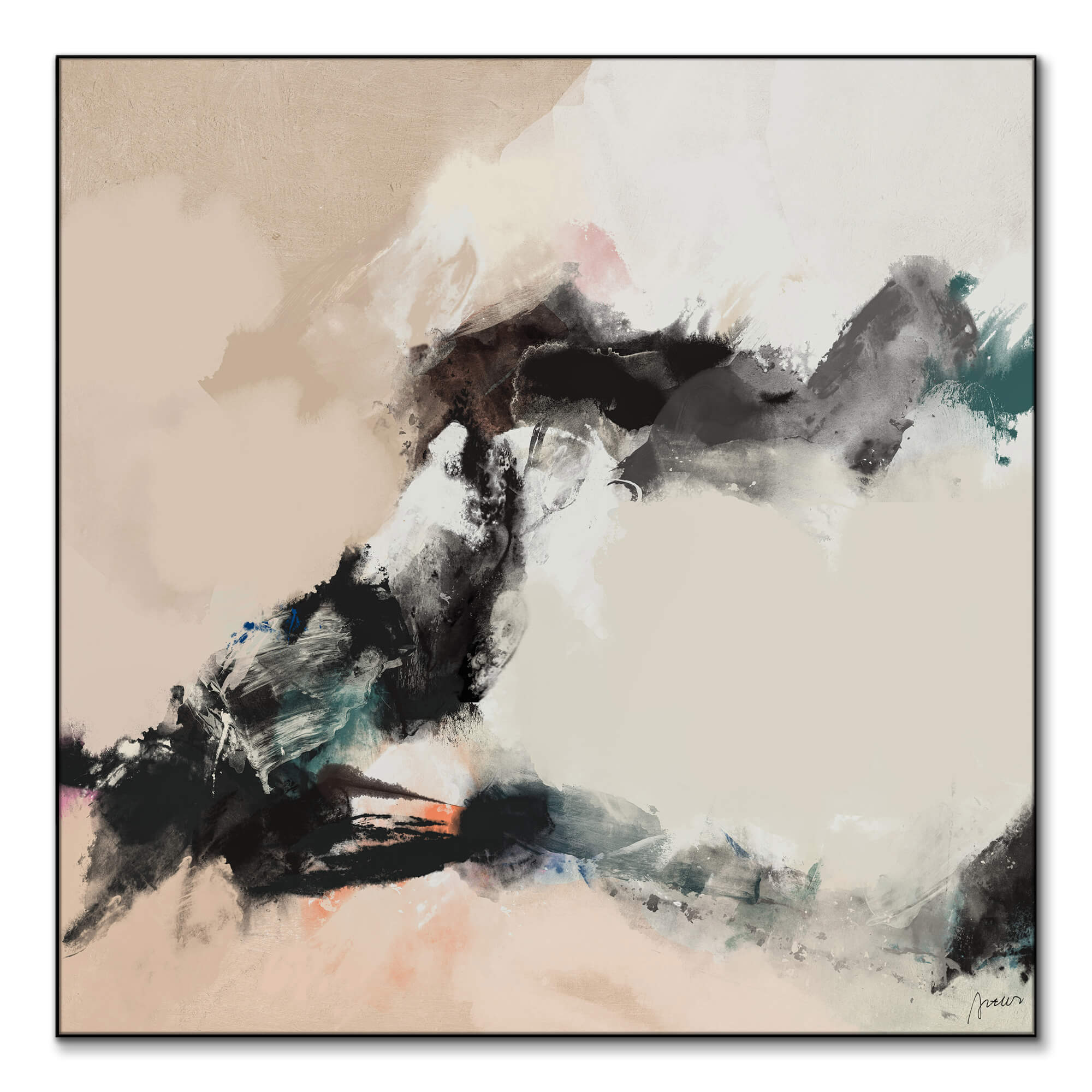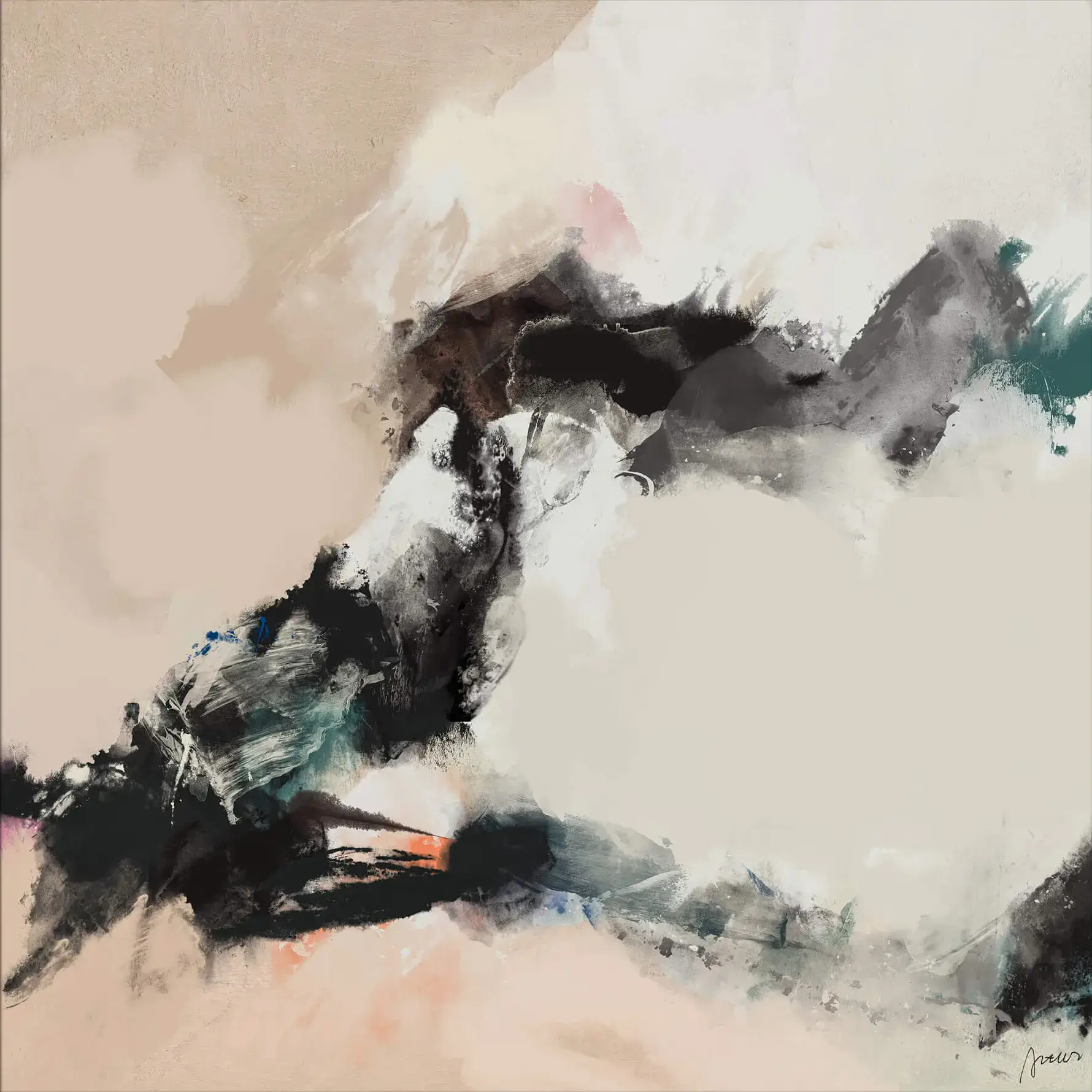 Converging forms in a muted color palette create an abstract scene of delicate chaos. Swirls of white and soft peachy coral are surrounded by darker shades that are in motion. The exchange of textures and subtle hints of color suggests a natural occurrence, like a moment of creation.