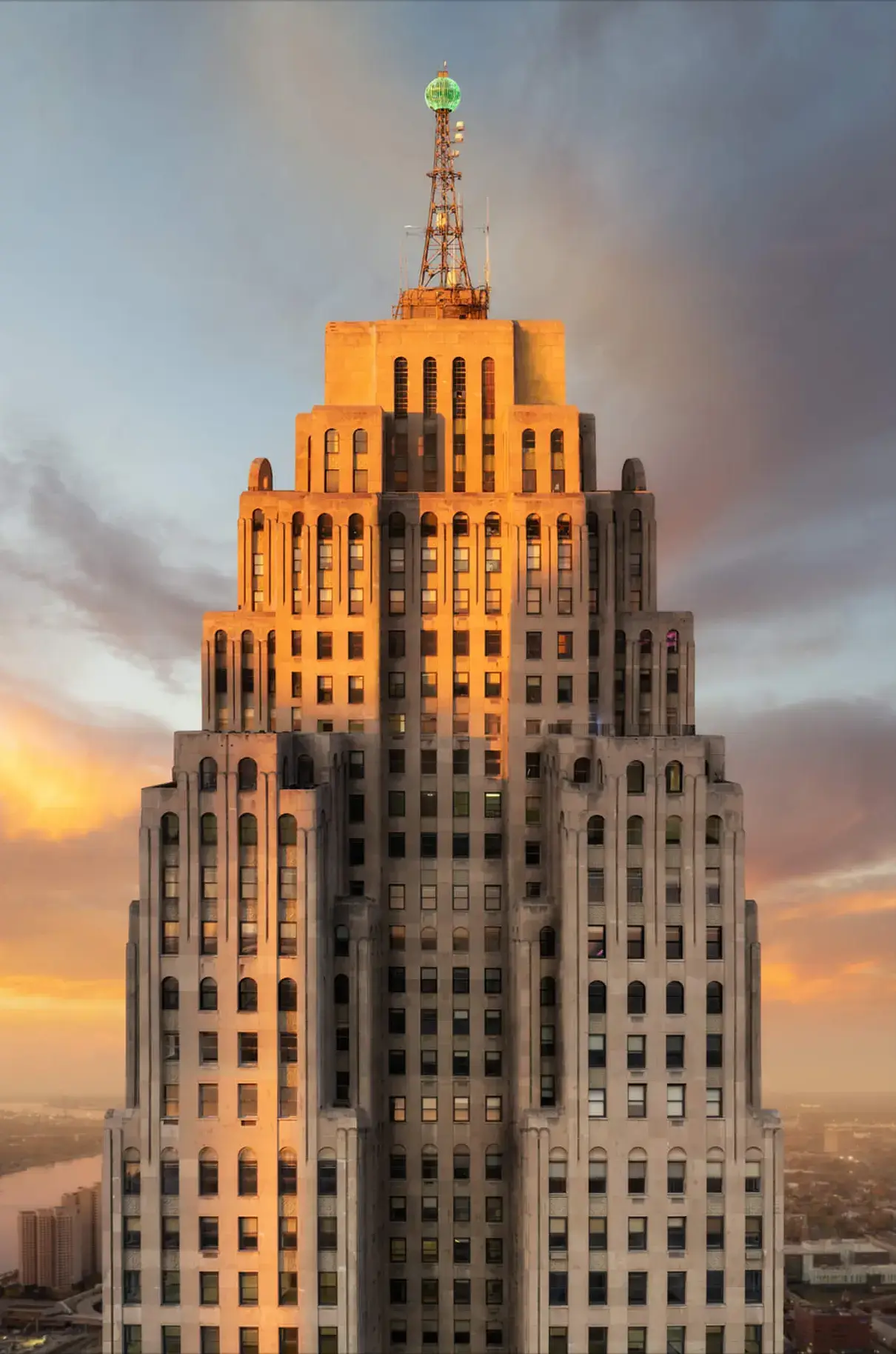 Bathed in the warm glow of a setting sun, the Penobscot Building towers over the Detroit skyline, a striking figure of historical architecture. Its upper stories are highlighted by the last rays of daylight, showcasing the building’s distinctive stepped-back style reminiscent of the Art Deco era.