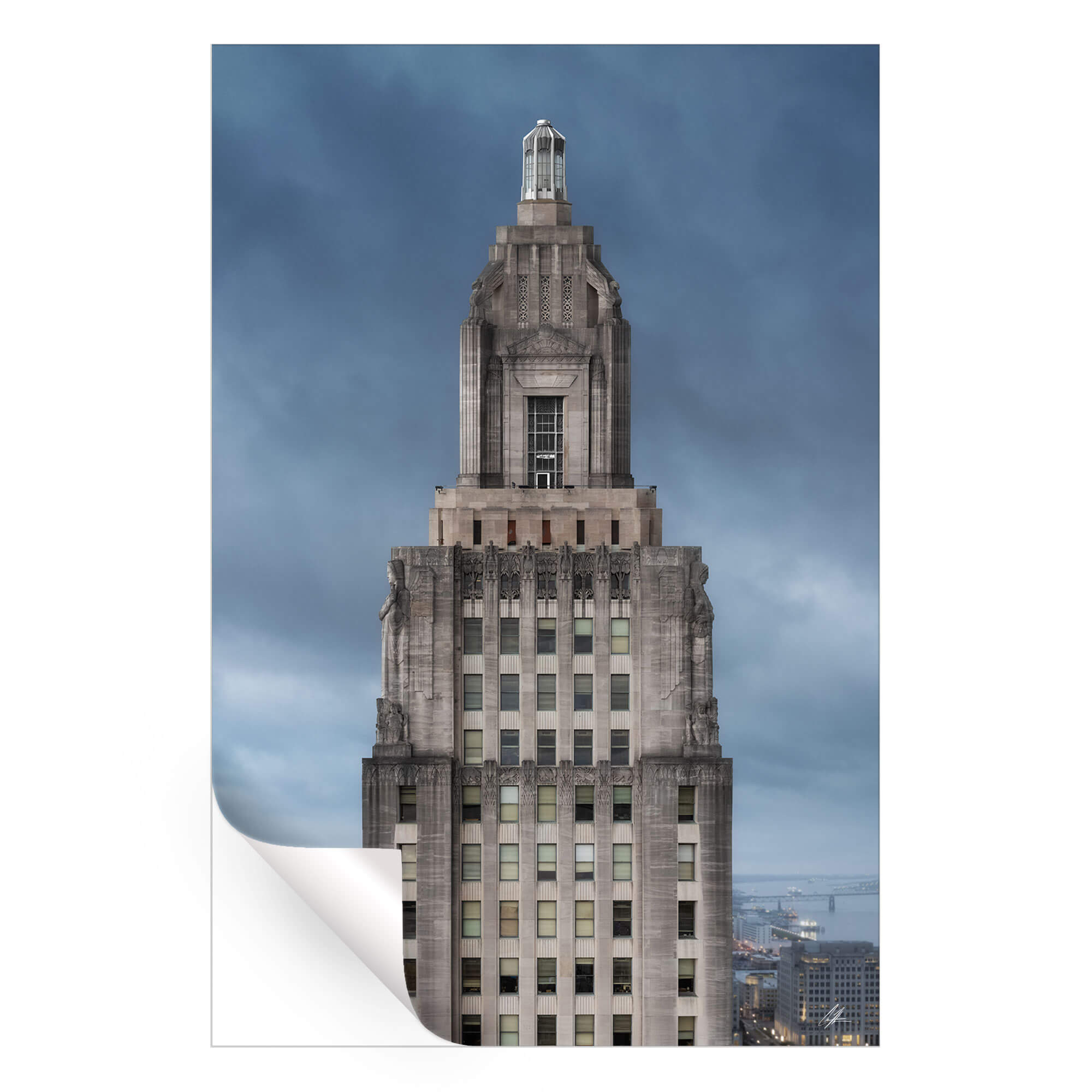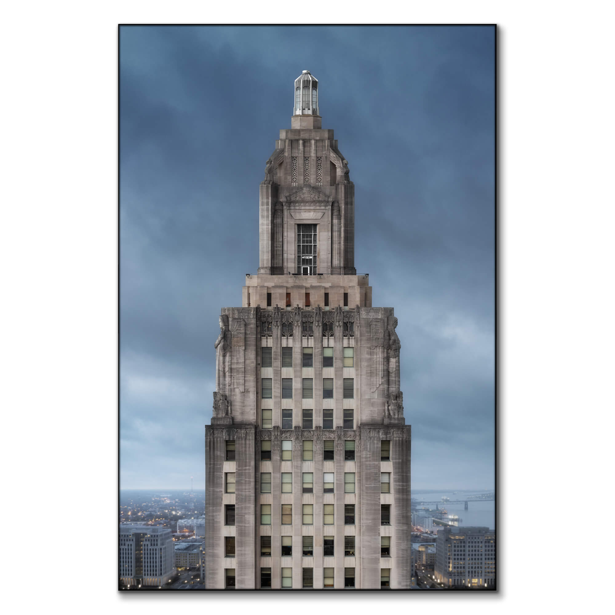 Sculptural details and the central tower are poised with dignity against the backdrop of a dusky evening. This urban photograph by Chris Hytha encapsulates the state capitol’s stately presence amidst the Baton Rouge skyline.