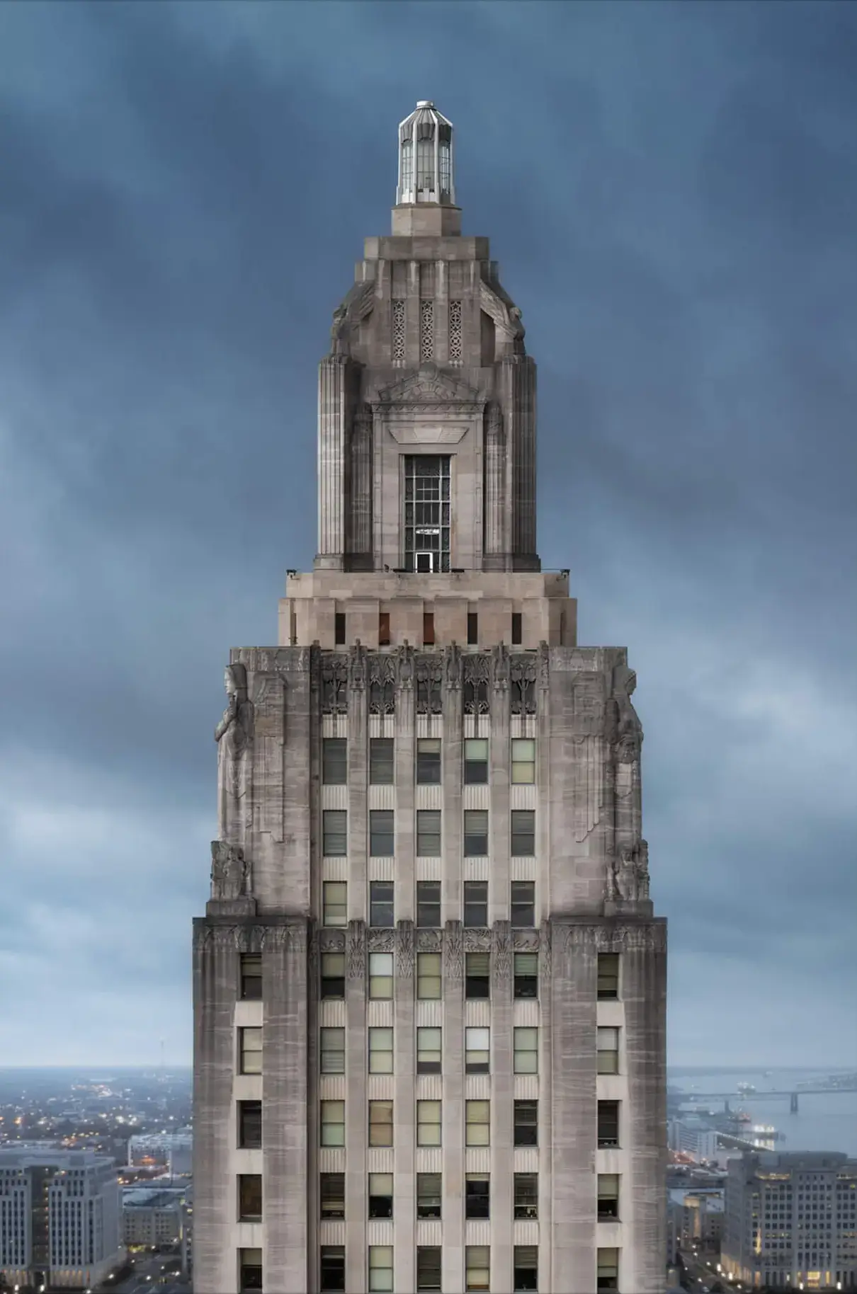 The Louisiana State Capitol stands tall, its art deco architecture piercing the overcast sky with an air of solemnity and strength. The building’s rigid lines and imposing structure are softened by the fading light, hinting at the power and history contained within its walls.