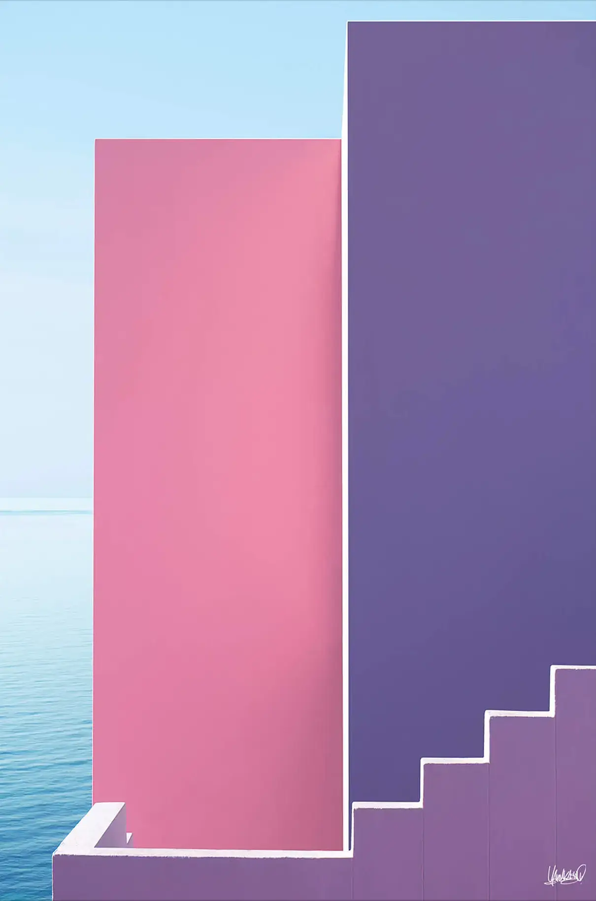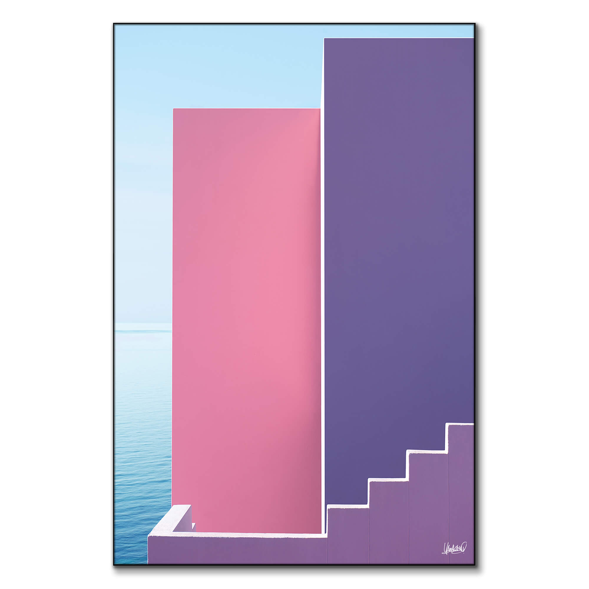This contemporary piece features a striking use of geometry and color, with bold pink and purple shapes contrasted against a soft sky and the calm water below. The minimalist design, with clean lines and sharp angles, creates a sense of space and tranquility. The subtle gradient of the colors, combined with the serene backdrop, evokes a feeling of balance and harmony. Printed on high-quality materials, this artwork is perfect for those who appreciate modern abstract art, offering a bold yet soothing aesthetic to enhance any room. Ideal for contemporary spaces looking for a sophisticated, color-rich focal point.