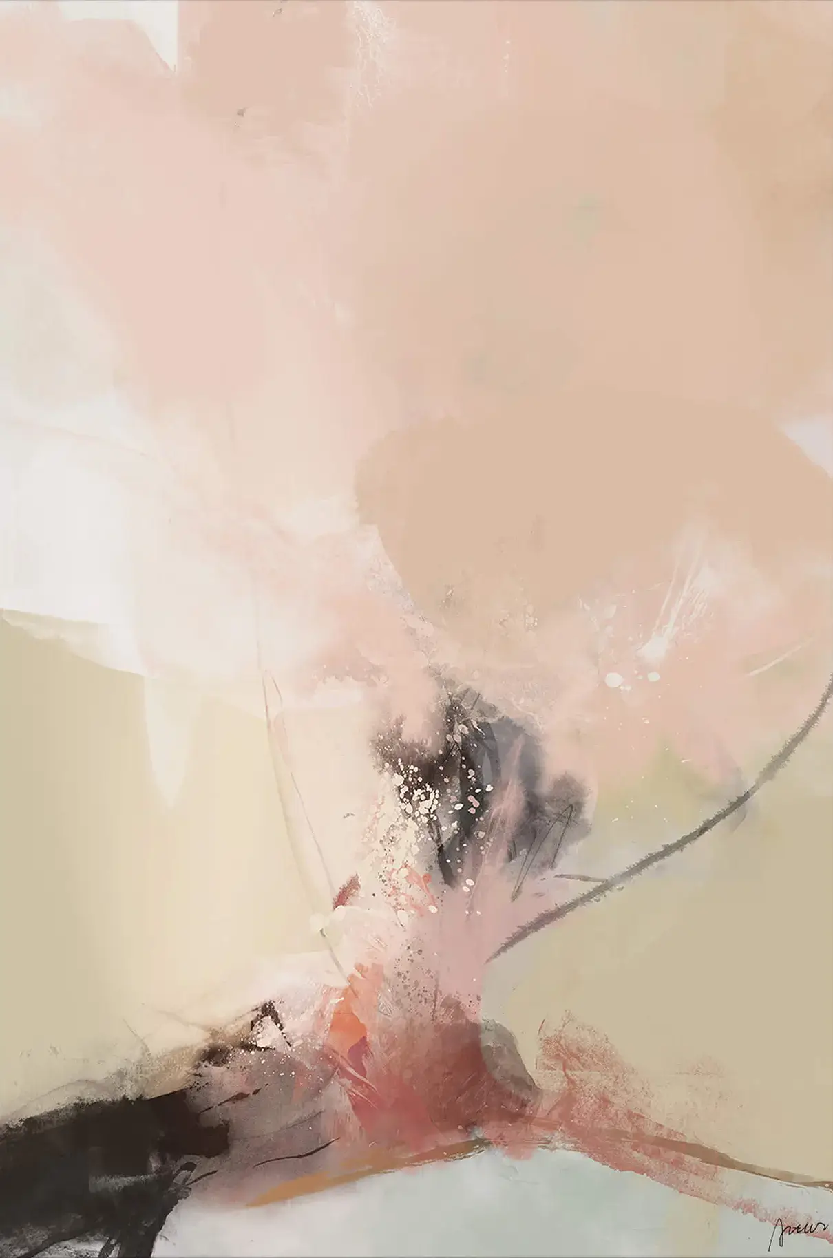 Soft pinks blend seamlessly with neutral tones in this serene abstract piece. The delicate brushstrokes create a calming effect, while small accents of dark and light tones provide subtle interest. The piece offers an elegant simplicity that enhances any interior with warmth and sophistication.