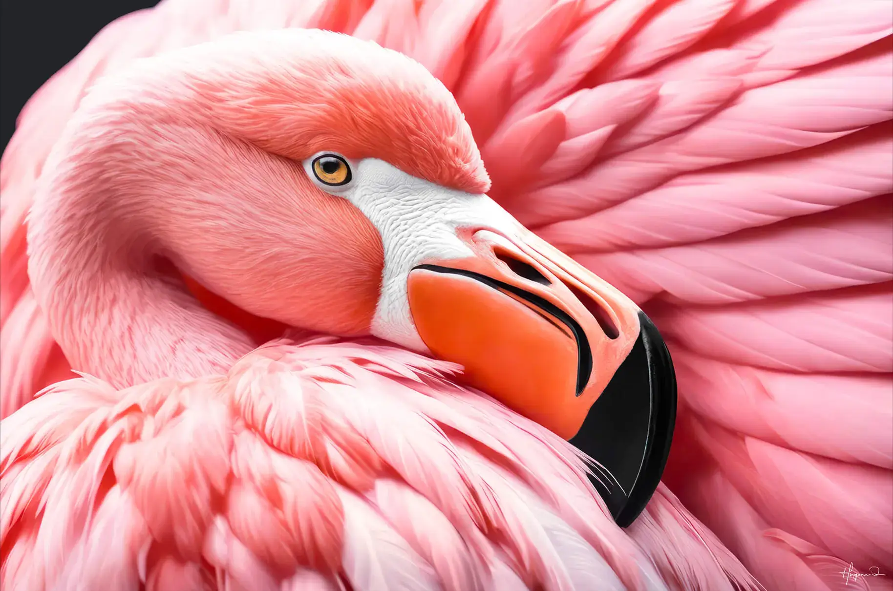 An intimate close-up of a flamingo, beautifully capturing its detailed features against a contrasting black backdrop. The flamingo’s vibrant coral-pink feathers are showcased in exquisite detail, revealing intricate patterns and soft textures that create a visually stunning mosaic.