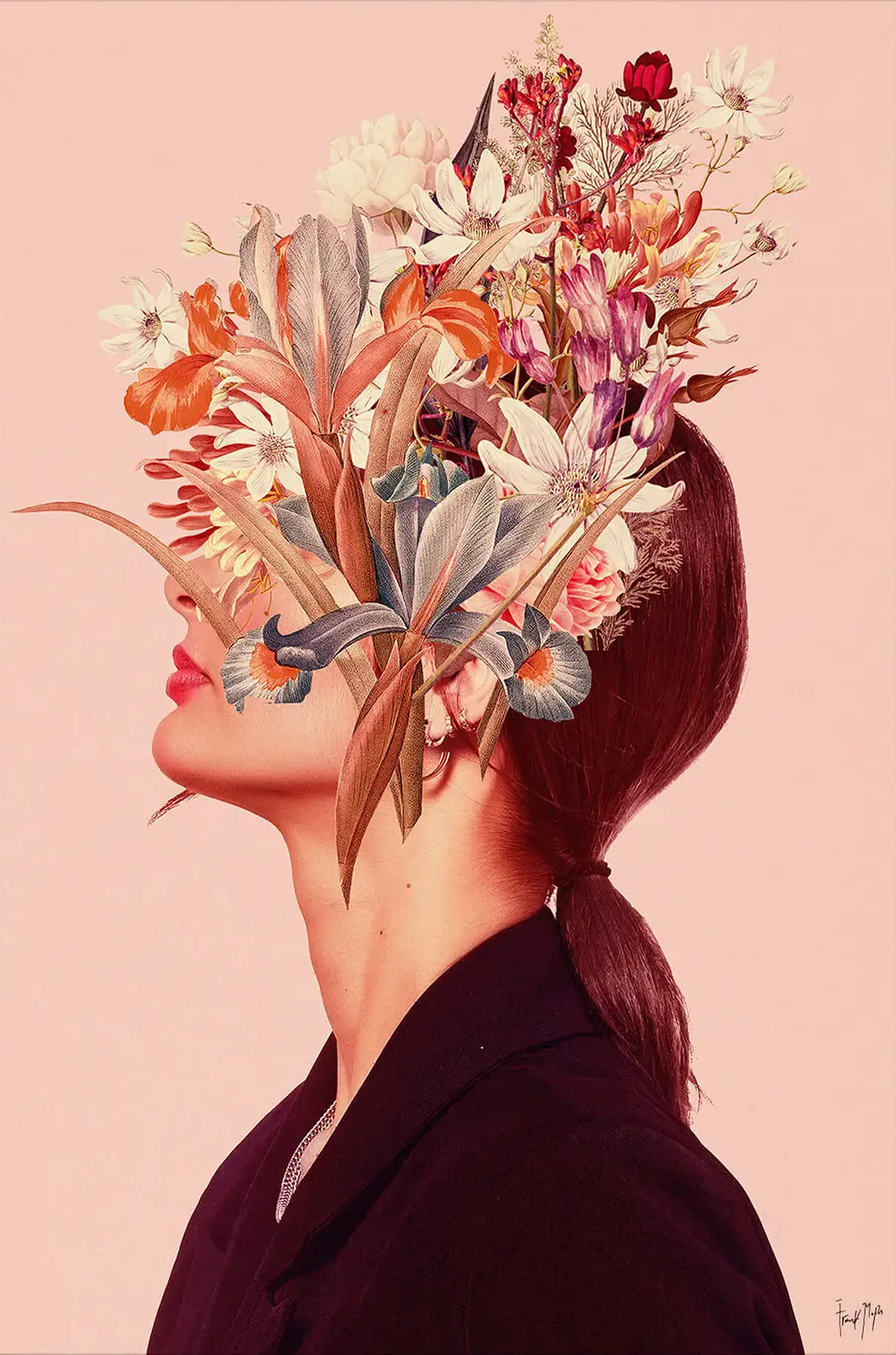 A modern fusion of surrealism and floral beauty, this artwork transforms the human form into a living garden. A woman tilts her head gracefully, her face replaced by a blooming arrangement of delicate flowers and leaves. The palette—soft pinks, earthy neutrals, and subtle reds—creates warmth and elegance while maintaining a dreamy, contemporary feel.