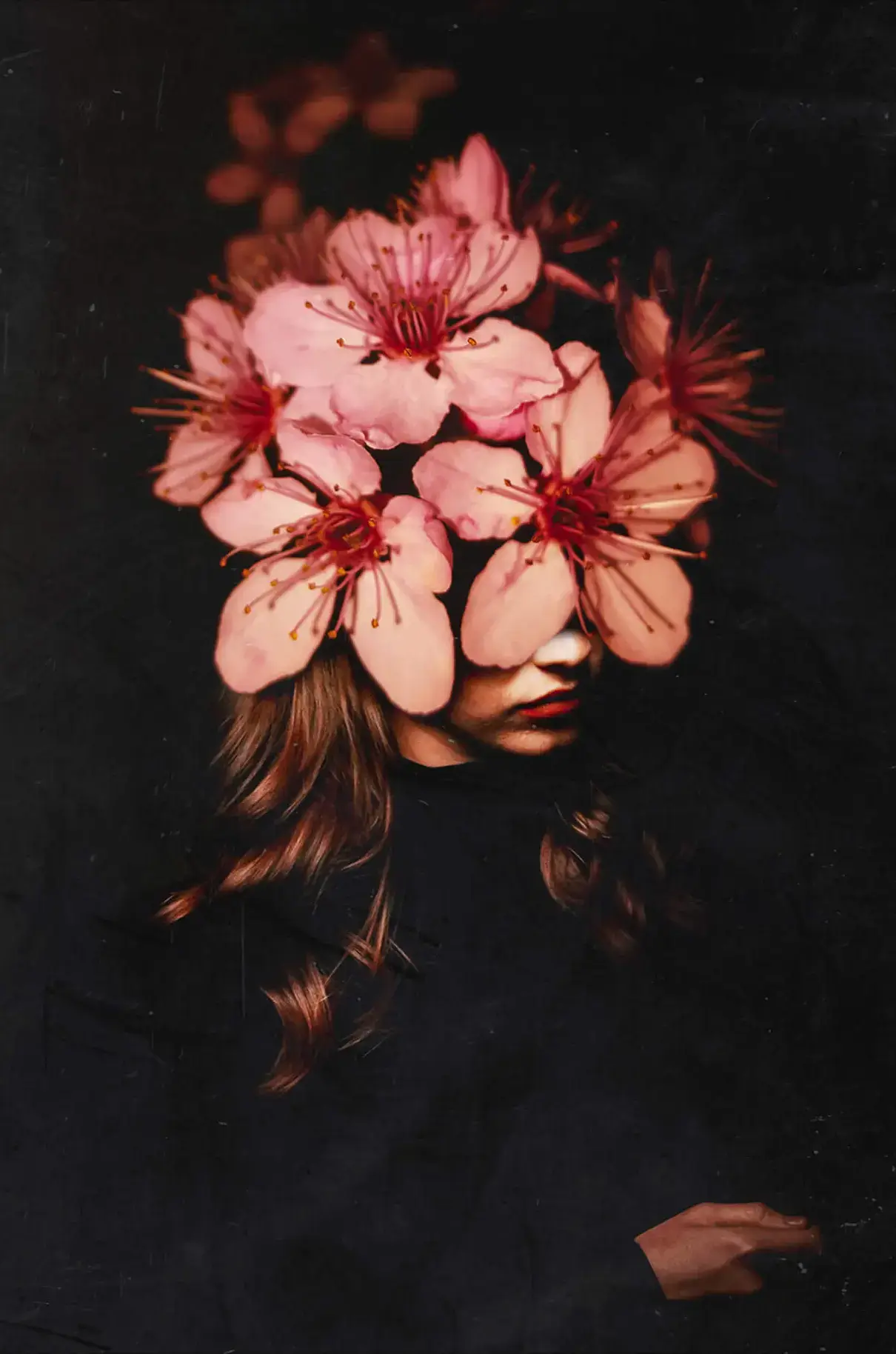 A cluster of cherry blossoms blooms from the head of a person, obscuring their face and merging with their hair, the delicate petals glowing against a dark backdrop.