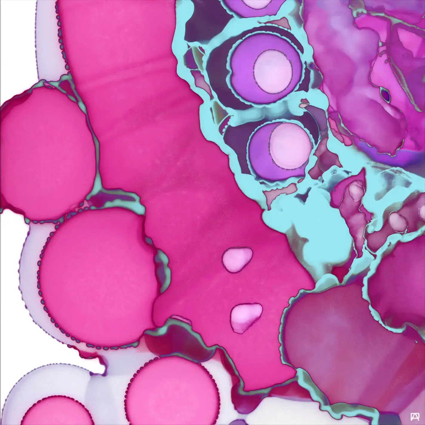 Rounded forms in varying shades of pink, are outlined in a teal-colored border that is vivid and effervescent.