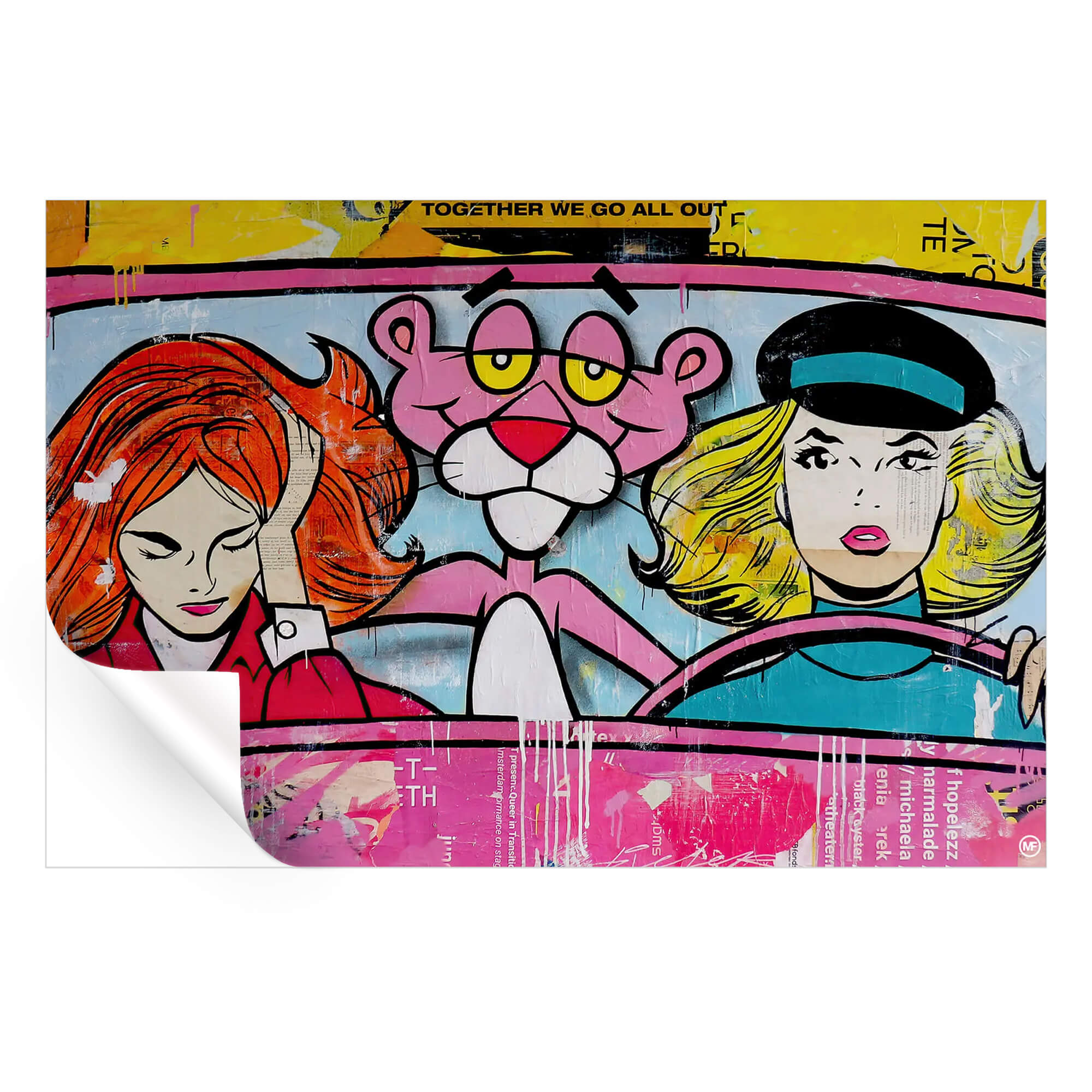 Hit the road with the iconic Pink Panther and two fabulous companions in this playful pop art collage. The artwork captures a sense of motion and adventure, with the Pink Panther in the driver’s seat, flanked by two Barbie figures, each exuding their own style. Vivid colors and graphic lines give a nod to classic comic art, while splatters and text in the background add a contemporary edge.