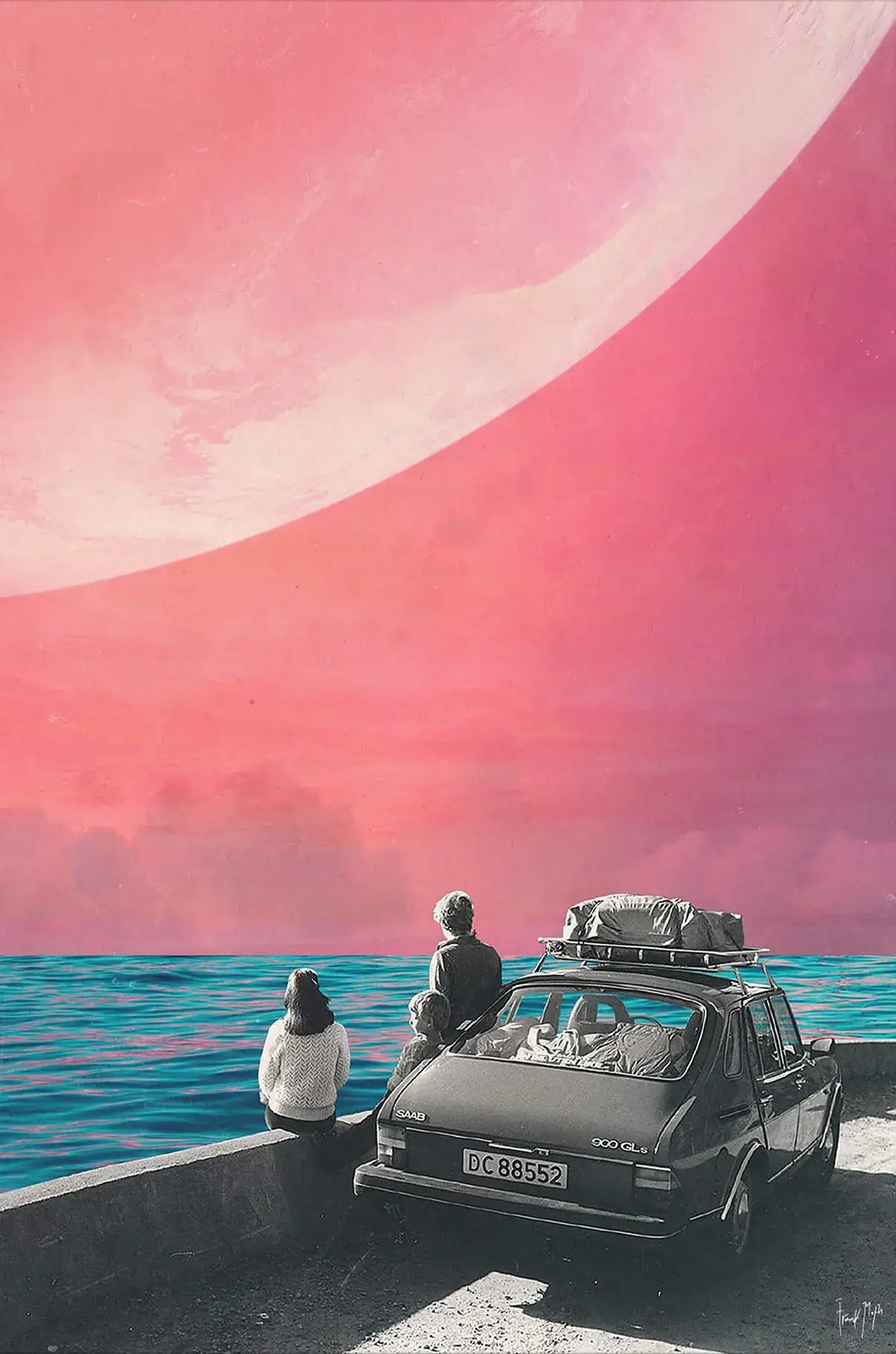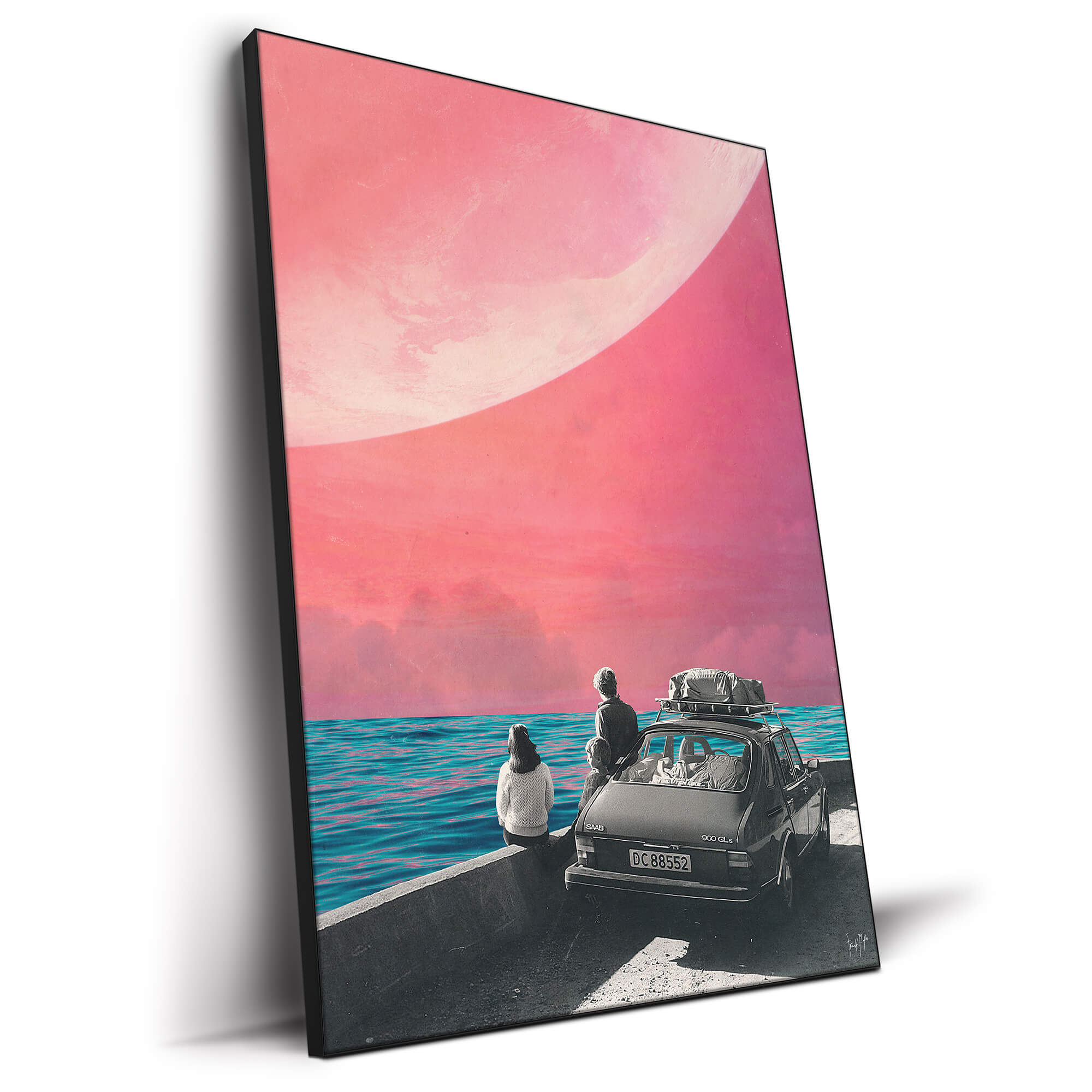 This surreal artwork captures a cinematic moment that feels both nostalgic and otherworldly. Two figures sit beside a vintage car, gazing out over a calm turquoise sea beneath an enormous pink planet that fills the sky. The soft pastel tones and dreamlike composition create a sense of escape—like pausing time in the middle of an impossible adventure.