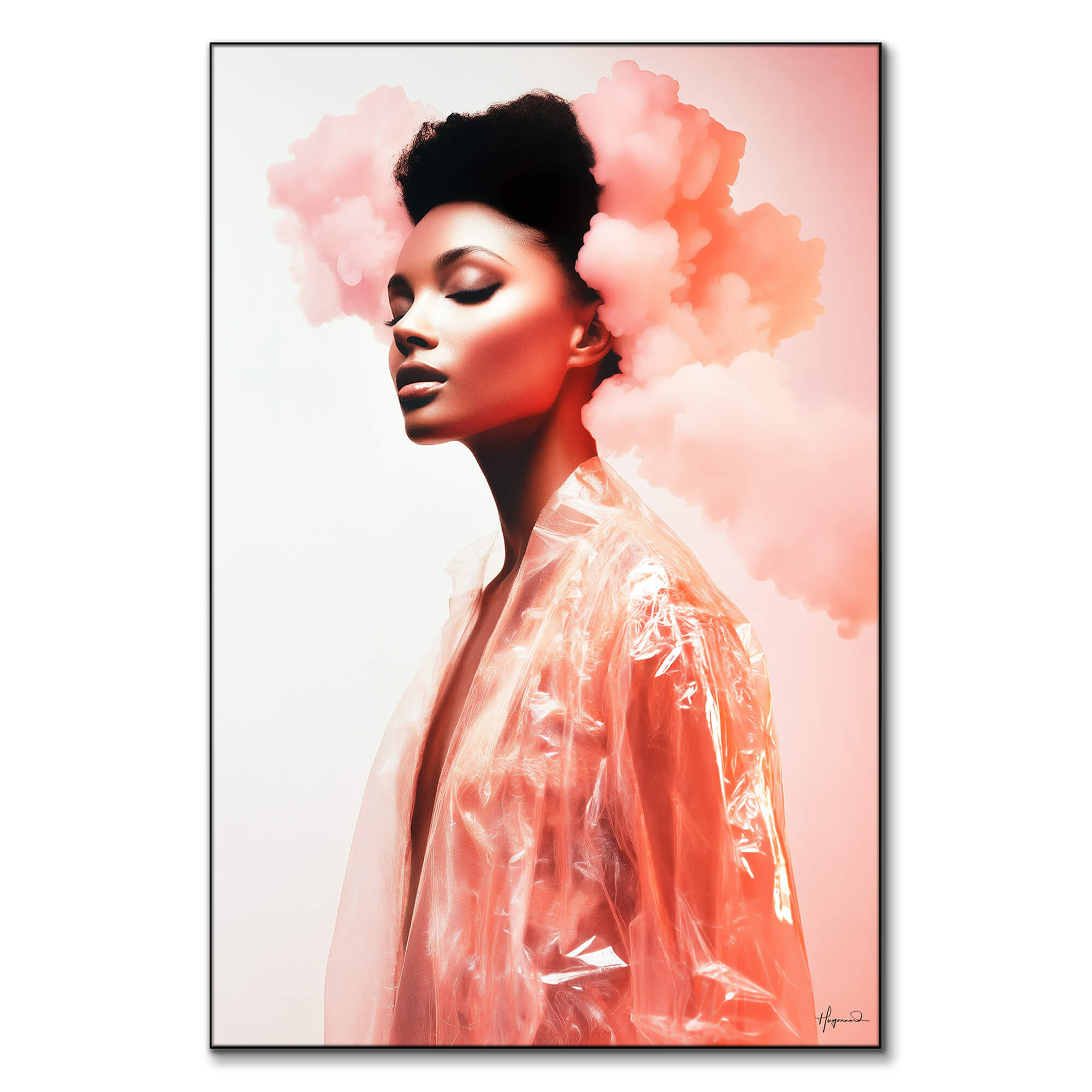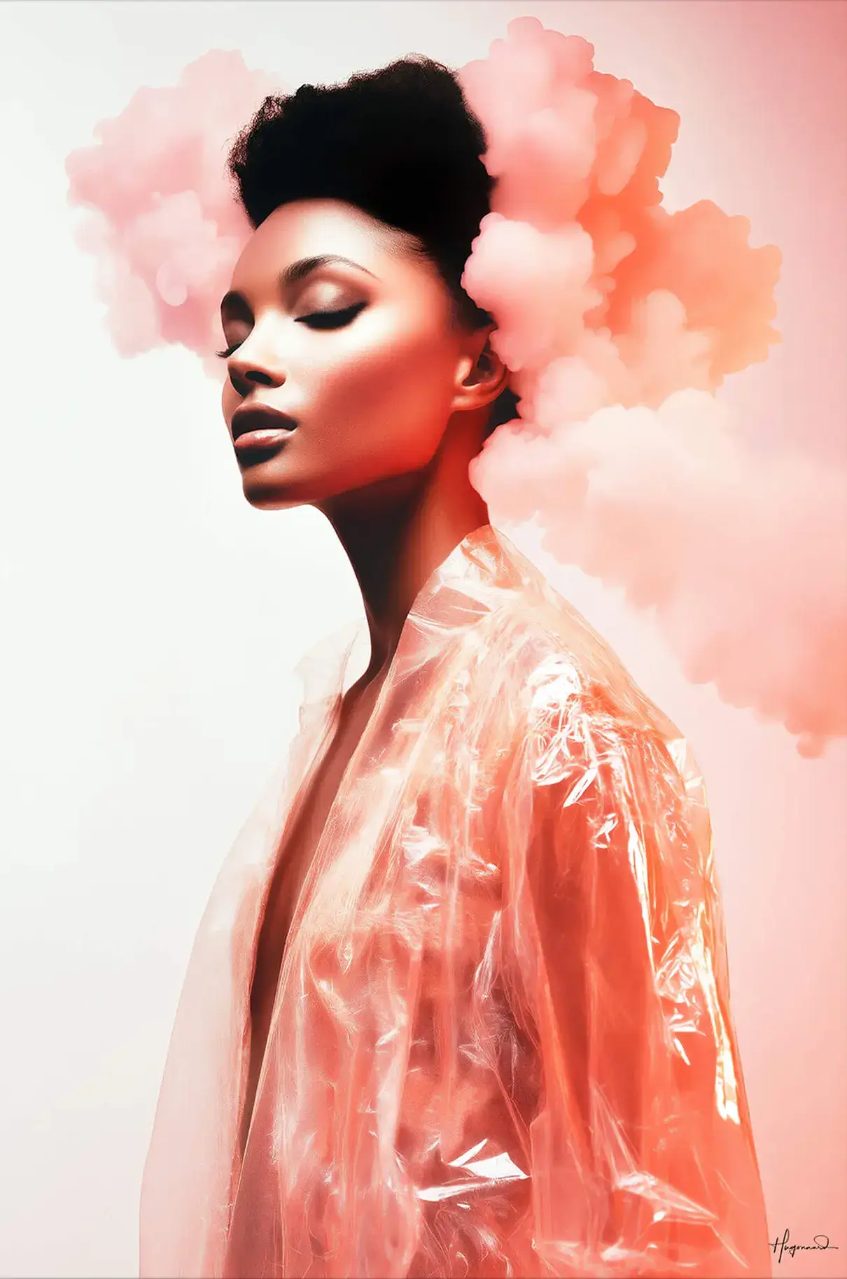 The portrait rises tall and elegant, capturing a side profile bathed in pastel light. Cotton-like clouds in delicate blush drift from the model’s textured hair, merging beauty and dream. A sheer rain slicker glows coral against a clean white background, reflecting subtle highlights. Smooth skin and closed eyes give a sense of quiet confidence. The vertical layout guides the eye from calm face to luminous garment. Soft gradients of pink shift toward warm peach near the edge, creating gentle contrast. Minimal negative space lets the subject breathe. This scene feels like haute couture suspended in a tranquil sky.