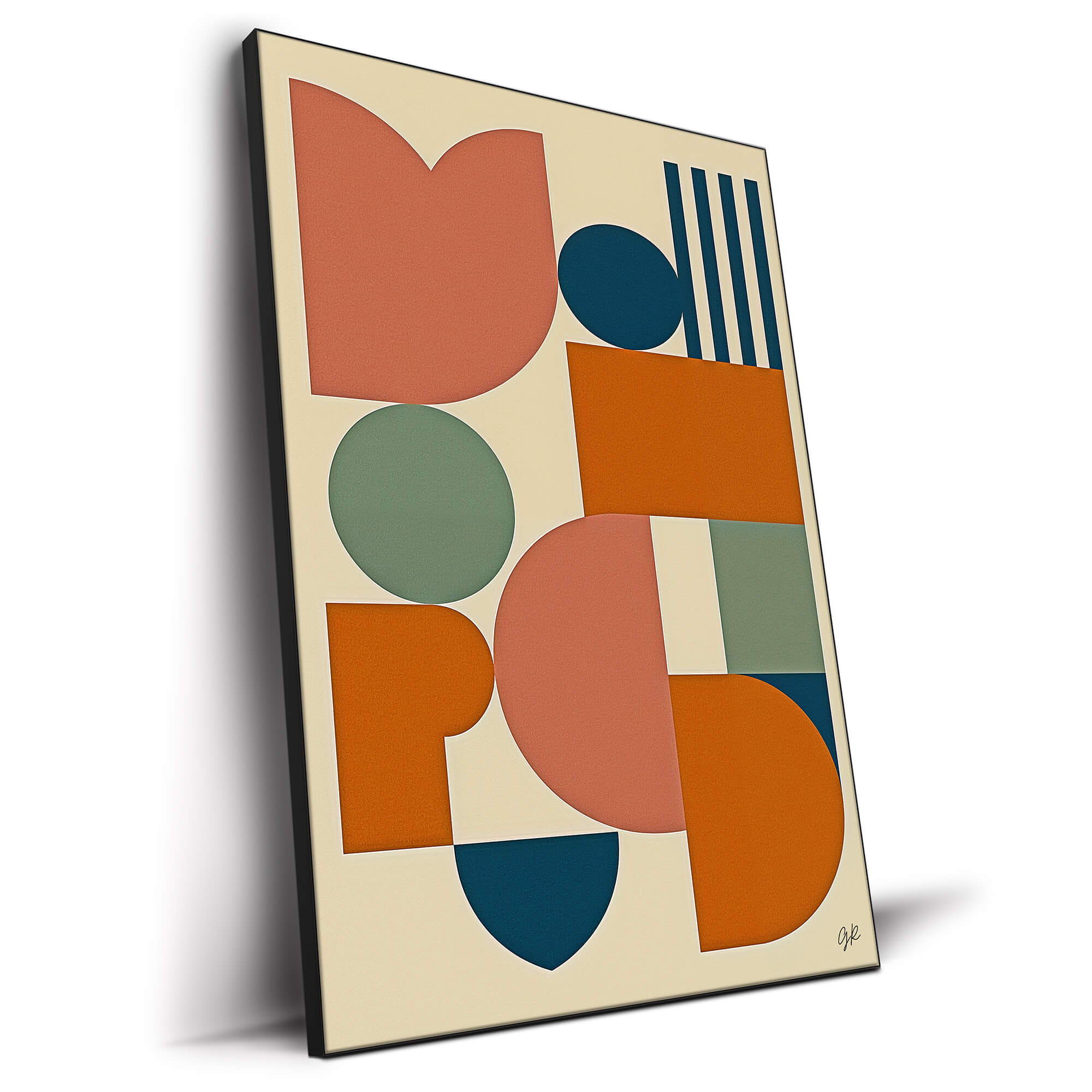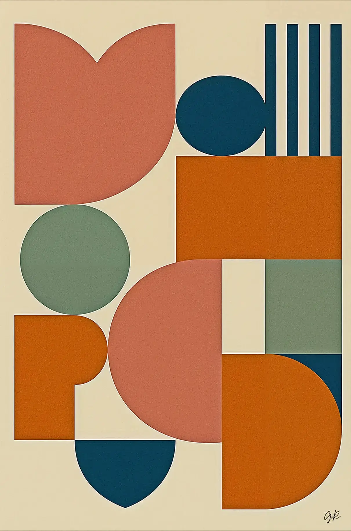 A playful take on geometric abstraction, this piece mixes rounded and angular shapes in warm coral, rust, and deep teal tones. Each form interacts in a layered rhythm, giving the composition an energy that feels modern yet familiar. The clean structure and varied shapes make it visually dynamic while staying approachable and balanced.