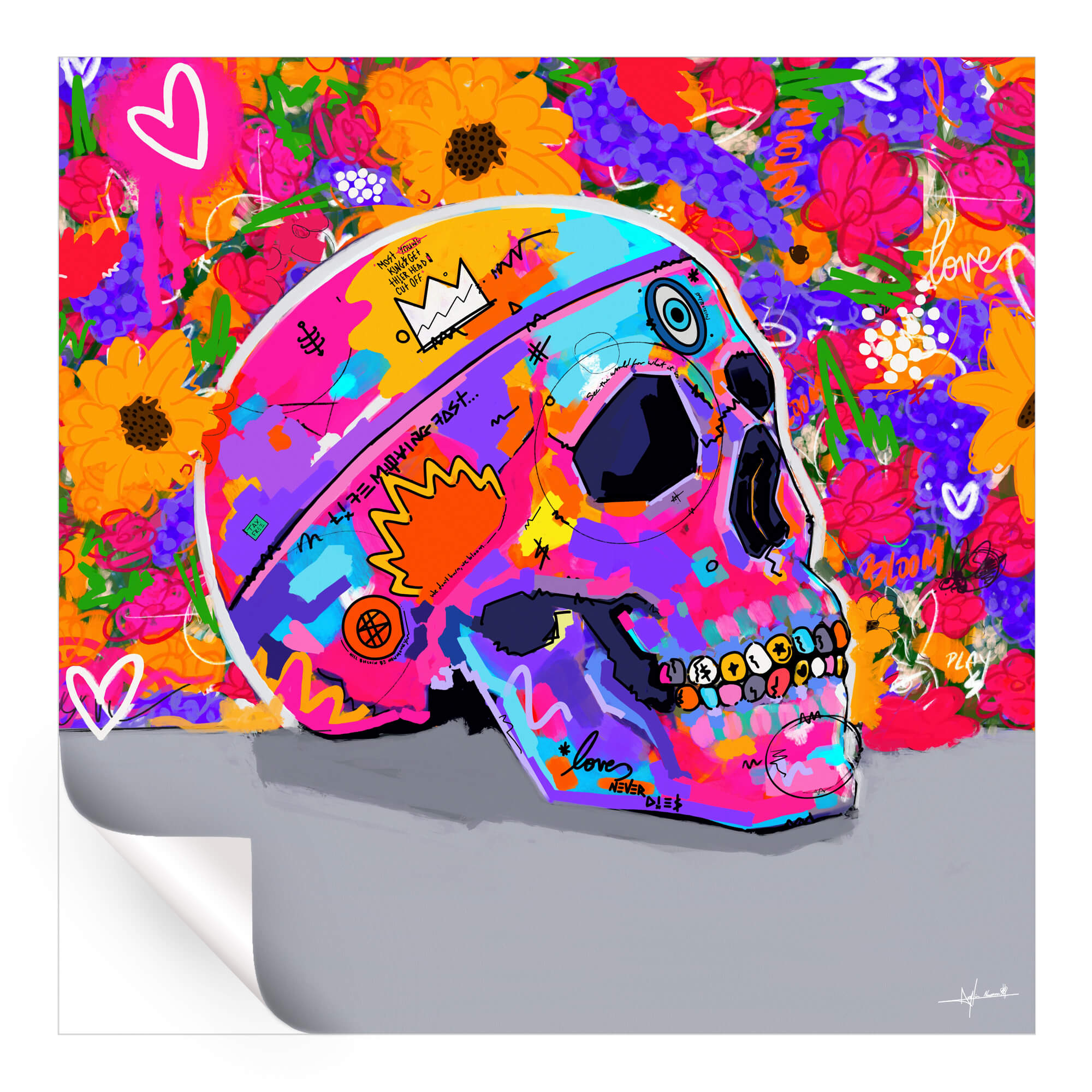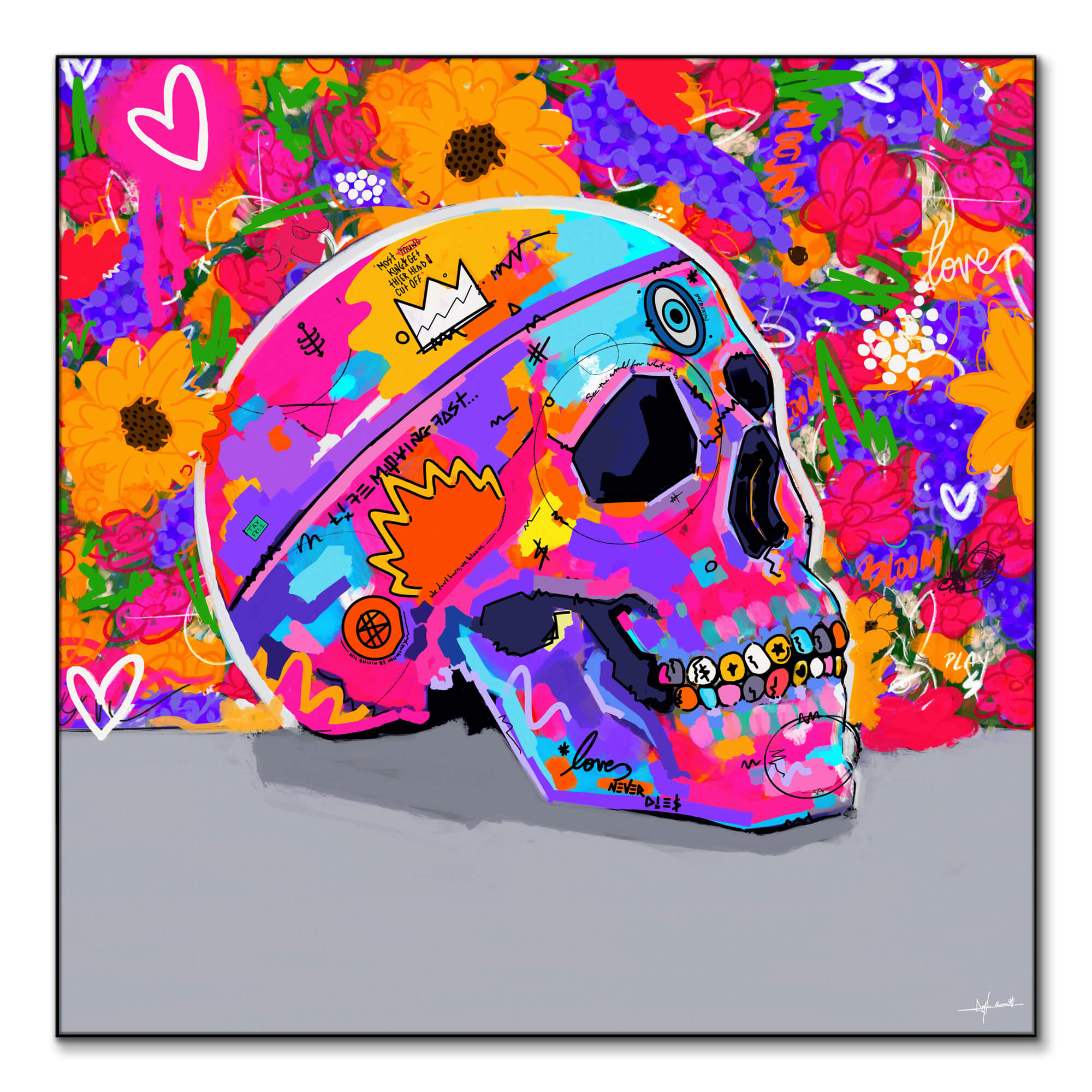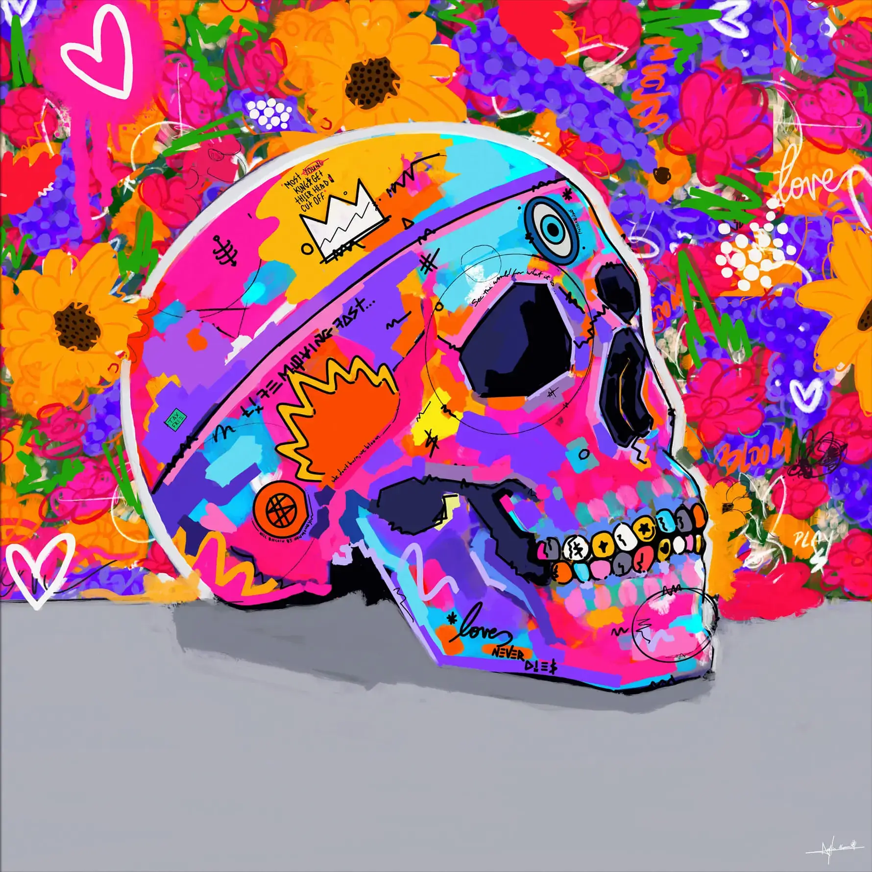 A skull vibrantly decorated with various colorful patterns and pop art elements, juxtaposed against a backdrop of lush, multi-colored flowers. Messages of “Love” and symbols like hearts and peace signs suggest a celebration of life and remembrance, while the graffiti-style details add a contemporary edge to the traditional symbol of mortality.