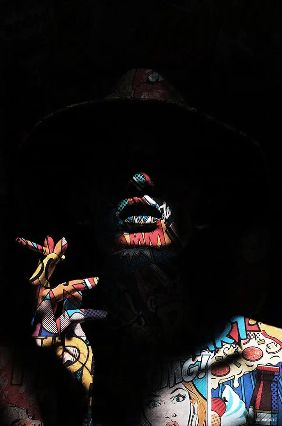 Segments of a form shrouded in darkness are illuminated by colorful, vibrant comic book-style graphics. Imagery of pizzas, ice cream, and wide-eyed characters implemented with sound effect words is reminiscent of the pop art movement.