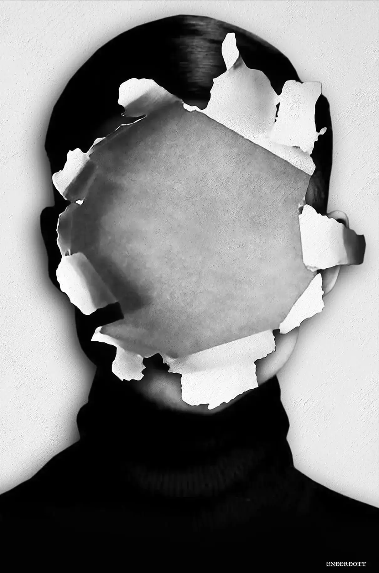 A lone figure stands against a pale wall, hair slicked back, neck wrapped in a dark turtleneck. Light grazes the crown of the head while shadows pool around the collar, intensifying the vertical format. The face is gone, replaced by a jagged hexagon of torn paper that curls forward like peeling bark. Each ripped flap casts soft gray shadows, turning emptiness into texture.