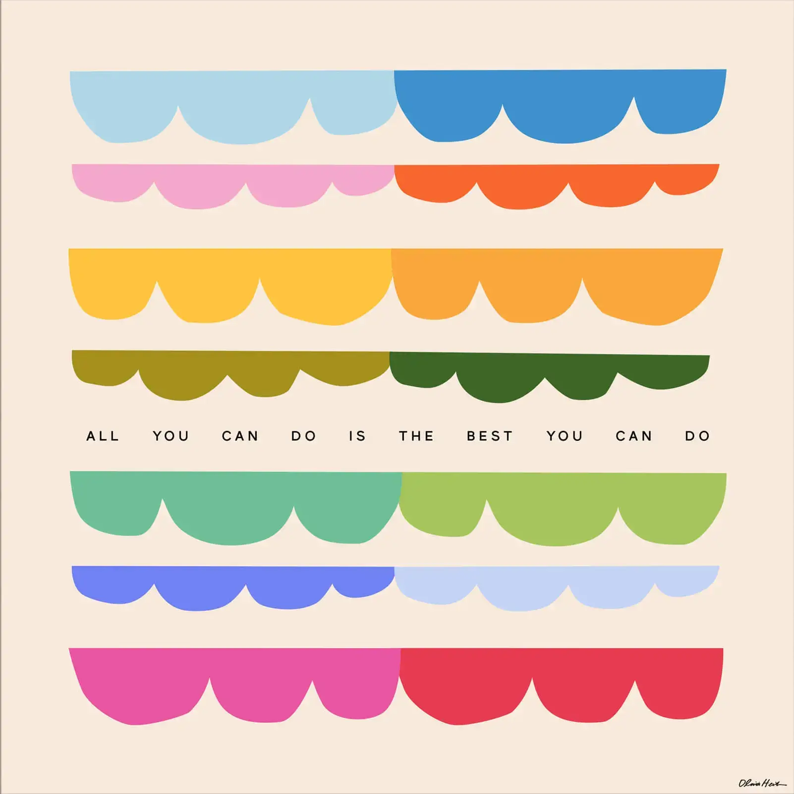 This artwork delivers a positive message through a striking array of scalloped shapes, layered one over the other in a delightful spectrum of colors. Each row of scallops presents a different hue, creating a rainbow effect that is both cheerful and visually satisfying.