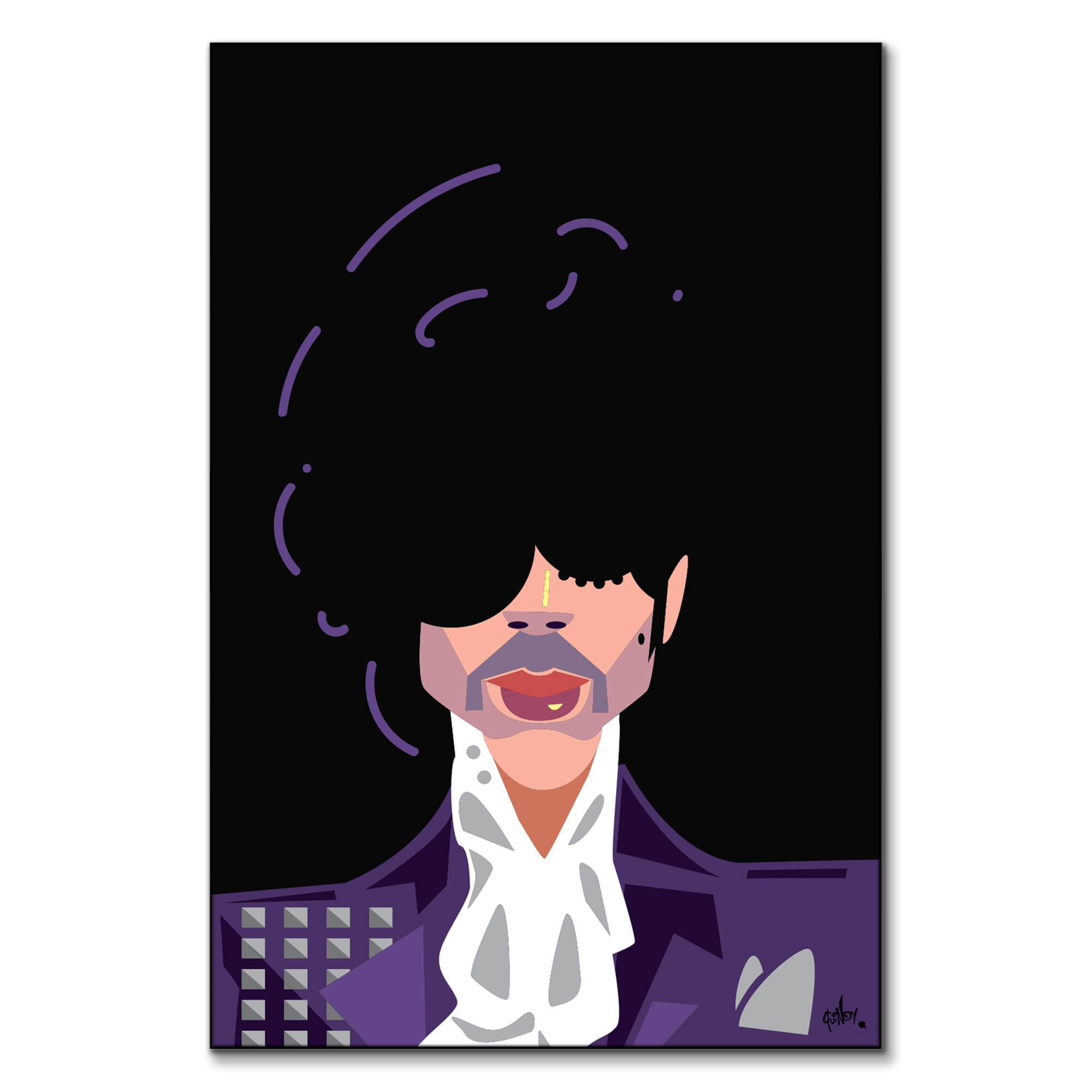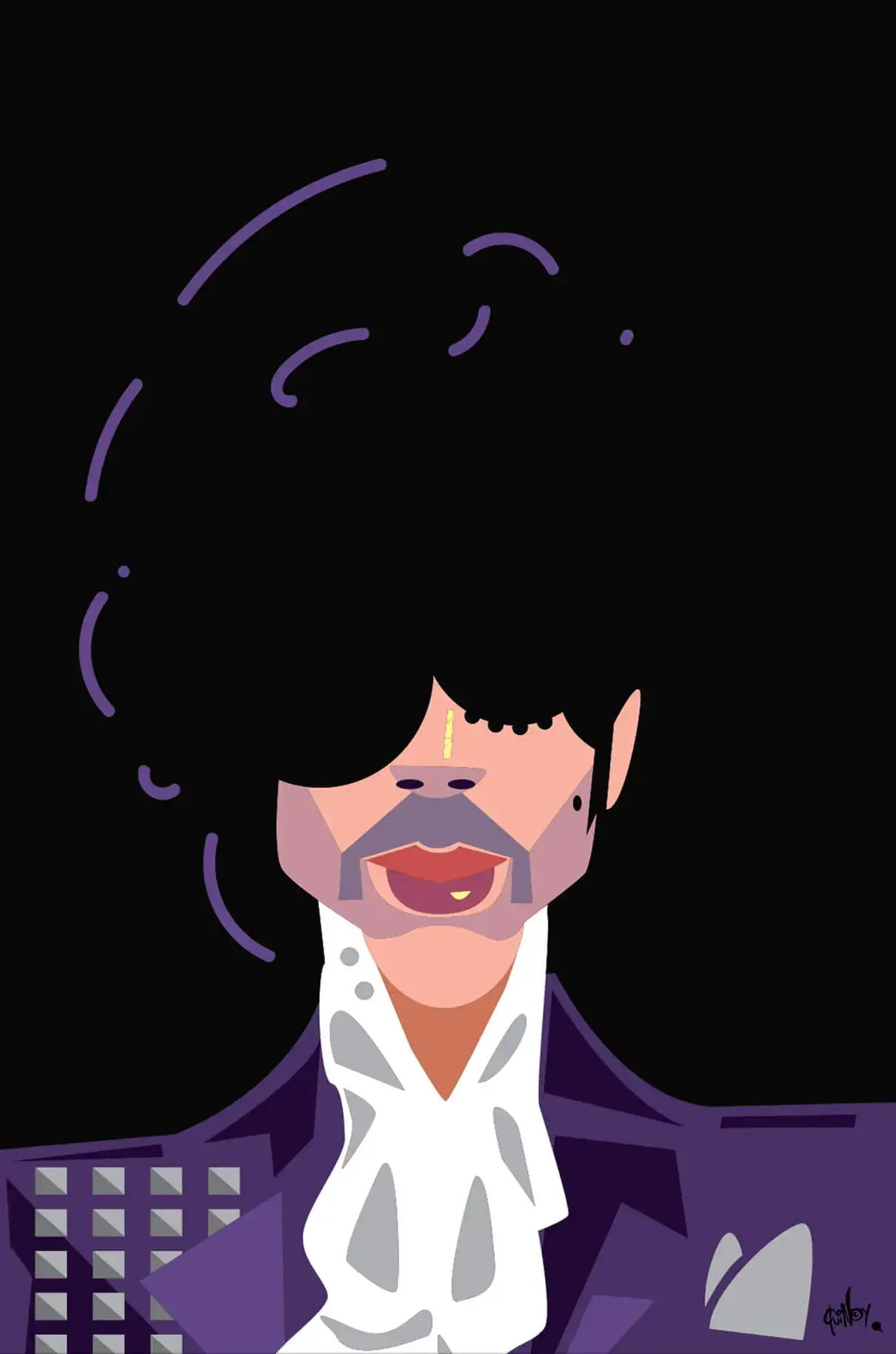 Prince pop portait digitally painted with a voluminous, curly afro set against a dark background, highlighting the silhouette of the hairstyle. The subject wears a purple suit with a ruffled white shirt, reminiscent of a style popular in the 1970s. The artwork is characterized by the use of geometric shapes and a limited color palette, giving it a modern, stylized look. The minimalistic approach captures the essence of the subject with just a few well-placed colors and shapes.