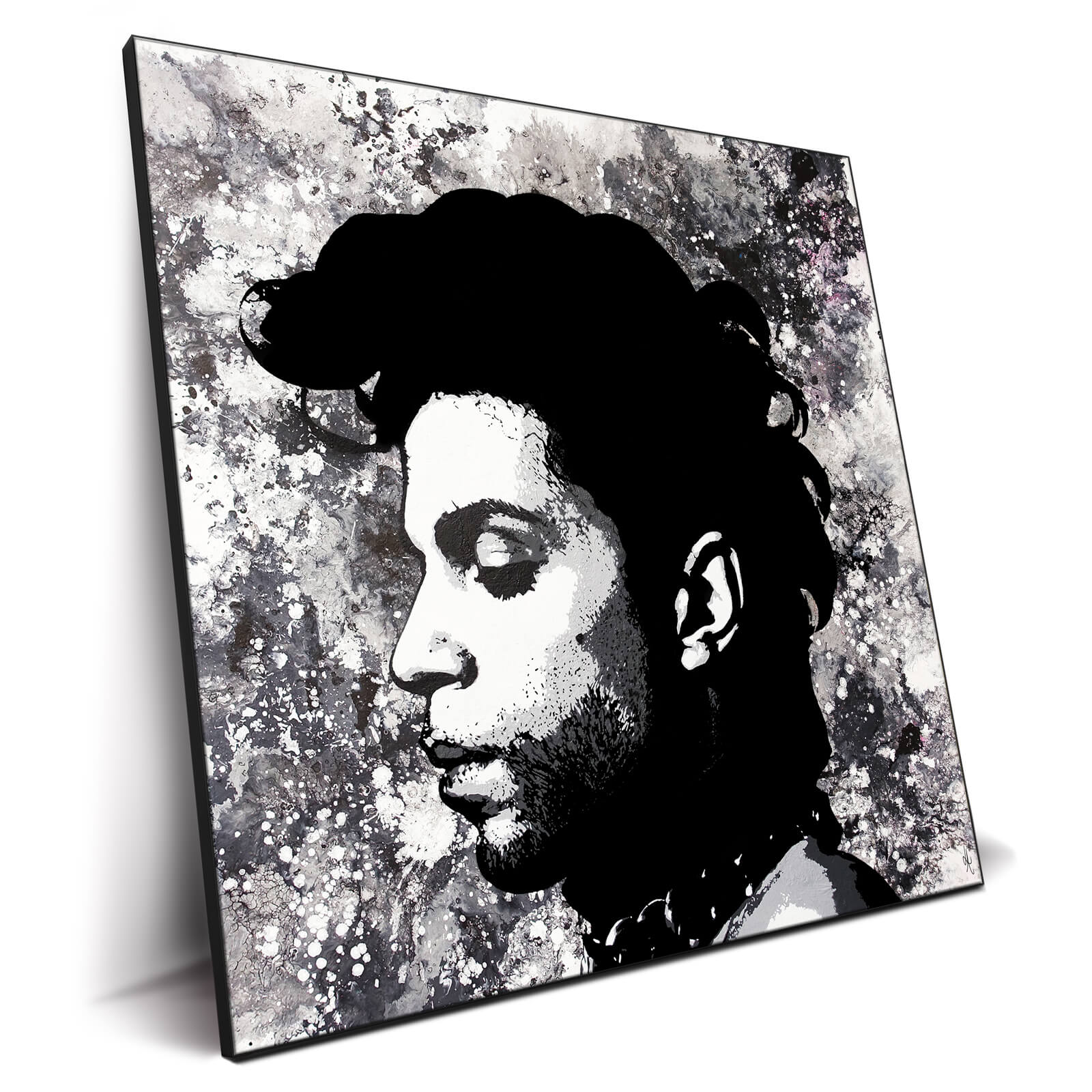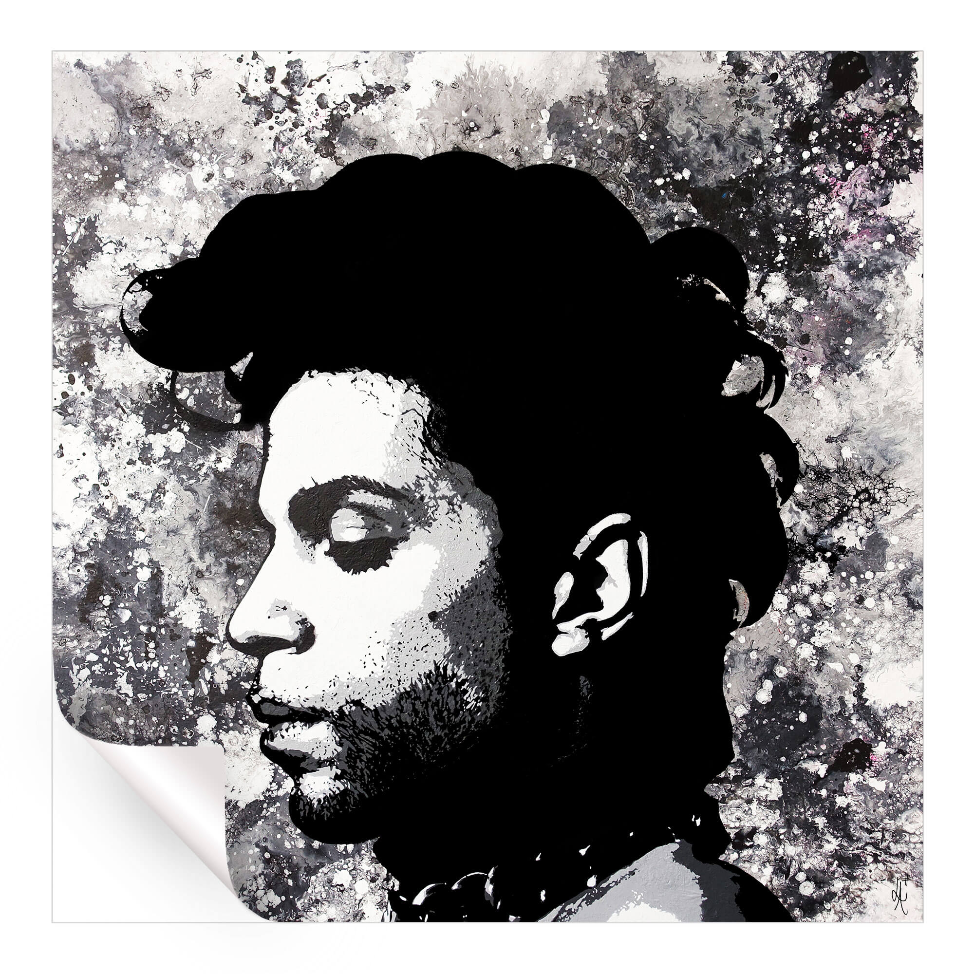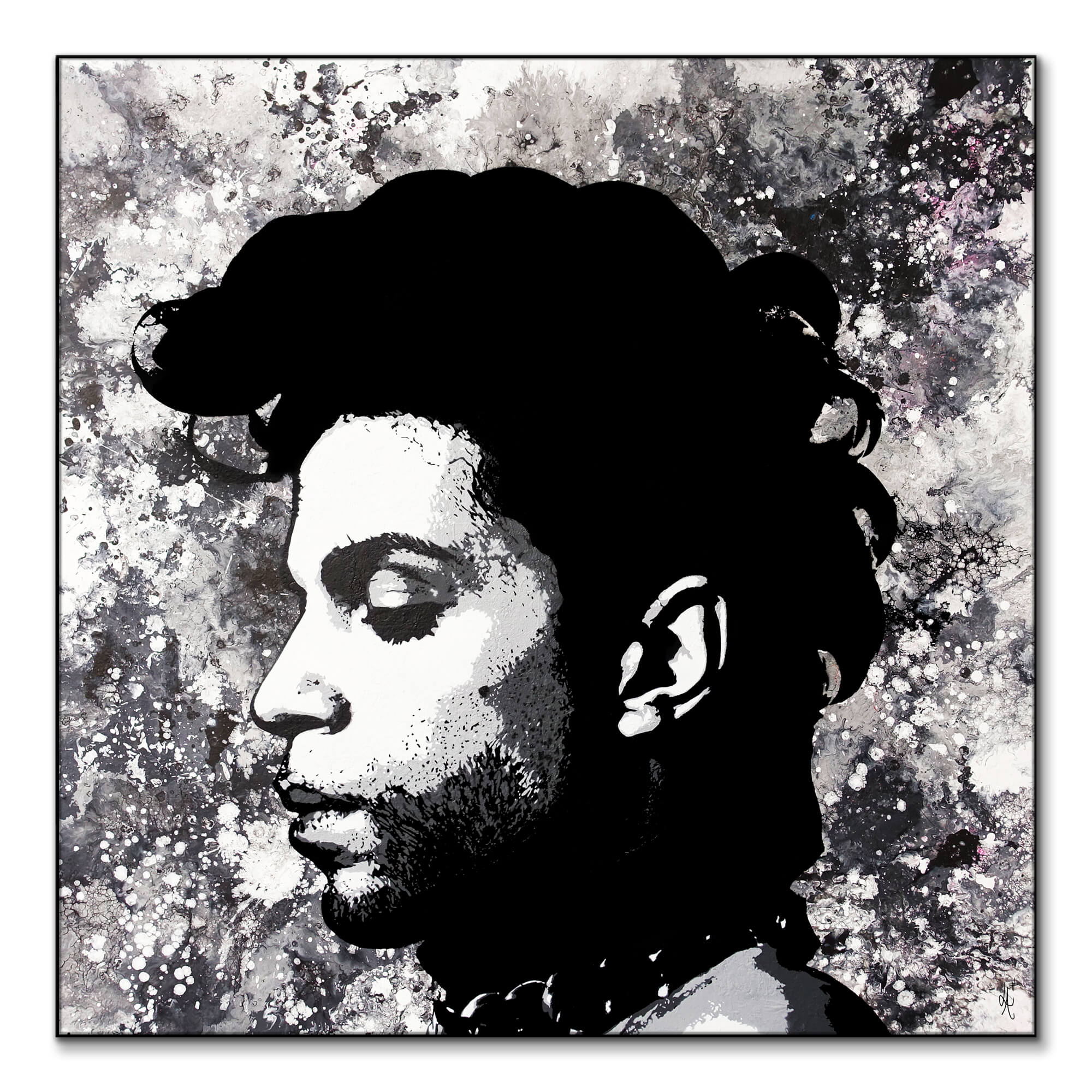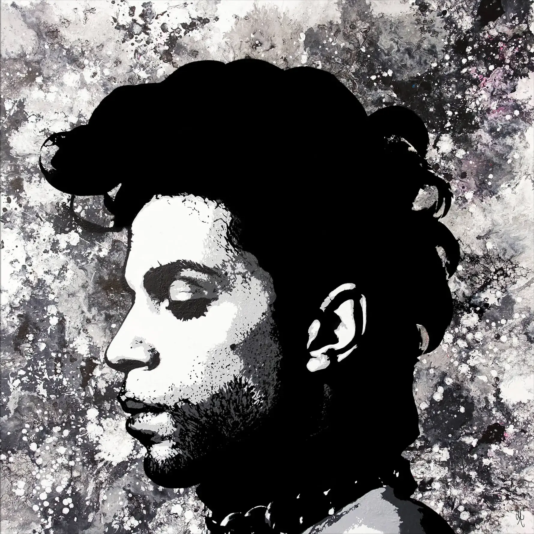 Featured in stark monochrome, the profile of Prince emerges with a contemplative gaze. His features are etched with bold contrasts, set against a mottled backdrop that mimics the starry night sky.
