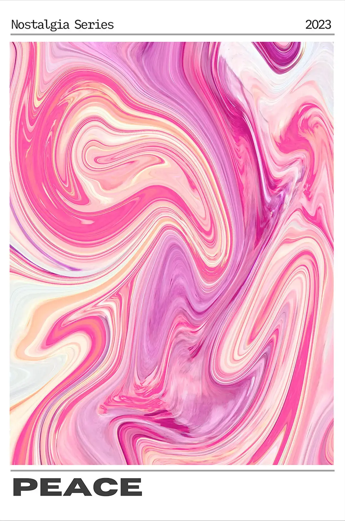 Soft rose, fuchsia, and lavender pigments twist like liquid marble, creating silky ribbons that ripple from corner to corner. Subtle sherbet oranges peek through the folds, adding gentle warmth to the pink spectrum. The fluid motion feels endless, as if the colors are caught in a slow-moving vortex. Thin ivory veils lighten the center, giving the eye places to rest. A crisp white border carries the typeface words Nostalgia Series 2023, grounding the swirling field in time. The lower edge spells PEACE in charcoal gray, balancing the lively palette with a quiet statement.